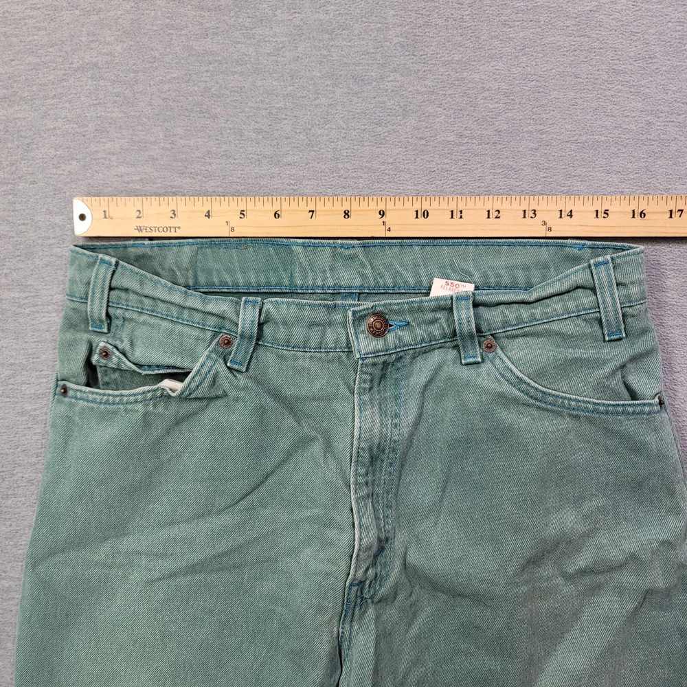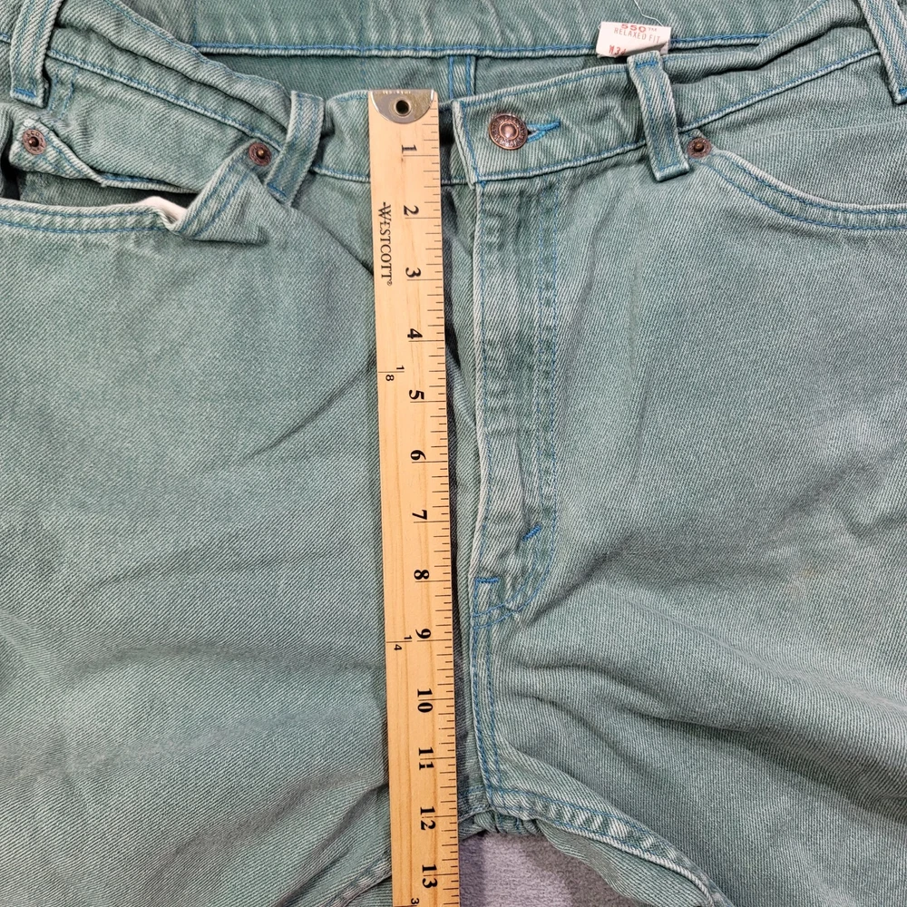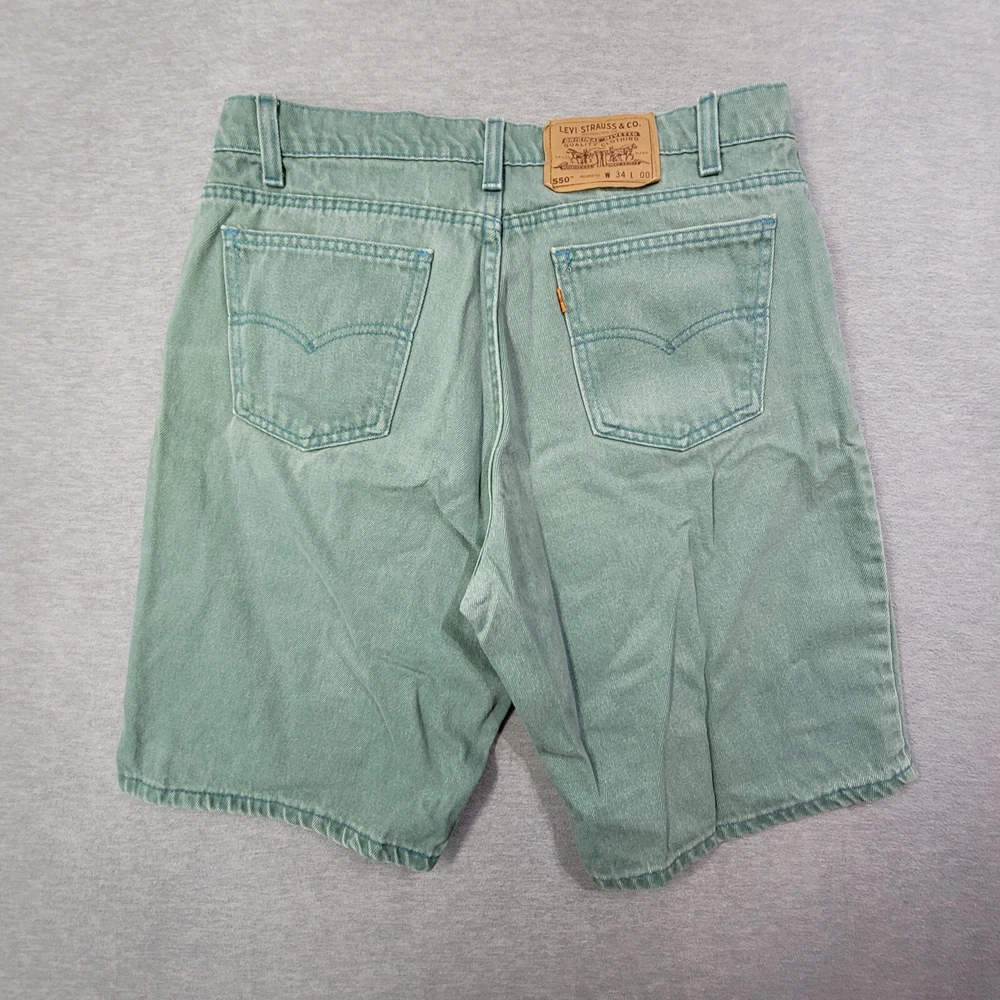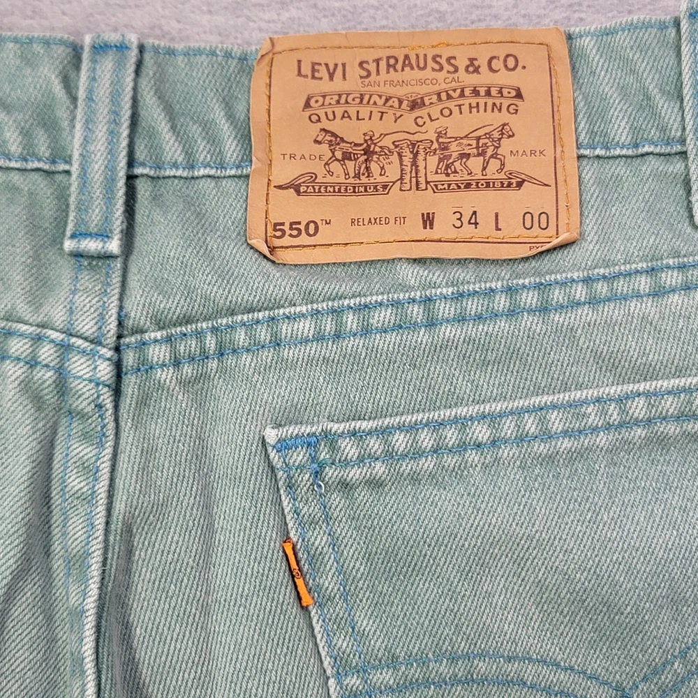 Crafted for comfort and style, these vintage Levi's 550 denim shorts are a classic addition to any wardrobe. With a mid-rise waist and a relaxed fit, they offer a timeless Bermuda style that's ideal for casual outings. The solid green hue is versatile, making these shorts a perfect pairing with a variety of tops and shoes. The durable cotton denim ensures these shorts can endure the rigors of daily wear while maintaining their shape. Equipped with a zip closure and the iconic 5-pocket design, they also feature the sought-after orange tab, confirming their authenticity as a product made in the USA. Size 34 with a 10-inch inseam, they're a staple piece that embodies the essence of American casual fashion.