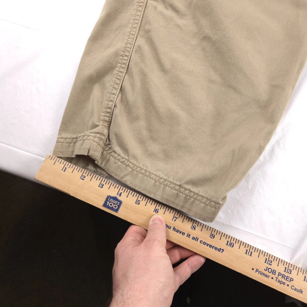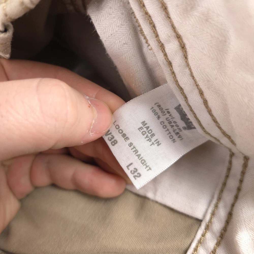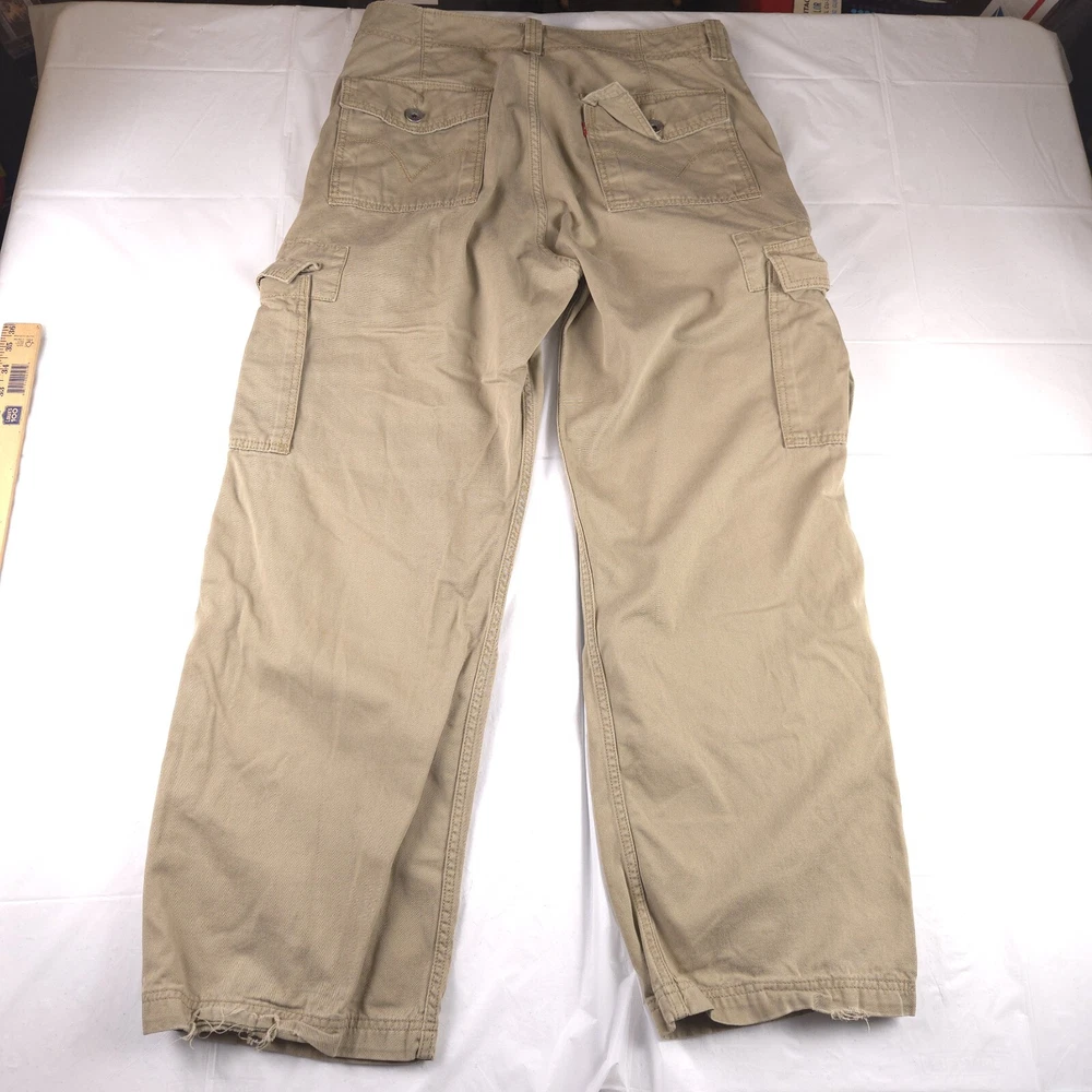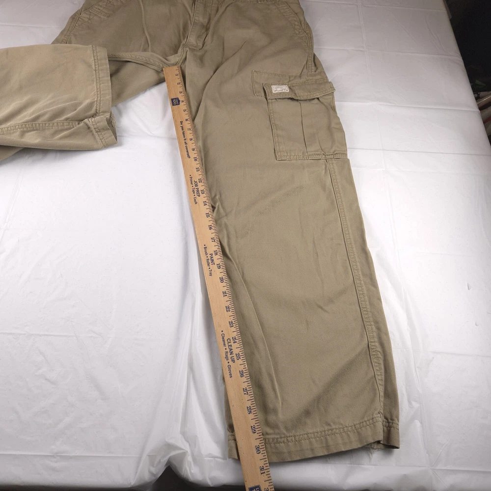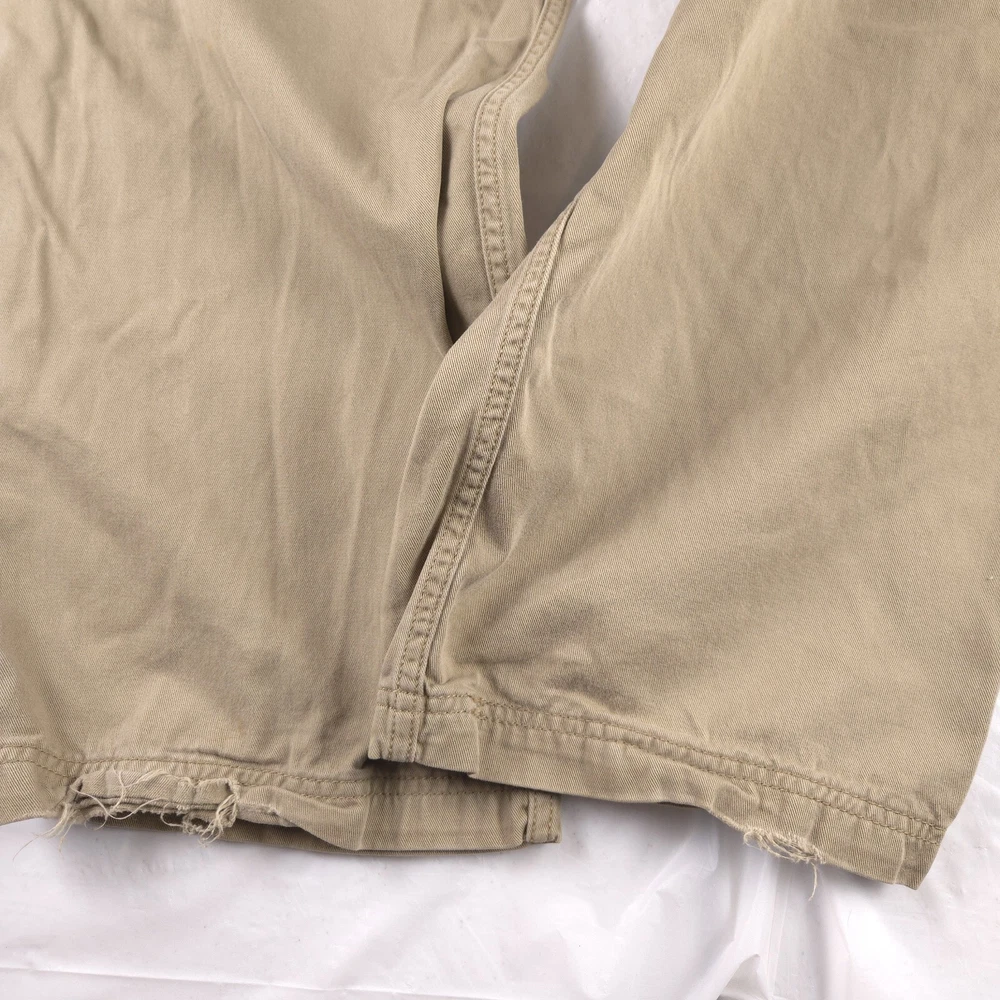 Has stains shown in pics 3 and 6. Has heel drag shown in photo 5. Tagged size 38x32 see photos for measurements to determine proper fit before buying. Thanks.