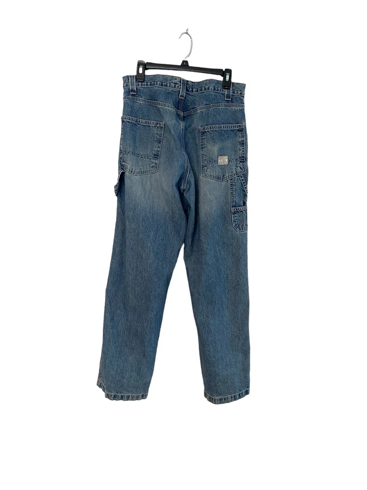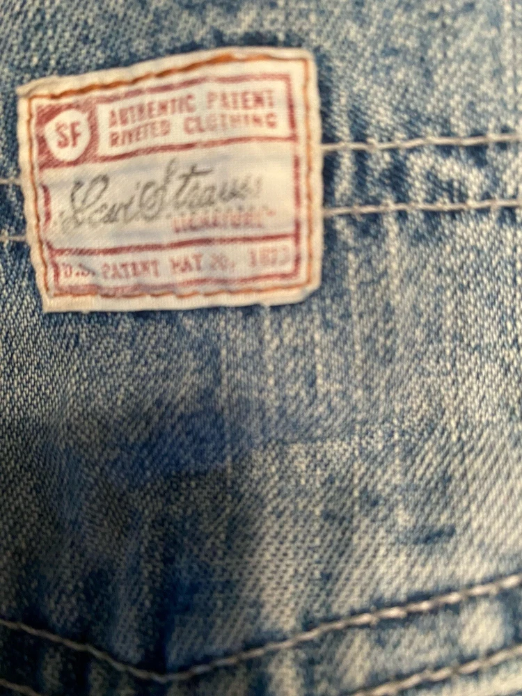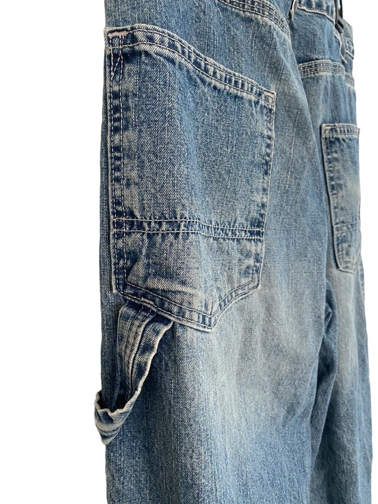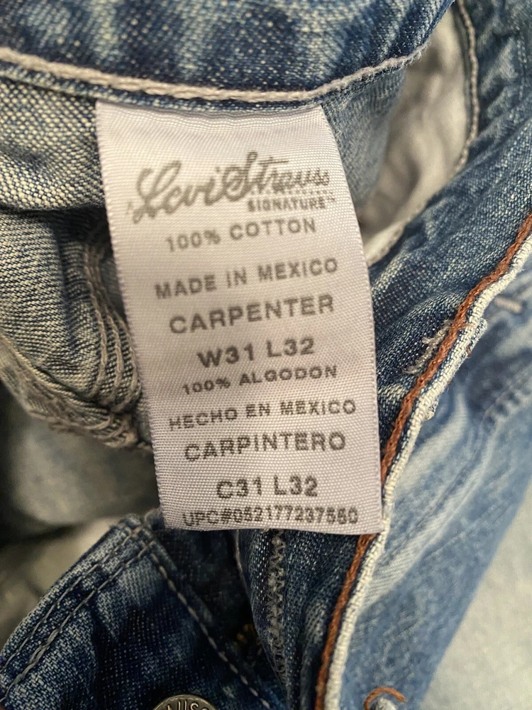 Embrace the vintage look with these Levi's Carpenter Loose Straight Jeans. The blue denim fabric with a medium wash and solid pattern is perfect for any season. The jeans feature a wide-leg style, hammer loop, comfort, and pockets including a carpenter pocket, 5-pocket design, and coin pocket. The button closure and Levi's logo accents add a touch of classic and skate style, making them perfect for any occasion. These jeans are machine washable, have a waist size of 34 inches, and inseam of 31 inches. They are made of 100% cotton and are perfect for men who want a relaxed fit. The Levi's Carpenter Loose Straight Jeans are a must-have for anyone looking for a Y2K, 90s, or hip hop inspired look. There’s slight distressing on the knees small whole in one otherwise good condition not sure if they were made that way or not