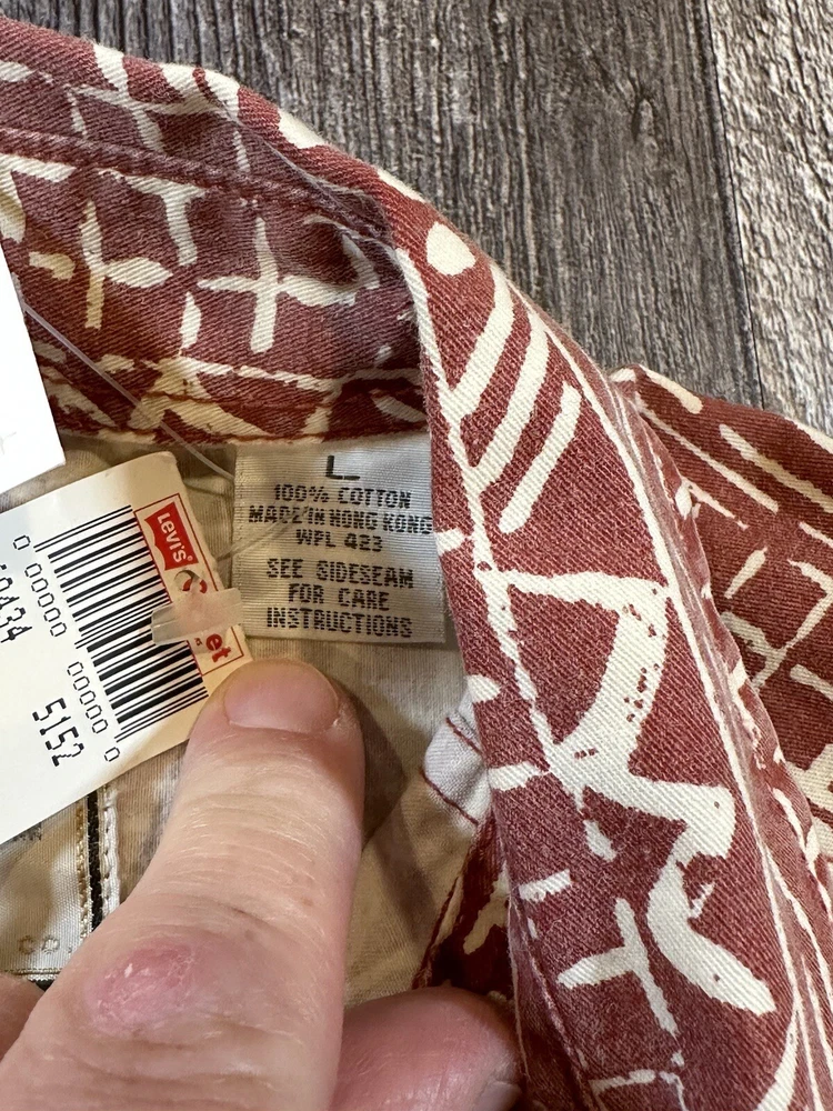 Vintage - New with Tags - Levis Short Sleeve Button Up Shirt - Double Pockets - Silver Tab Colors - Dark Red / White - Geometric Pattern Men's Size L - See pics for measurements. Material - 100% Cotton NOTE: Please see all photos for condition as all flaws will be shown throughout the photos! * COLORS MAY BE DARKER OR LIGHTER OR SLIGHTLY DIFFERENT DUE TO MONITOR/PHONE/TABLET SETTINGS. Please refer to the "condition description" for inspection notes. Actual measurements may differ from the tag due to potential shrinkage, stretching, hemming, or manufacturer error. It is common for pre-owned jeans to shrink or stretch based on how they were washed/dried/worn from previous owners. If measurement differs more than 1.5" either way from what the tag says, I will list the items as actual measurements to ensure proper fit. I recommend measuring yourself before ordering online to help find the perfect fit for you. My shipping discount: $3 shipping on each additional item you add to your order!
