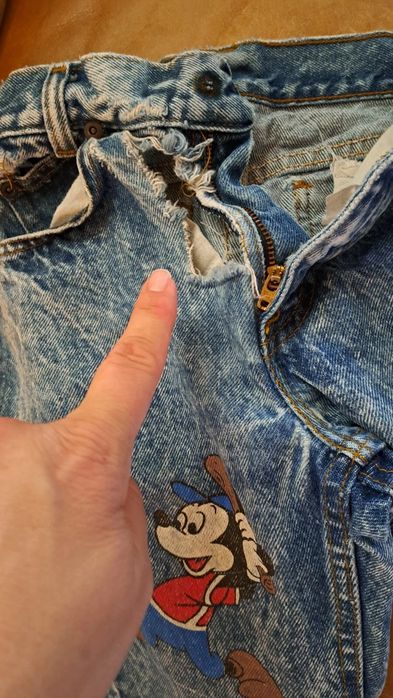 In extremely Preowned condition. This is a vintage pair of Levi's jeans. Mickey hitting a baseball. Size is unknown the tag is very worn, look like it says kids size 10. Not sure though. Measurements are in the pictures. The jeans have multiple rips , holes, button missing. They are definitely a fixer upper pair, or can be used for the mickey emblem, if u want to cut it off and reattach it to something. Also a work or play pair of jeans. The Levi tag is no longer attached. I have it in a zip lock bag. It is ripped, torn and pieces have come off. All I could salvage of it is in the zip lock. Shipped with USPS Parcel select ground.