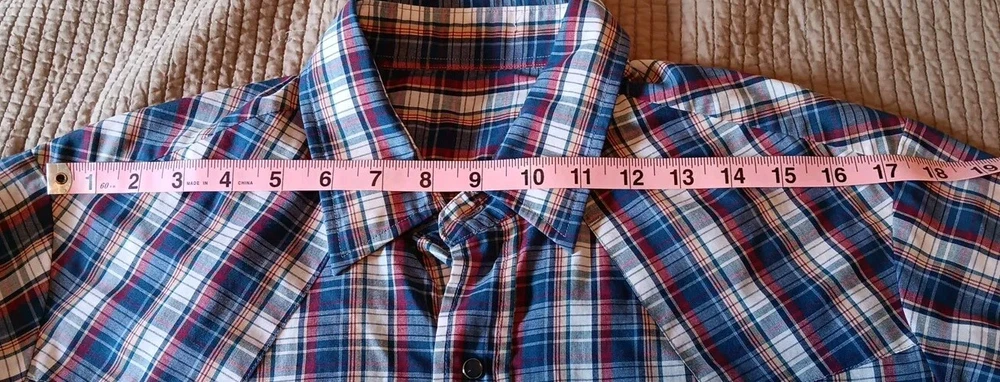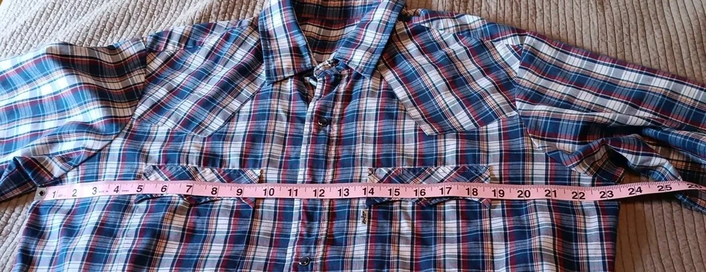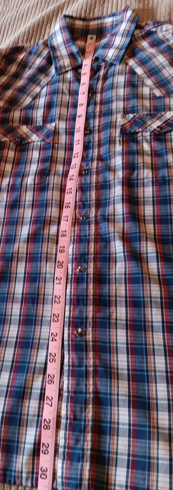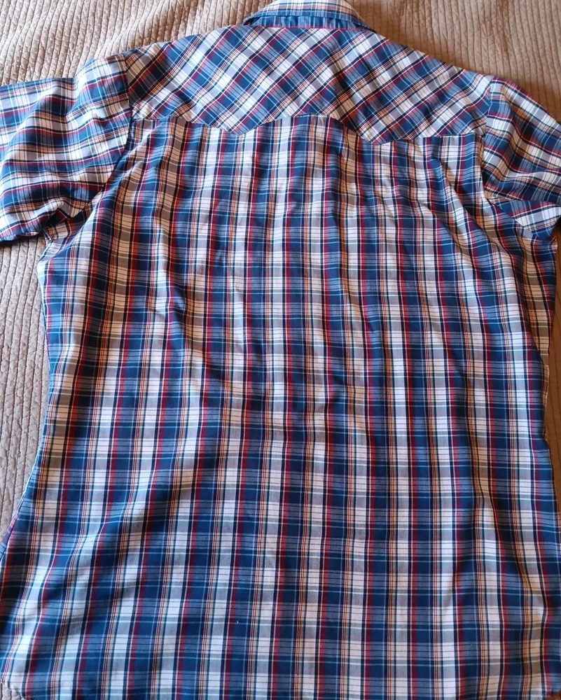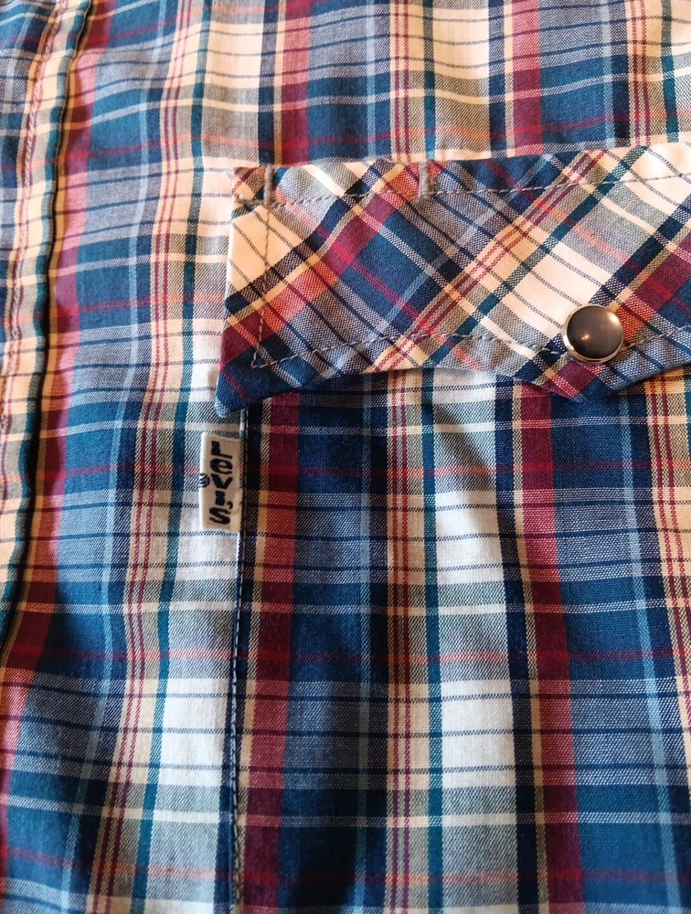Nice vintage blue with red plaid Levi's short sleeve shirt. It has pretty blue pearlized buttons and yokes on the front and back. It's very lightweight, soft fabric and easy care. The care instructions have been washed away, but I machine washed and put in the dryer, and it did fine. It also looks good without ironing. The size is also missing. Please see the measurements in the photos. I believe it to be a vintage Large but more of a modern medium. Again, please see photos as the size is gone.