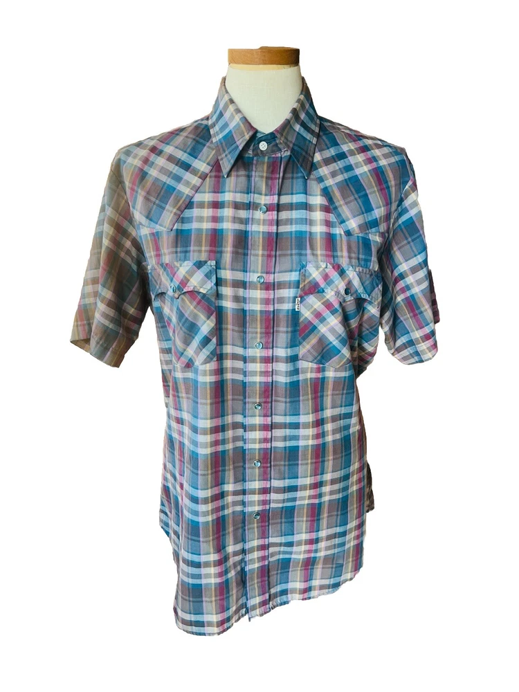 Vintage Levis Shirt Adult S Plaid Short Sleeve Pearl Snap Button Up Mens Western. In good used condition.