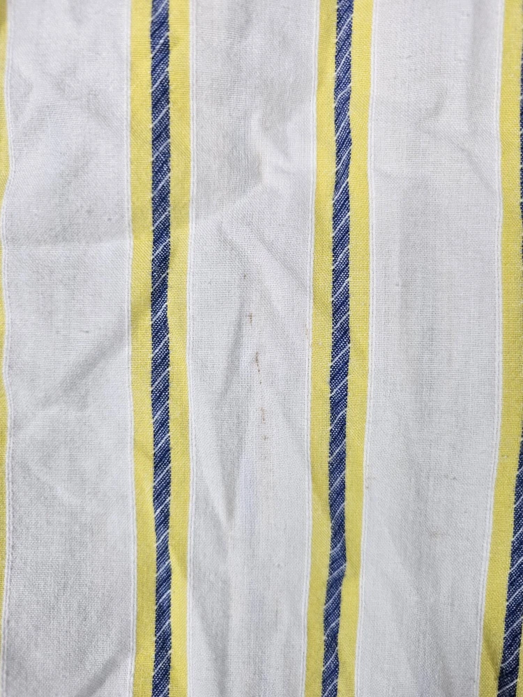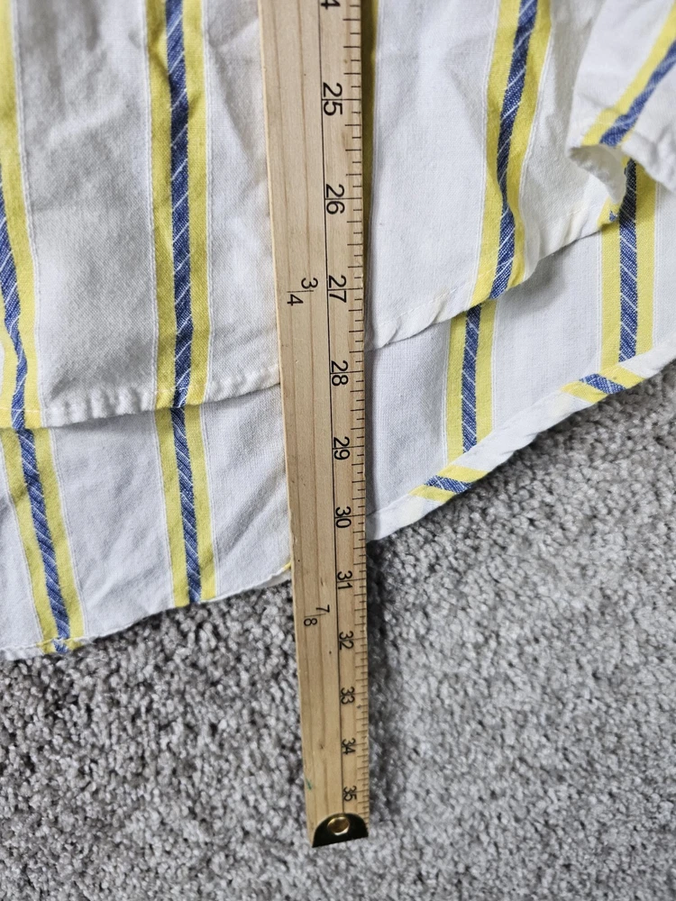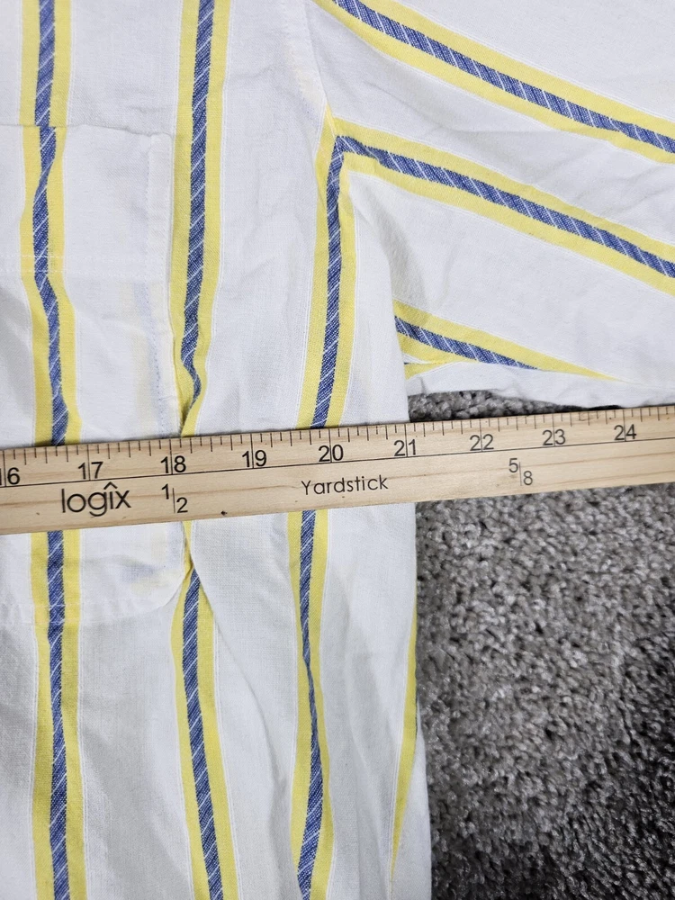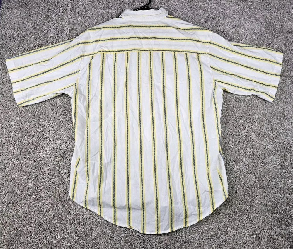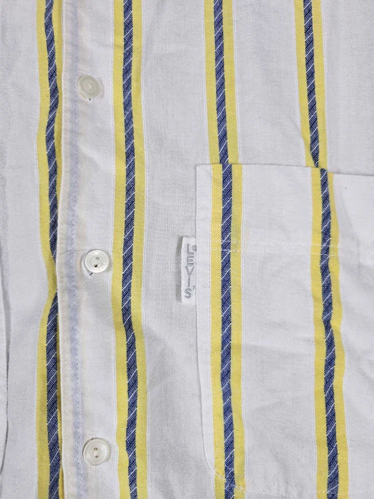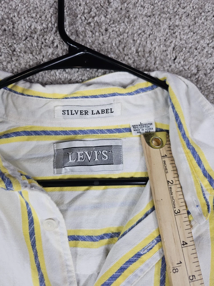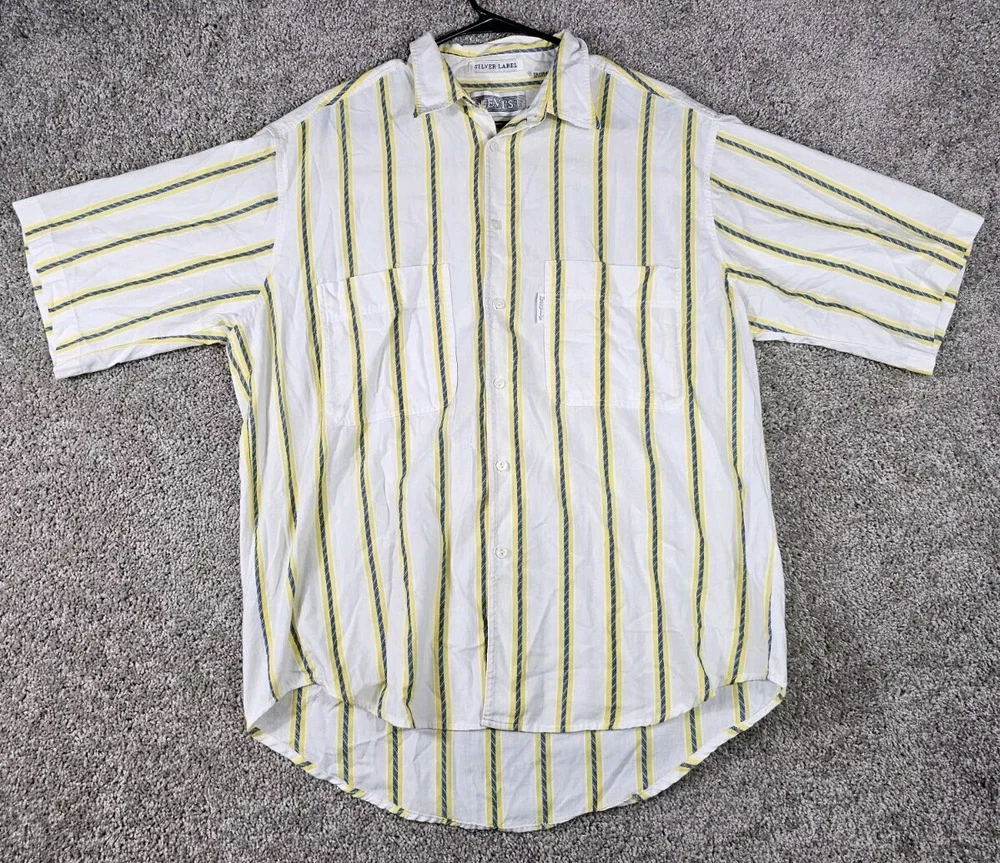 Vintage Levis Silver Label Striped Short Sleeve Button Up Shirt White Size Large Preowned Condition This vintage Levi's button-up shirt features a silver character on a white and striped cotton blend material. The short sleeve shirt has a collared neckline and button closure with pockets on the front. It comes in size L and is machine washable for easy care. The shirt is perfect for a casual occasion and has a regular fit suitable for all seasons. The retro 90s theme makes it a unique piece for any collection.