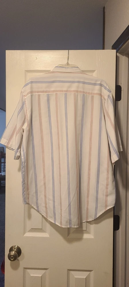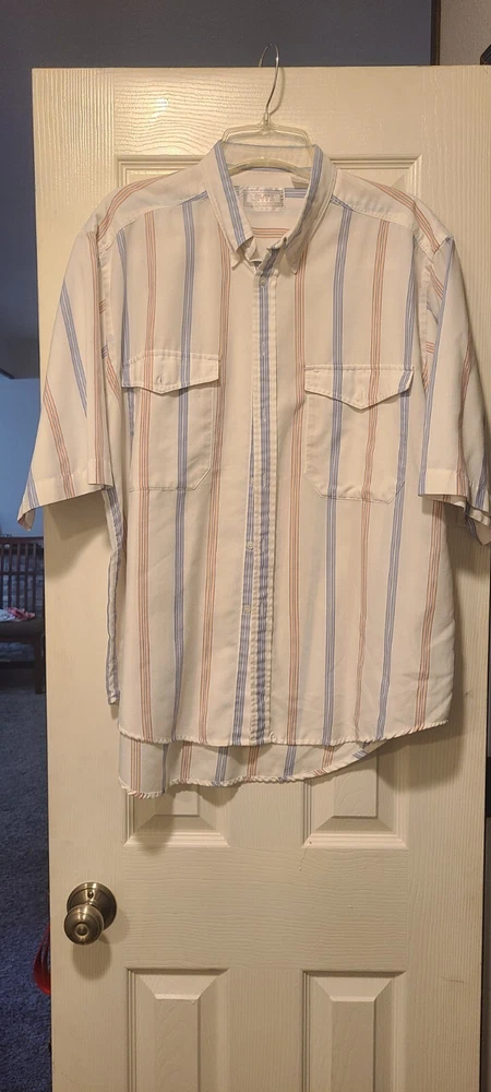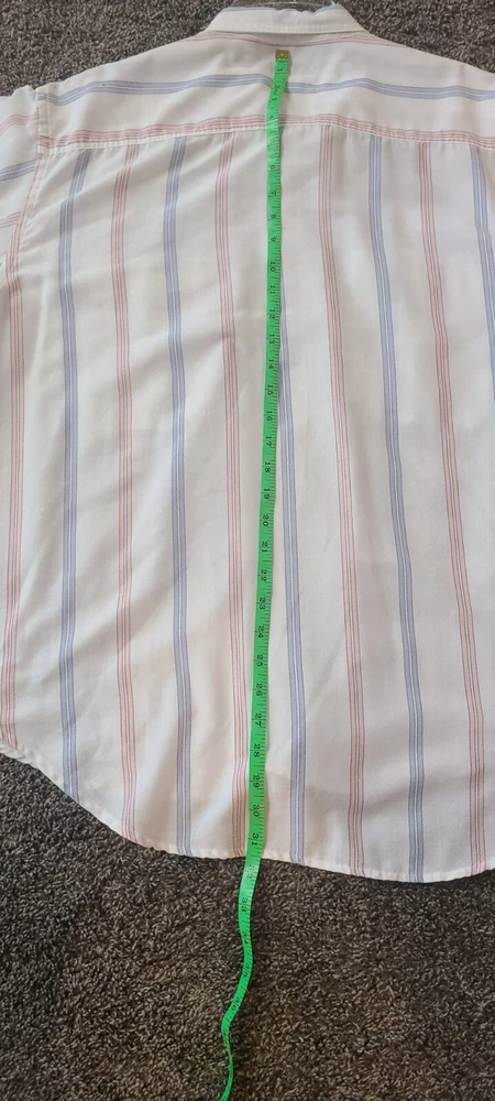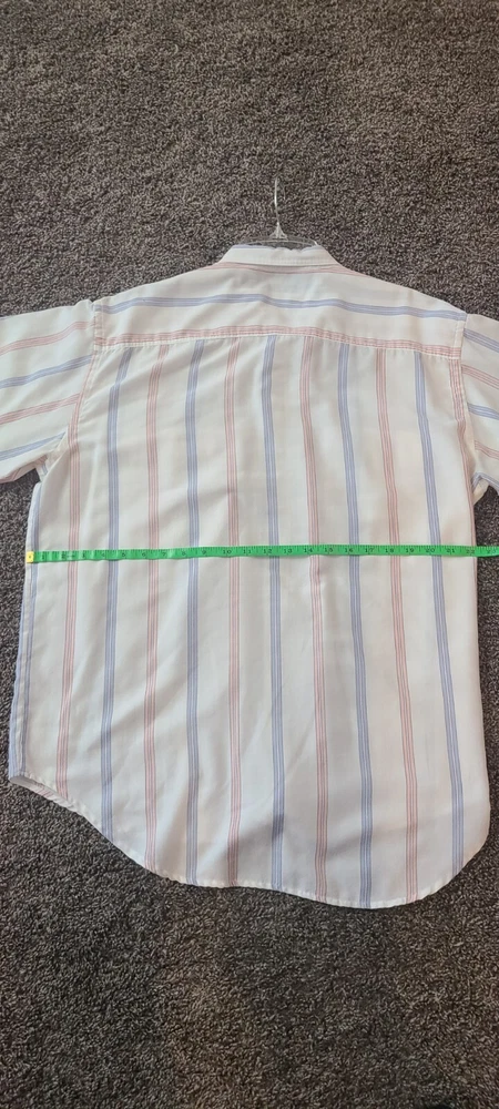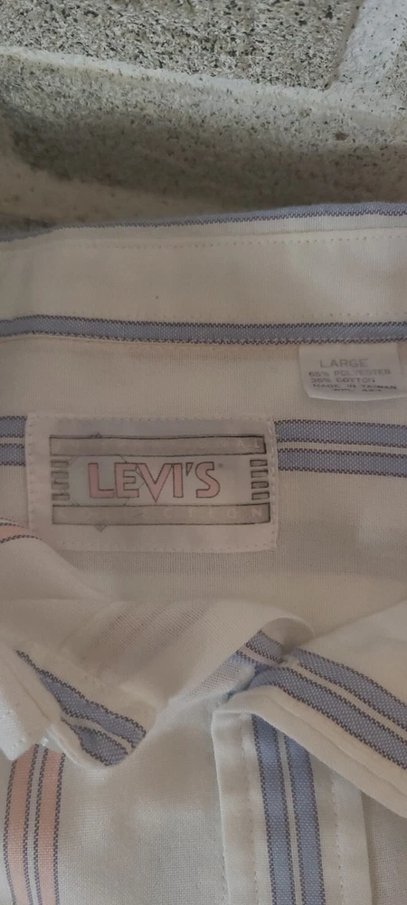 This vintage Levi's shirt is a must-have for any fashion-forward man. The multicolored stripes and 90s theme make it a unique addition to your wardrobe. With a button-up closure and short sleeves, it's perfect for casual occasions. The shirt is made from high-quality materials and is in great shape for its age. It's a size Large and will fit regular size types. Add this Levi's shirt to your collection today!