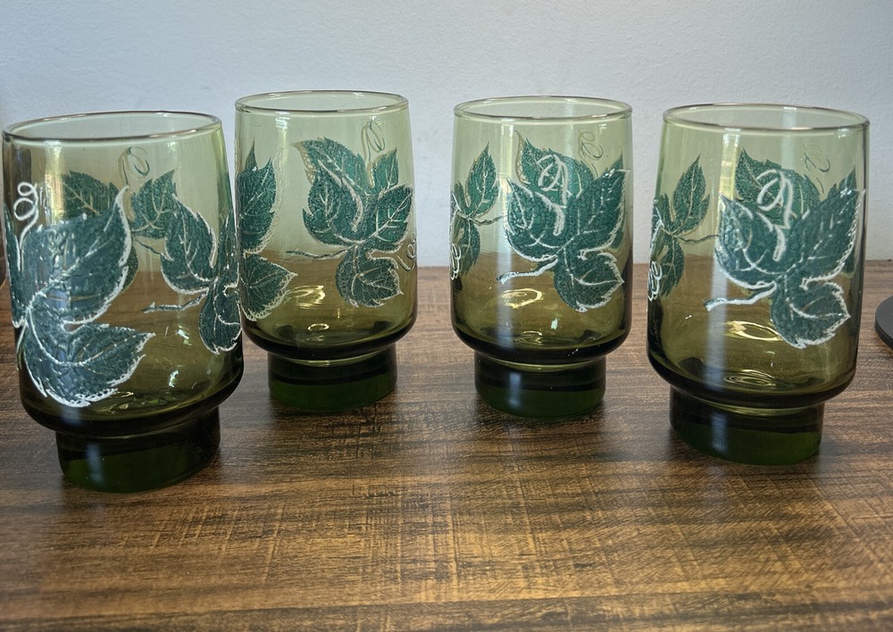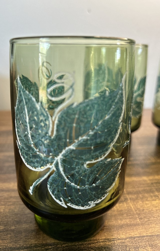 This set of four tumbler glasses from Libbey features a beautiful ivy pattern in a glossy green finish. The glasses have a 10 oz capacity to the rim and a height of 4.75". They are perfect for all occasions and have a mid-century modern style that will complement any decor. The glasses are made of high-quality glass using a fused glass technique and were produced in the United States in the 1970s. Each glass has an impressed backstamp and is stackable for easy storage. Add these unique glasses to your drinkware collection today! One glass has a lil paint splatter in production, otherwise perfect condition!!