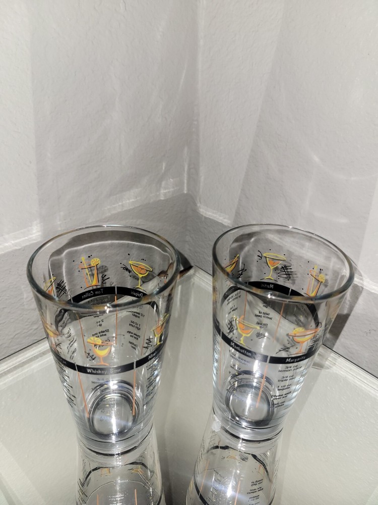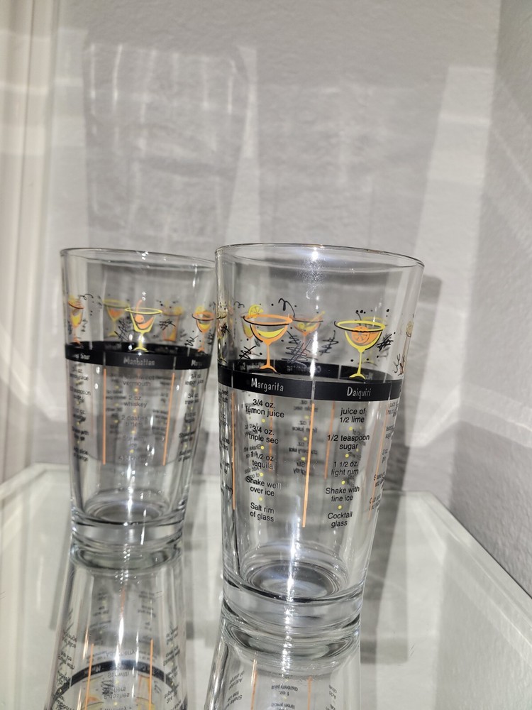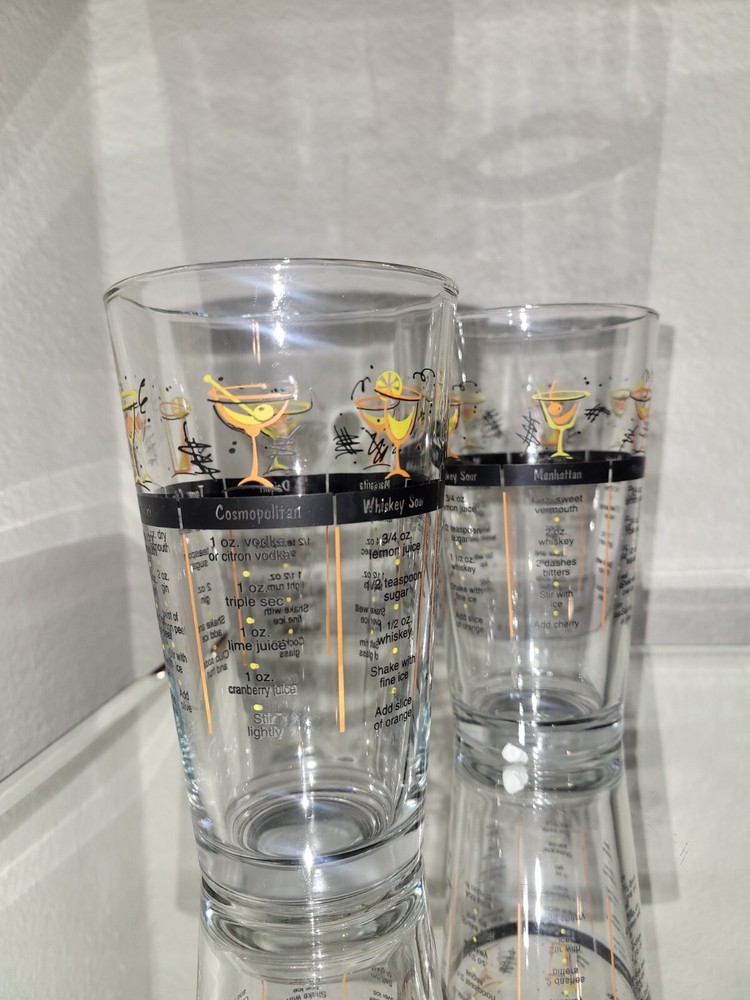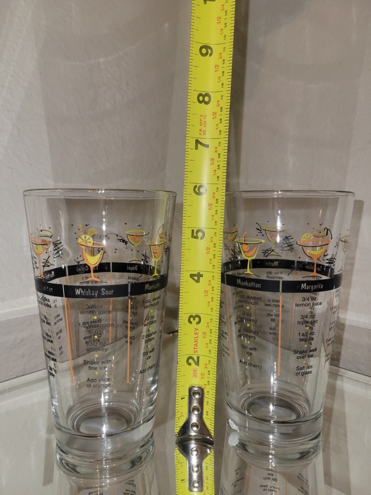 These vintage Libbey cocktail drink recipe glasses are a set of two highball glasses from the Mid-Century Modern (MCM) era. They are in great condition and feature a classic design. The dimensions are 5¾ inches tall with a 3½-inch diameter, making them both stylish and functional for serving your favorite beverages.