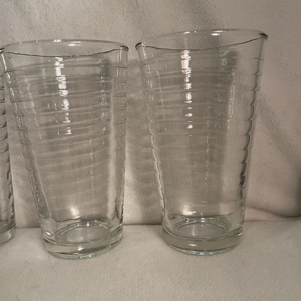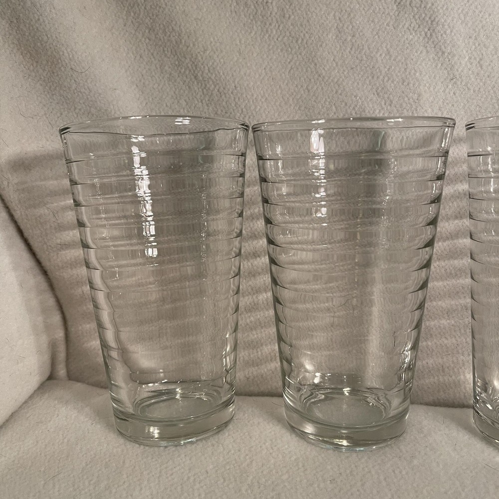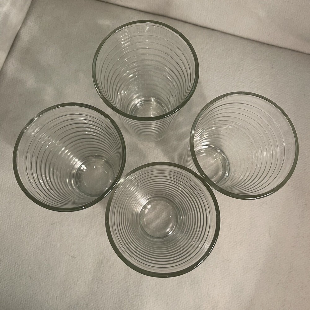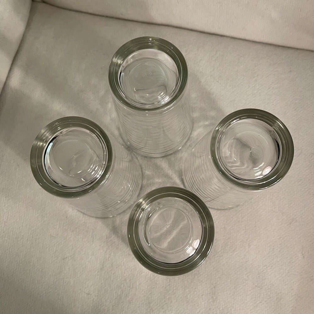 This vintage set of four Libbey tumblers features a clear glass design with a ringed pattern around the round shape. Each tumbler has a capacity of 12 oz and stands at a height of 5.75 inches, with a diameter of 3.5 inches. Made in the United States during the 1980s, these tumbler glasses are dishwasher safe and decorative, adding a touch of contemporary style to any occasion. The pressed glass production technique and fused glass material showcase the quality craftsmanship of these timeless and elegant drinkware pieces. Excellent condition. No chips or cracks.