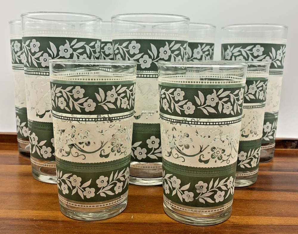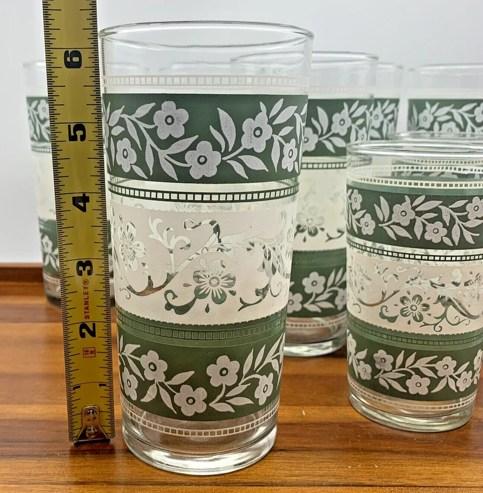 Set of 9 Vintage Libbey Floral Green White Water and Juice Glasses Retro MCM Mid Century Modern Flowers Bands All 9 glasses are in great condition, no chips or cracks! Some of them show some light wear, specifically on the white/cream color band, probably from stacking the glasses. 6 of the glasses are larger 16 oz size and 3 are smaller juice 8 oz glasses. The larger glasses stand roughly 6.25 inches tall and the juice glasses are roughly 4.50 inches tall. Please zoom in on photos for a better view of the item's condition. We do our absolute best to research all items we sell. If you ever have questions, please reach out to me! *We will always package items securely and with care* Thank you for viewing and please visit our store for more awesome vintage goodies!