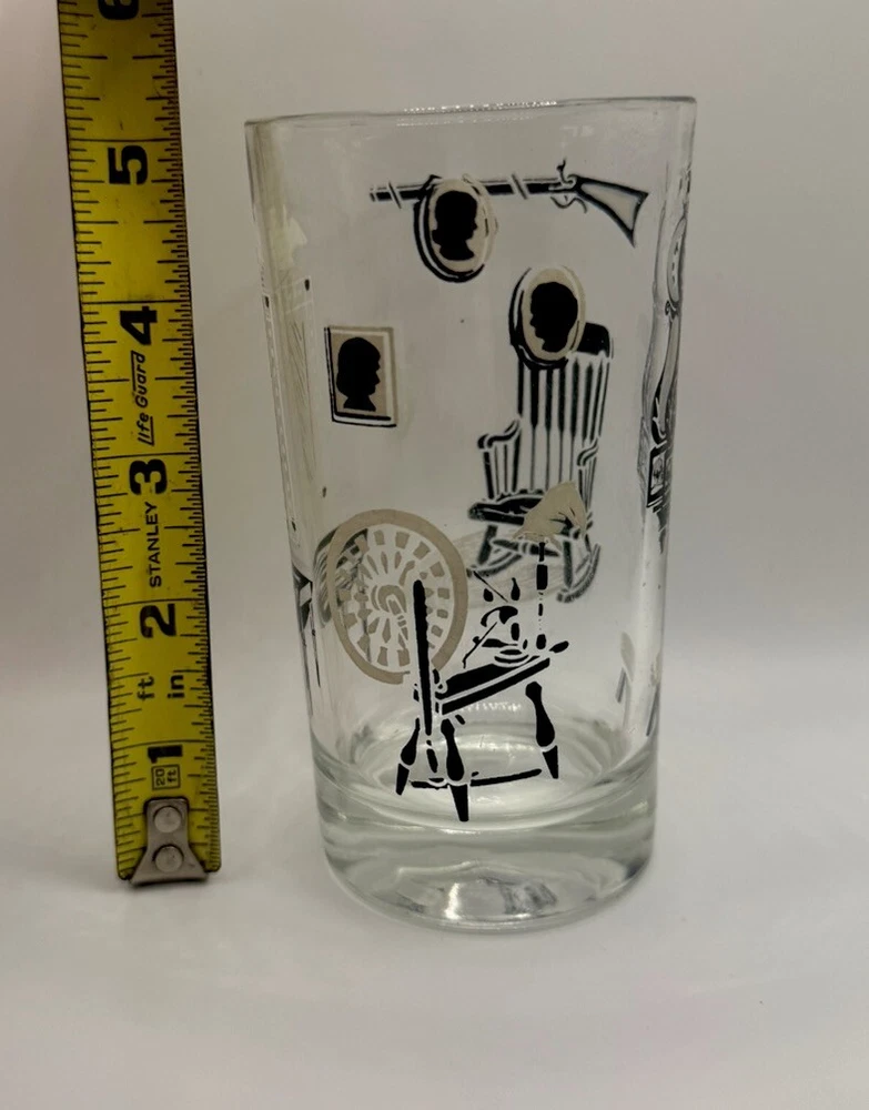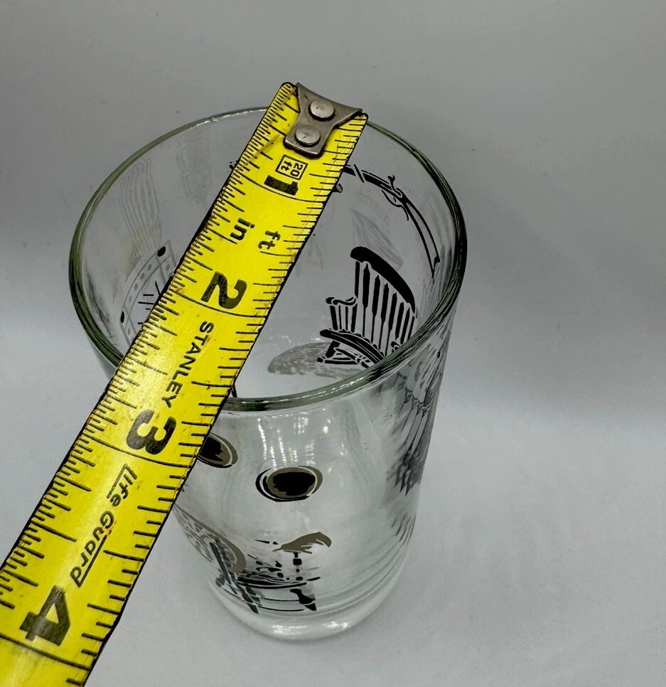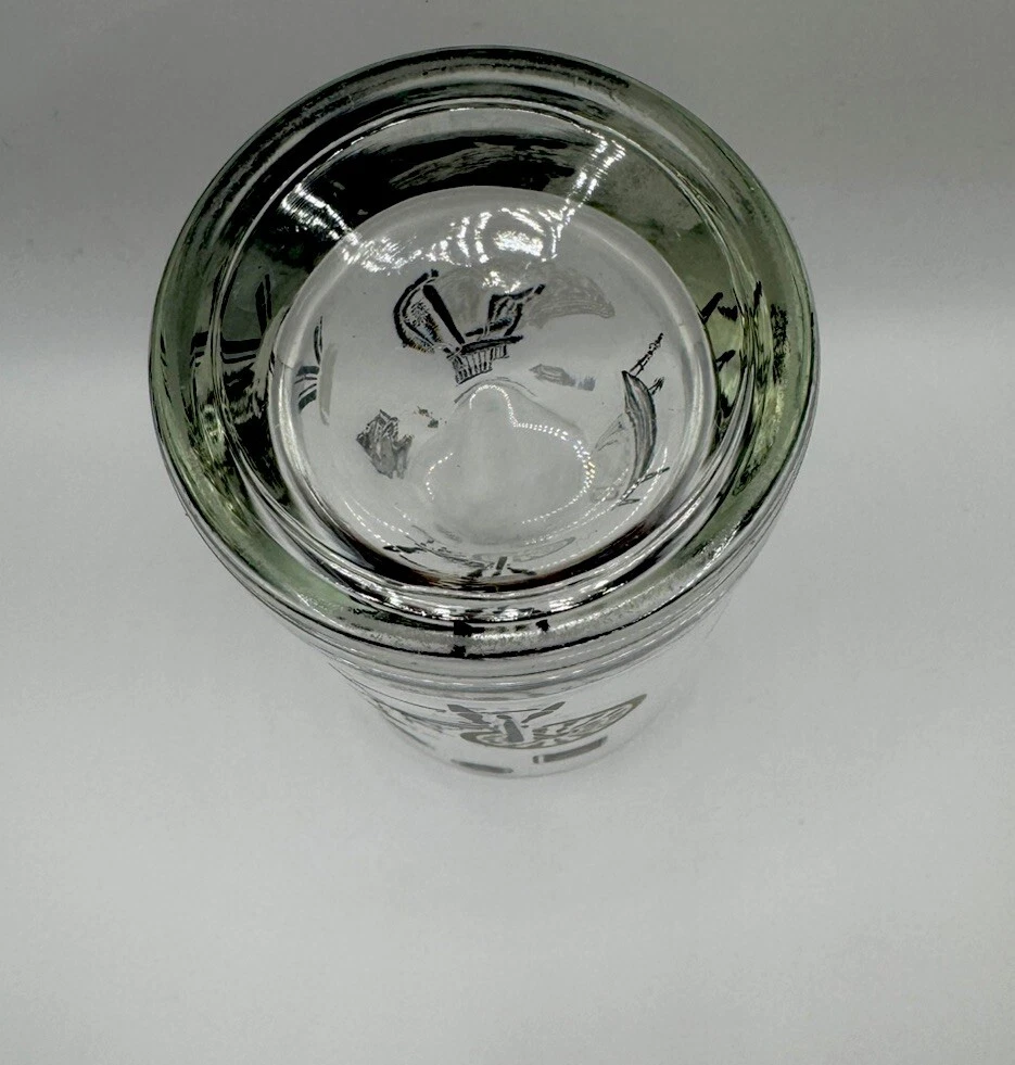 The Libbey Freda Diamond Curio Collection Collins Glass from the 1950s is a vintage barware item with a Mid-Century Modern style. This cylinder-shaped drinkware features a clear glass design with gold, black, and white accents, making it perfect for all occasions. Hand wash only to preserve its originality, this unisex adults' item is a unique addition to any collection, showcasing the theme of MCM furniture in its design.