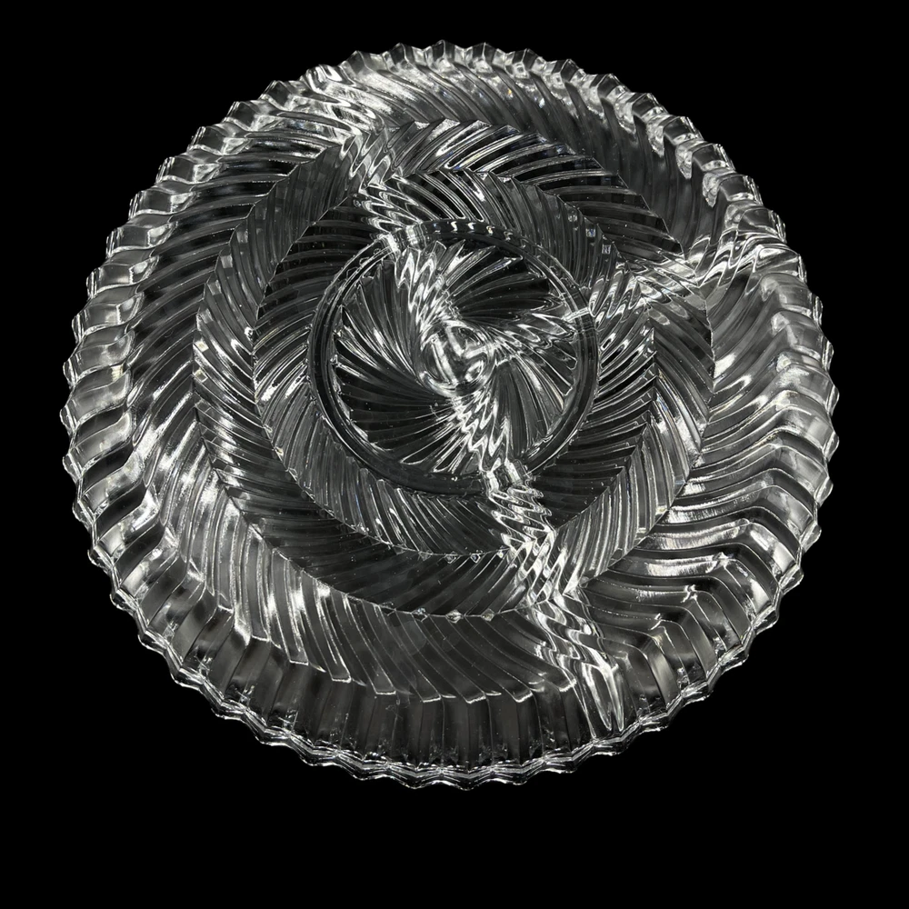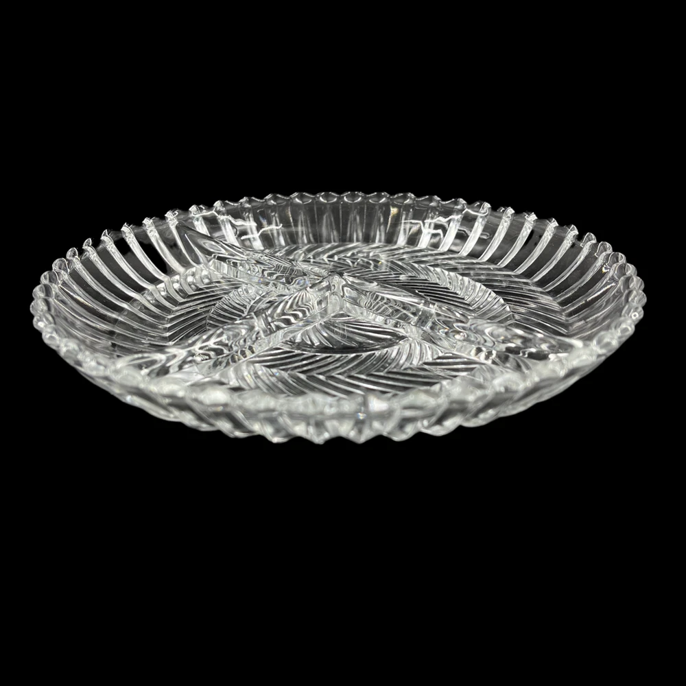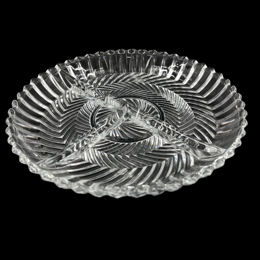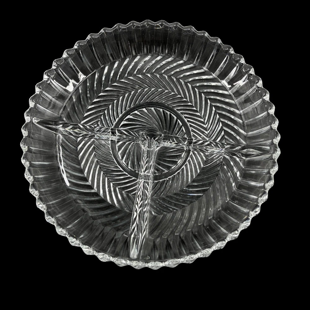 Vintage Libbey Glass Clear Ribbed Swirl Pattern 3 Part Relish Serving Dish 7 1/2" diameter and 1" deep. Three sections.