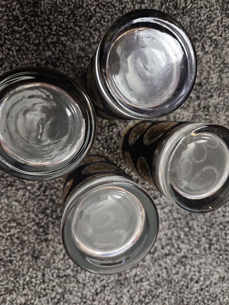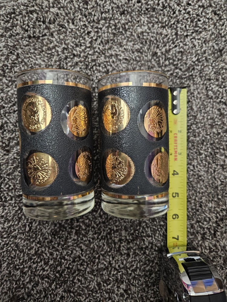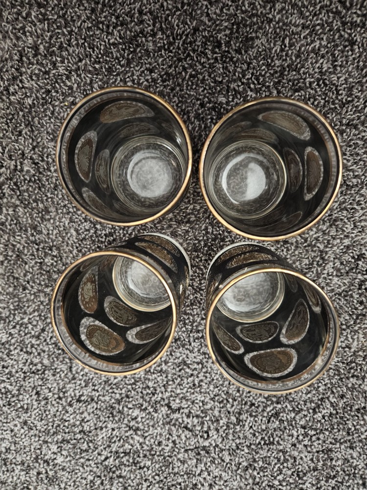 This vintage set of 4 Libbey Hostess glassware tumbler glasses features a unique design with a black textured surface and accents of gold coins. Great to complete your mid century modern look! Glasses are approx 5" in height. Two of the glasses have a cursive L marking on the bottom.