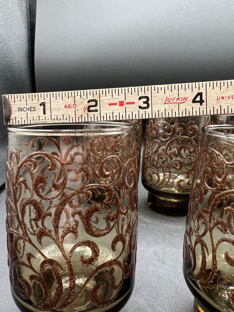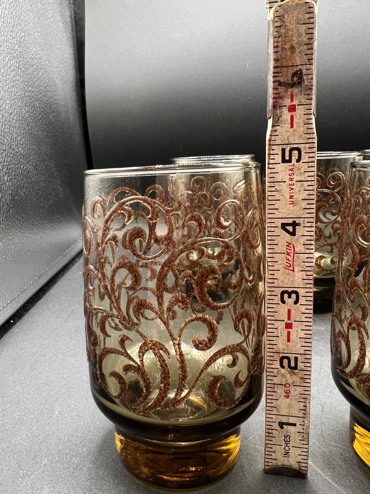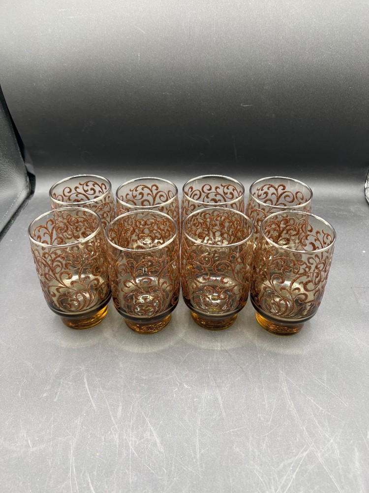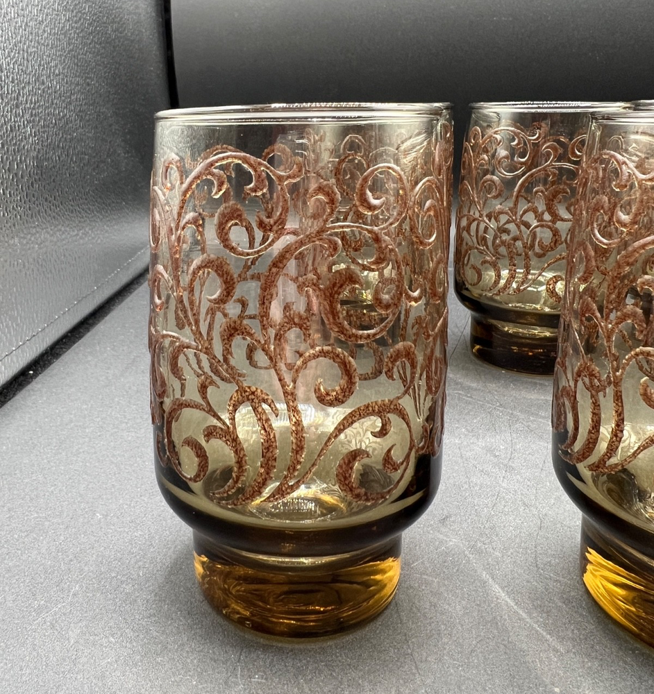 This set of 8 vintage Libby Prado tea/water glasses features a round shape with a brown color and a glossy finish. Made of glass with an item height of 4 3/4 inches, these tumblers are perfect for all occasions and are signed by the brand Libbey. Manufactured in the 1970s in the United States, these original glasses are a great addition to any drinkware collection. Care instructions recommend hand washing only, making them easy to maintain and enjoy for years to come.