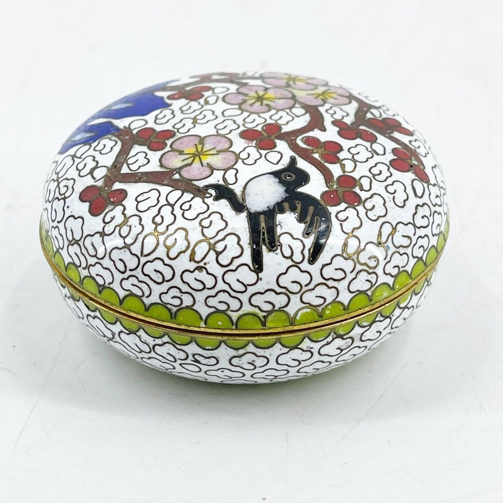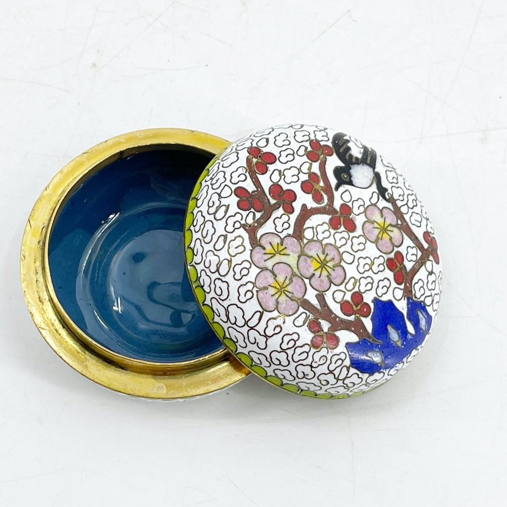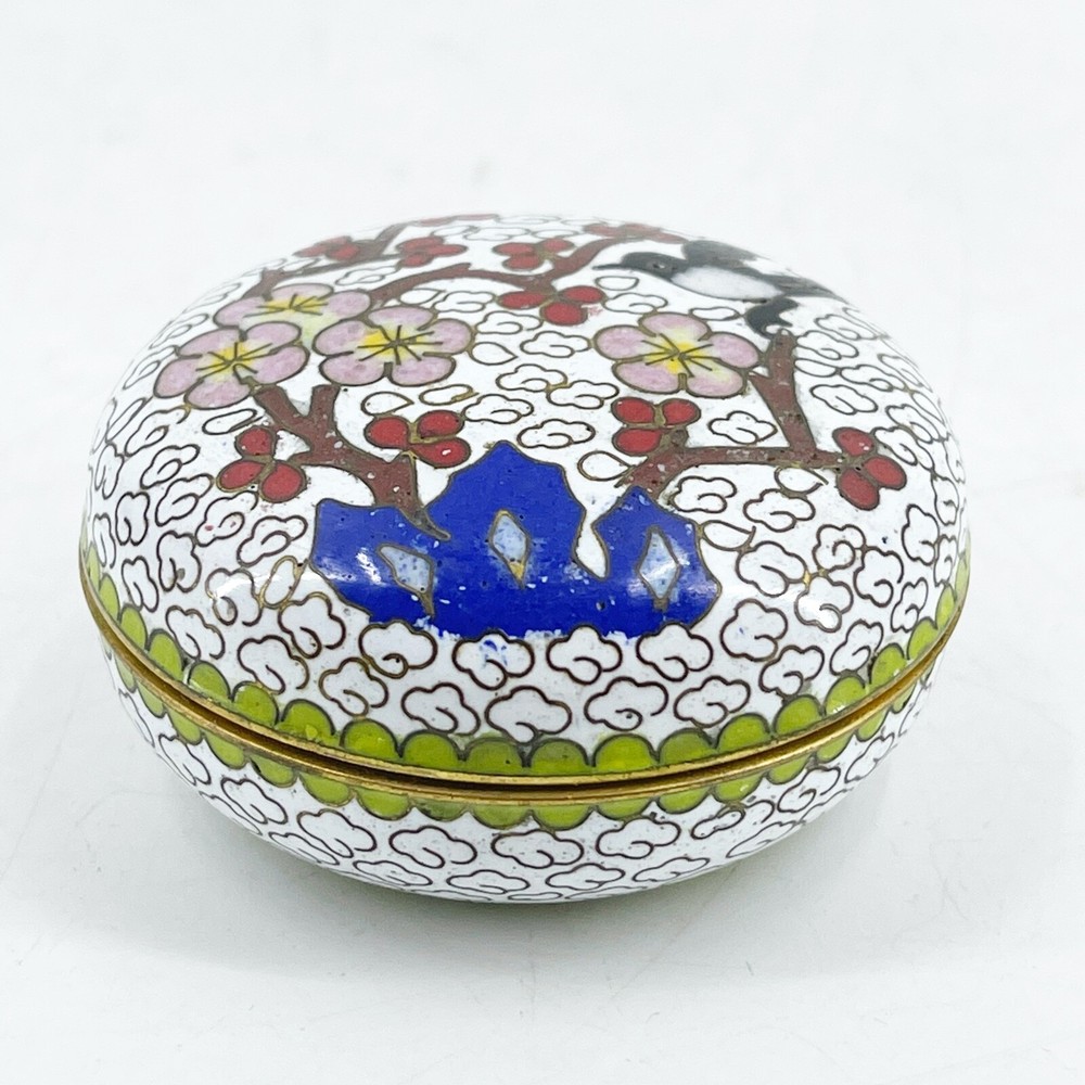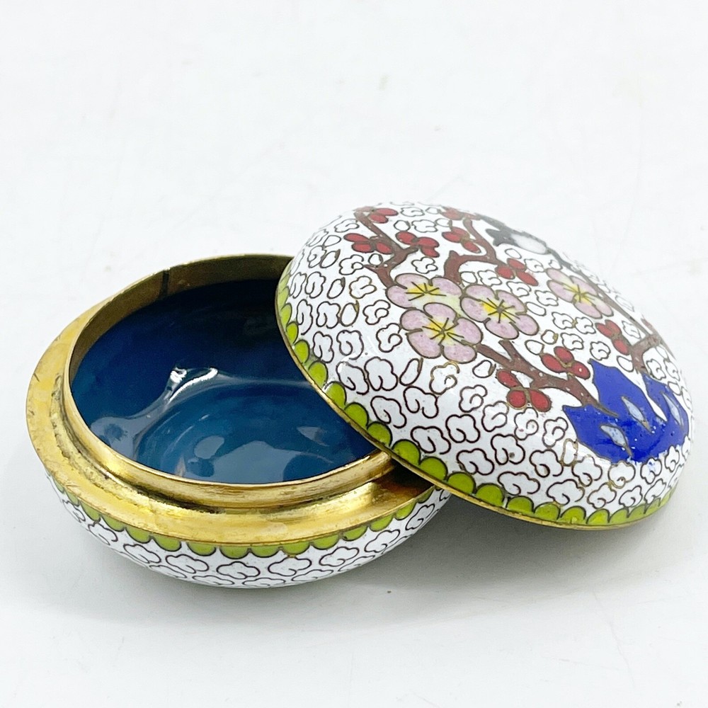 Vintage Lidded Cloisonne Pill Trinket Keepsake Box Cherry Blossoms Bird Lotus Lid features a lotus, cherry blossoms, and a black and white bird. Inside and underside of box are a base blue enamel. 2" diameter and 1" tall.