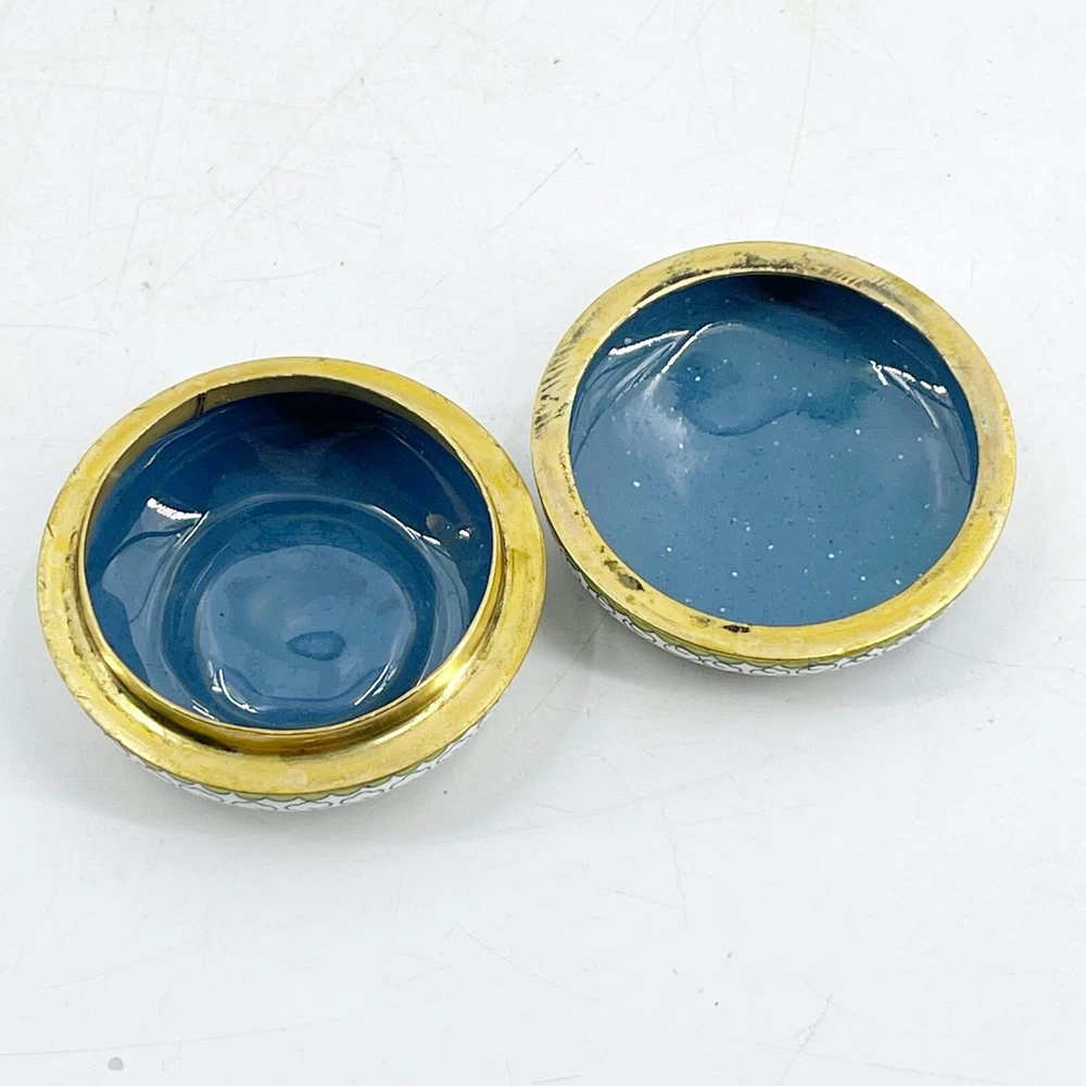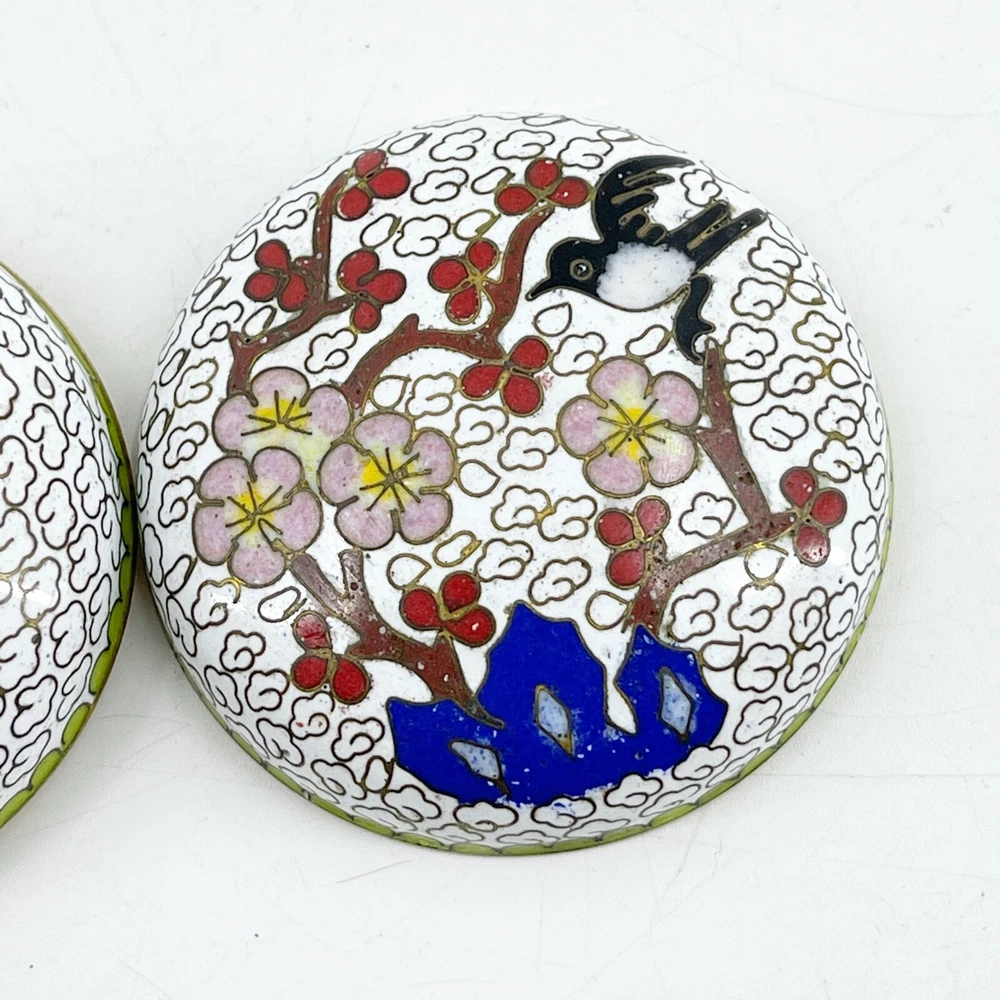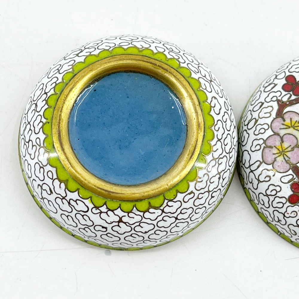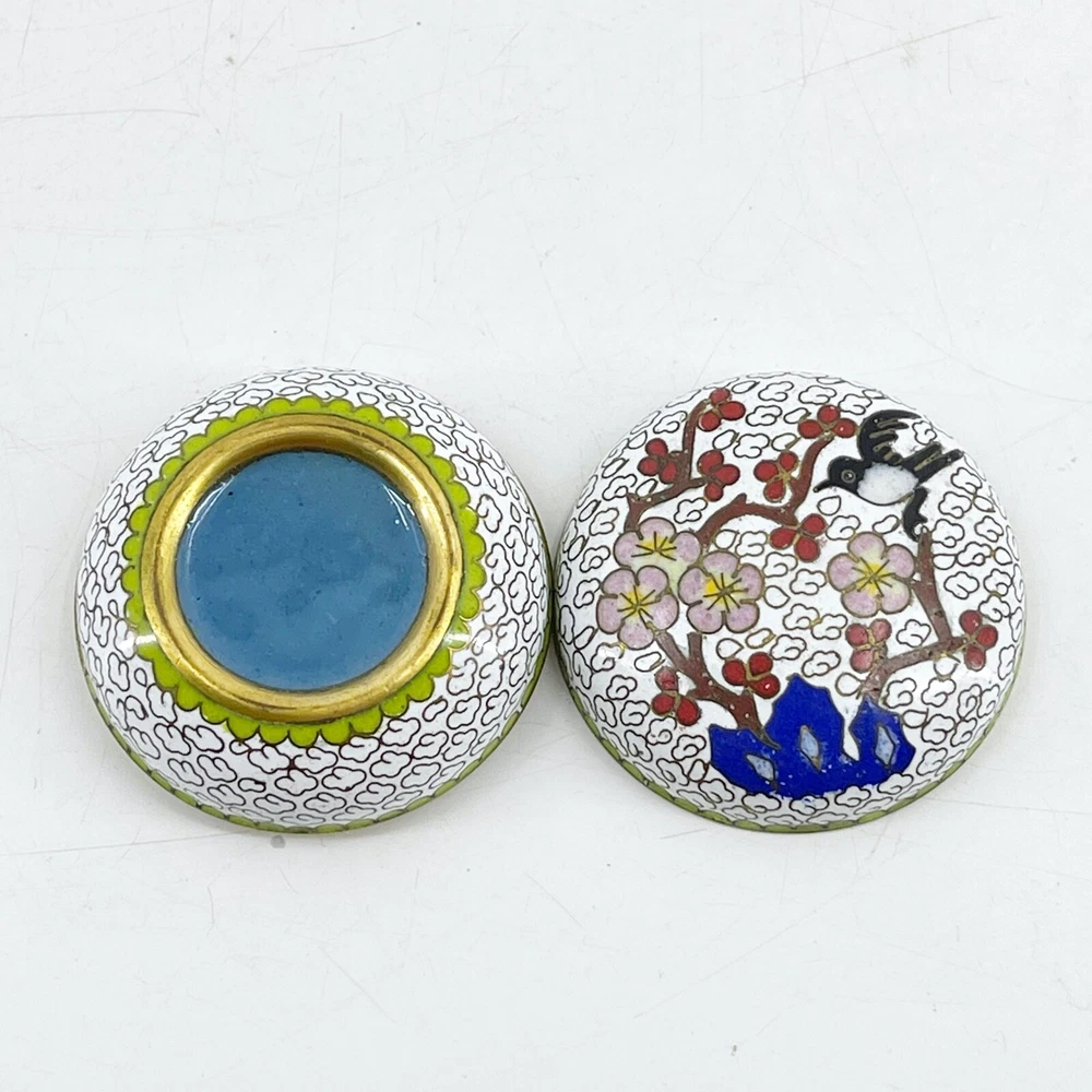 Vintage Lidded Cloisonne Pill Trinket Keepsake Box Cherry Blossoms Bird Lotus Lid features a lotus, cherry blossoms, and a black and white bird. Inside and underside of box are a base blue enamel. 2" diameter and 1" tall.