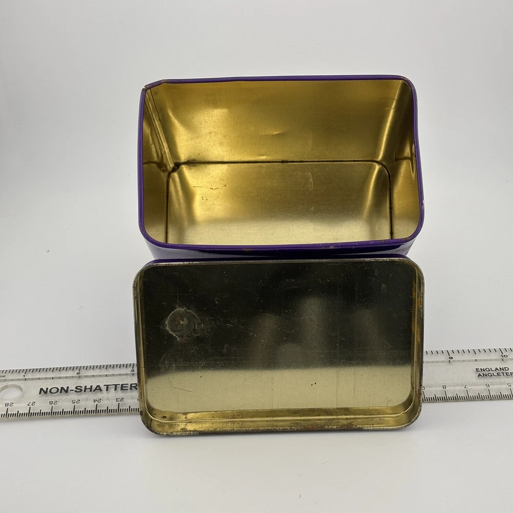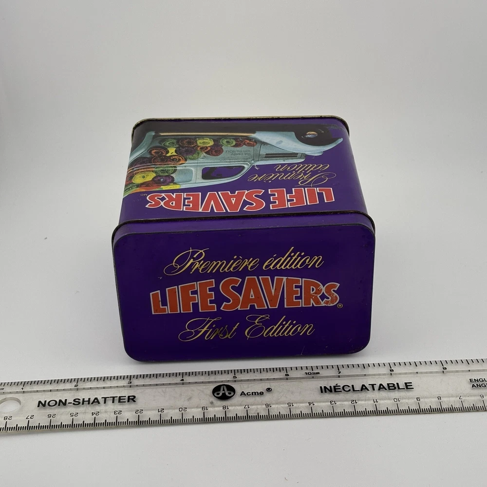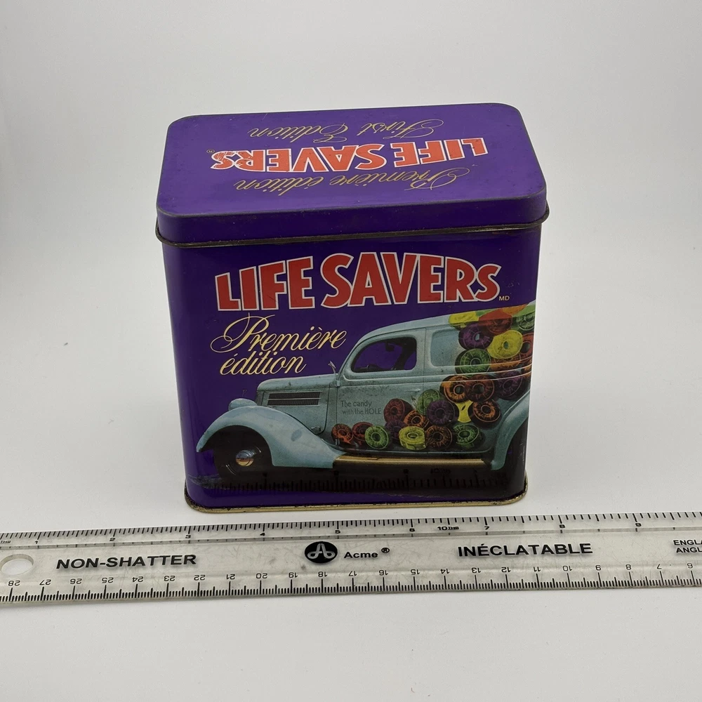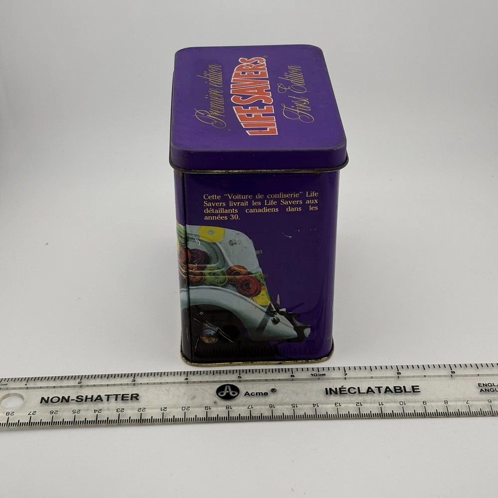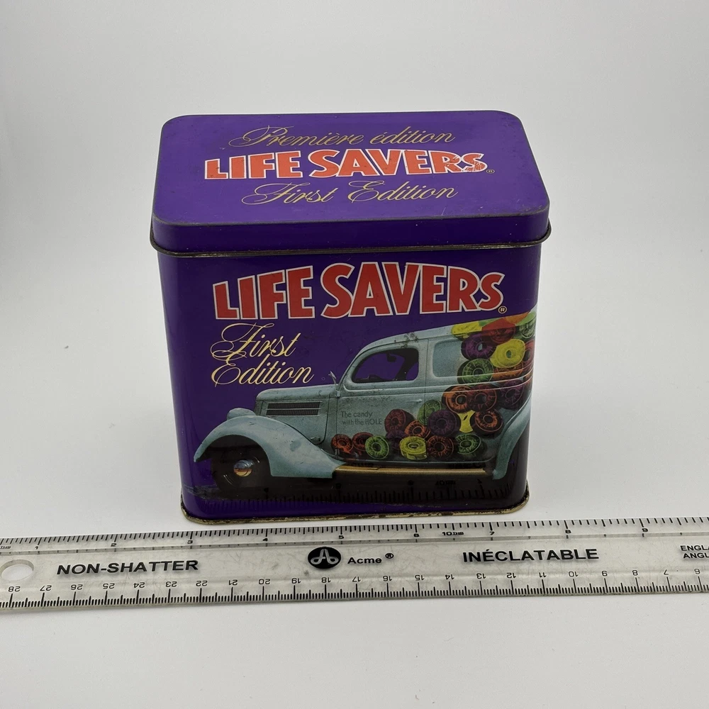 This vintage Lifesavers "First Edition" tin features a vibrant purple design with an old-fashioned candy delivery car graphic and the tagline, "The candy with the HOLE." The nostalgic imagery and colorful graphics make it a collectible piece for Lifesavers enthusiasts or vintage advertising collectors. The tin also includes text referencing the use of the iconic candy car in 1935, adding historical charm. Its spacious interior makes it practical for storage or display. Refer to the photos with the ruler for accurate scale. This tin is a delightful decorative piece for collectors or those looking to add a retro touch to their home. Condition Notes: This Lifesavers tin is in fair vintage condition, with noticeable signs of wear, including scratches, scuffs, and minor dents. The interior shows light tarnishing, but the overall structure remains intact. The graphics are vibrant, though they exhibit some wear consistent with its age. Please examine all photos carefully to assess its condition. Welcome to The Gay Delphinium! I'm new to selling on eBay, so I appreciate your patience as I navigate this learning curve. Please note that I ship from rural Canada, and while I do my best to get your items to you as quickly as possible, shipping can sometimes take a bit longer, especially during the winter months. Save on shipping by bundling items from my shop! I offer a variety of vintage items, such as books, toys, and more. These items naturally show signs of age and wear, which adds to their unique charm. What you see in the photos is exactly what you'll receive. I strive to mention any notable flaws, broken parts, or missing pieces in my listings, but if you have any questions or need more details, please don't hesitate to reach out. If you happen to notice any mislabeling or errors in my listings, I would greatly appreciate you letting me know! Thank you for supporting my shop, and I hope you find something special! Important Shipping Update Due to an ongoing strike by Canada Post workers, I am currently unable to ship items using standard postal services. While private courier options are available, they are significantly more expensive and are currently inundated with packages, resulting in their own delays. Please keep this in mind when placing an order. Additionally, while my shop is technically on 'vacation time,' I am still accepting orders. However, I ask that you manage your expectations regarding shipping times, as delays are beyond my control at the moment. Thank you for your patience and understanding. Your support means the world to me, and I?ll do everything I can to ensure your order gets to you as soon as possible! Take care, The Gay Delphinium