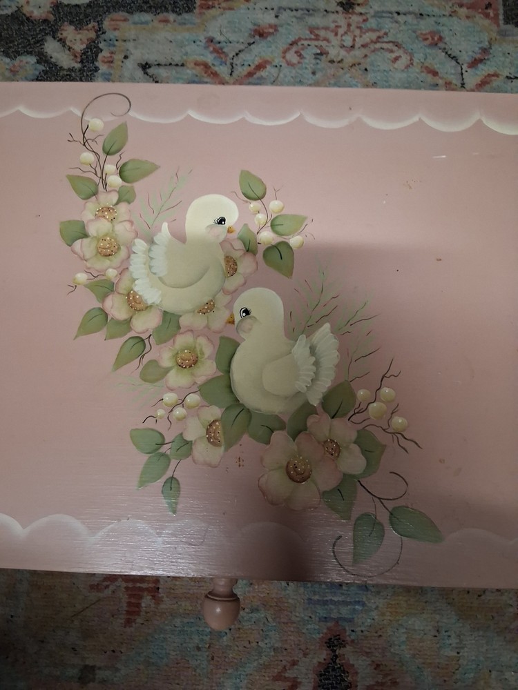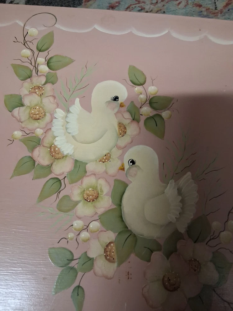 This vintage light pink handpainted ducky keepsake box is a charming and unique decorative collectible. Crafted from wood, the rectangular box features a ducky pattern in a multicolor design, perfect for any room and all occasions. Handmade with intricate details, this trinket box adds a touch of artistry and whimsy to your space. A lovely addition to any collection of keepsake boxes, this unmarked piece is a one-of-a-kind treasure for collectors and vintage enthusiasts.