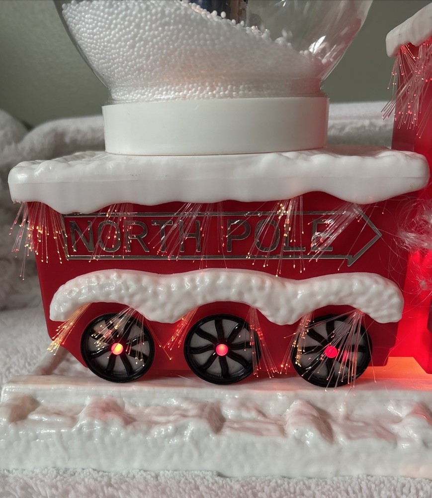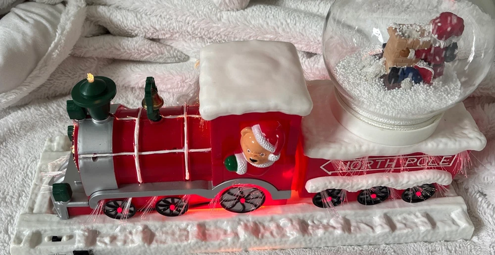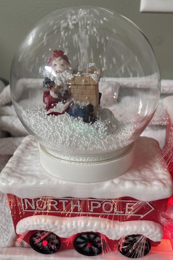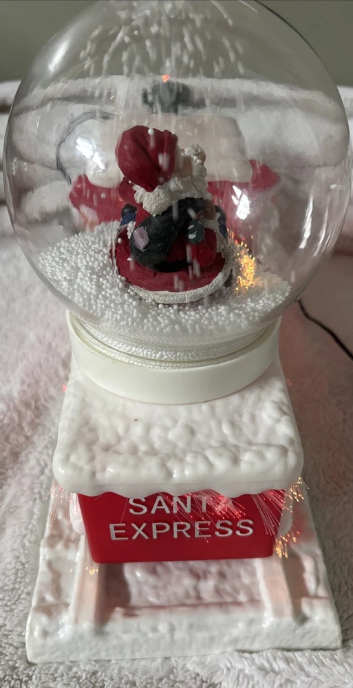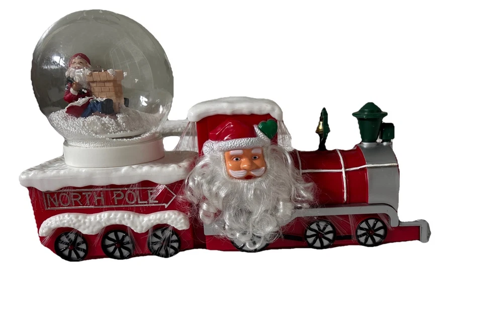 The Vintage Musical Light Up Santa Train Snow Globe is a classic Christmas collectible featuring a novelty design with a rectangular shape and a festive multicolor plastic material. This unique snow globe plays a musical tune and lights up, making it a fun and nostalgic addition to any holiday decor. Perfect for teens, boys, adults, kids, and girls alike, this Santa-themed snow globe is a charming and whimsical piece that will bring joy to collectors and Christmas enthusiasts alike. Plays jingle bells. No box. Comes with adapter plug Works