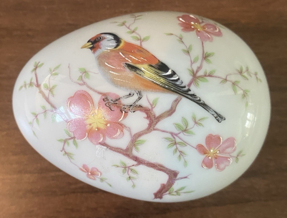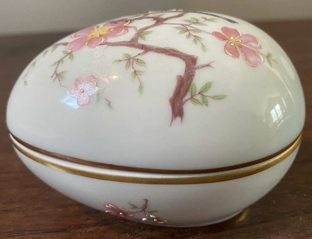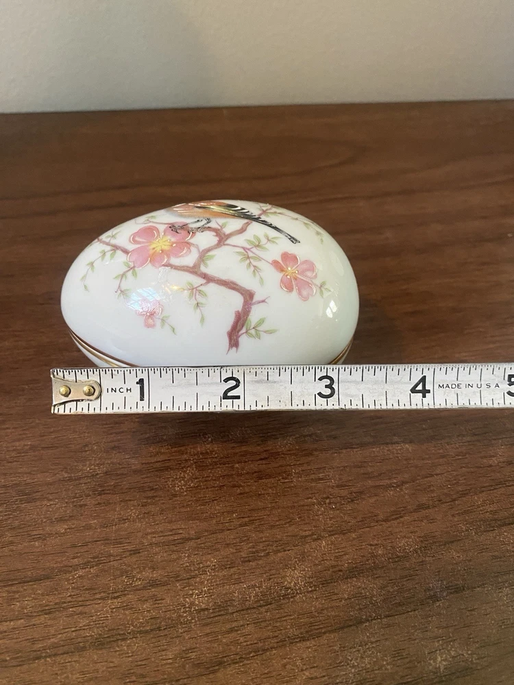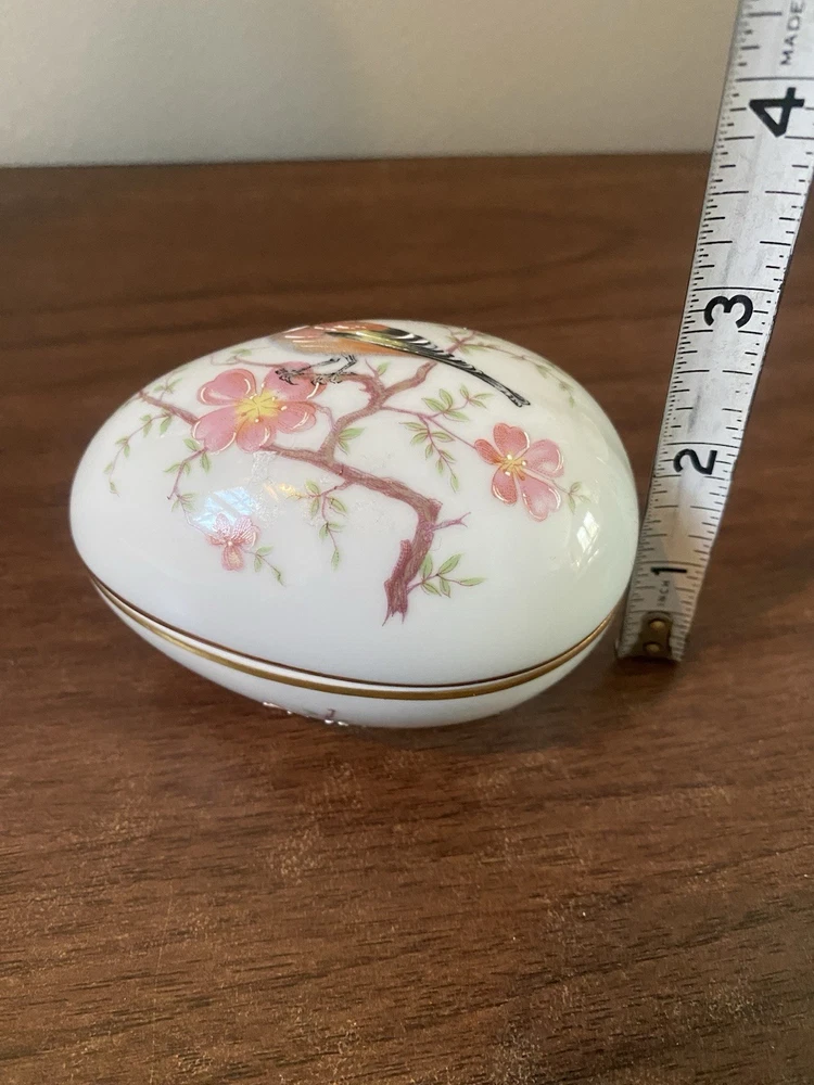 Crafted with meticulous attention to detail, this vintage Limoges egg-shaped trinket box is a true keepsake. Adorned with delicate hand-painted bird and floral motifs, its colorful palette brings a touch of nature's beauty to any setting. Whether used to store small treasures or displayed as a standalone piece, this trinket box is a charming addition to any collection.The box features the authentic Limoges brand, renowned for its quality and craftsmanship. Its original state preserves the unique artistry that makes each piece a potential conversation starter or a cherished heirloom. This trinket box is a perfect blend of functionality and elegance, encapsulating the allure of vintage collectibles.
