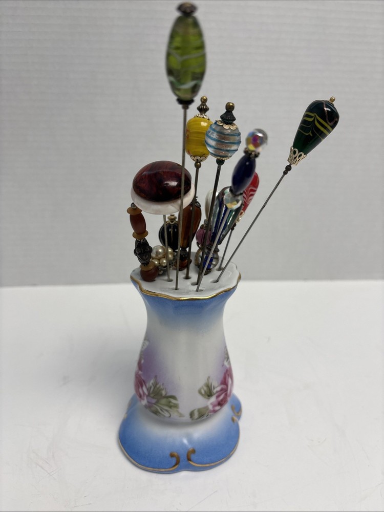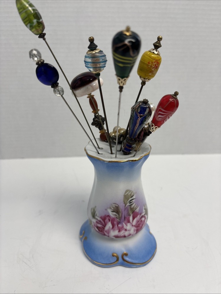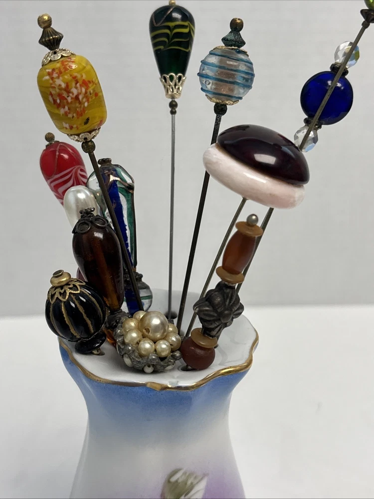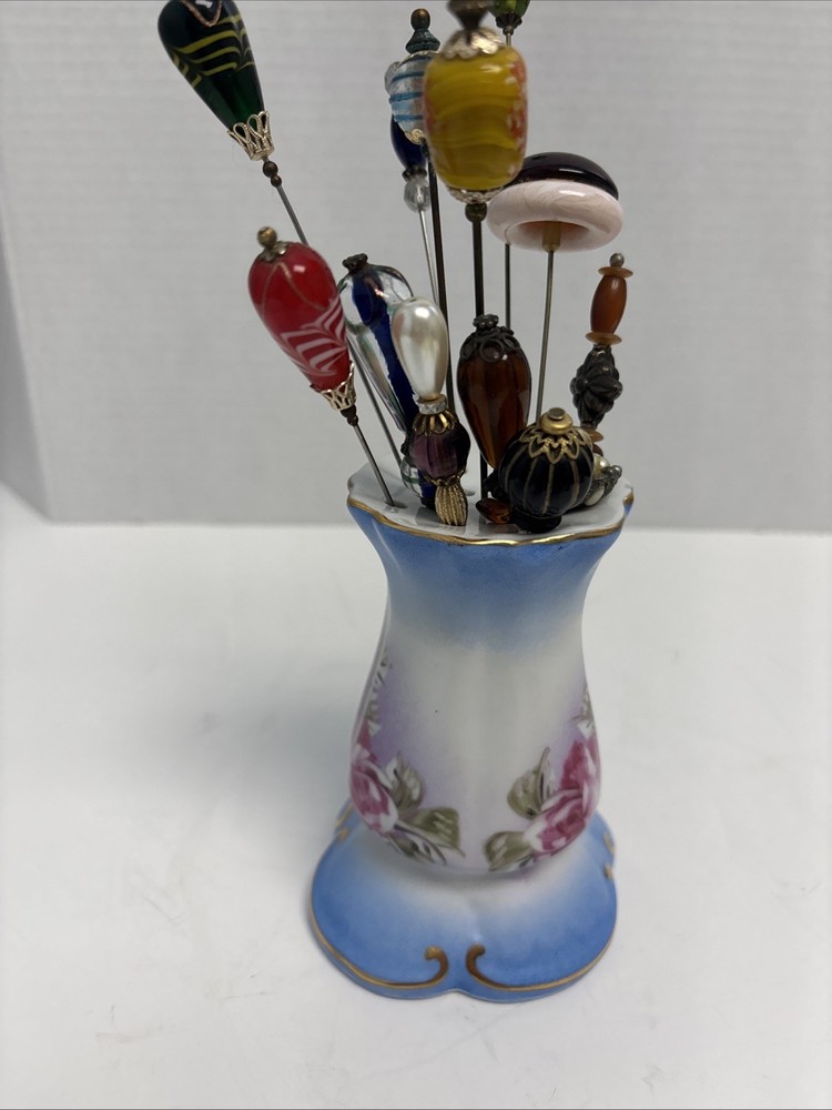 VINTAGE LIMOGES HAND PAINTED HATPIN HOLDER 13 HAT PINS PORCELAIN GOLD Stunning set of of hatpins with with beautiful porcelain holder in excellent condition. Please see all pictures and thanks so much for looking.