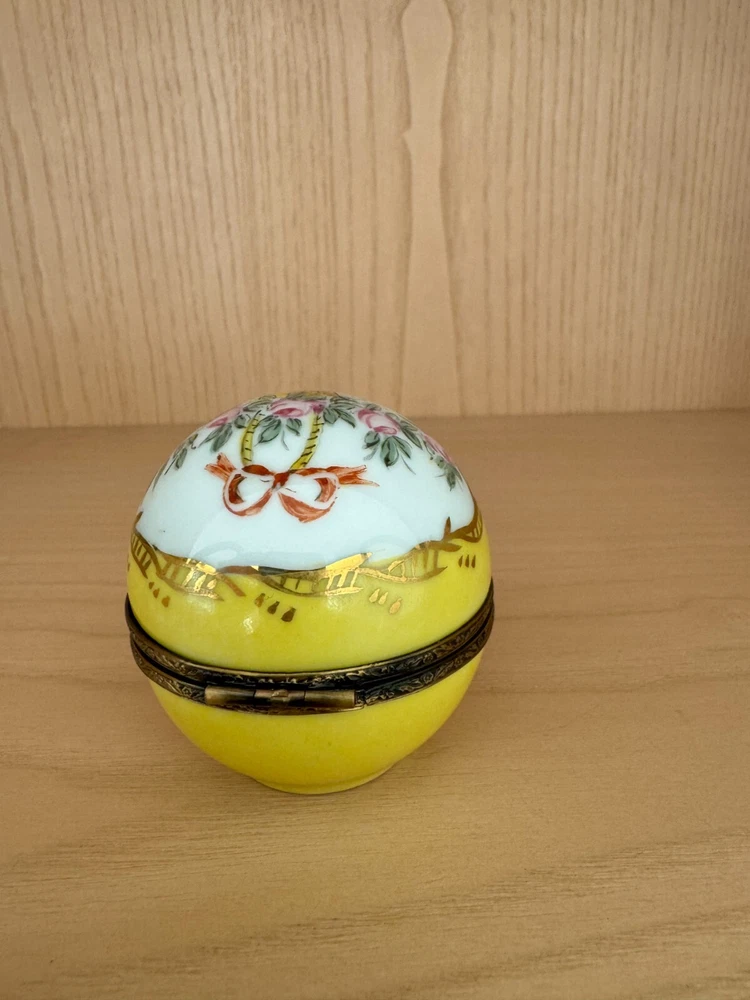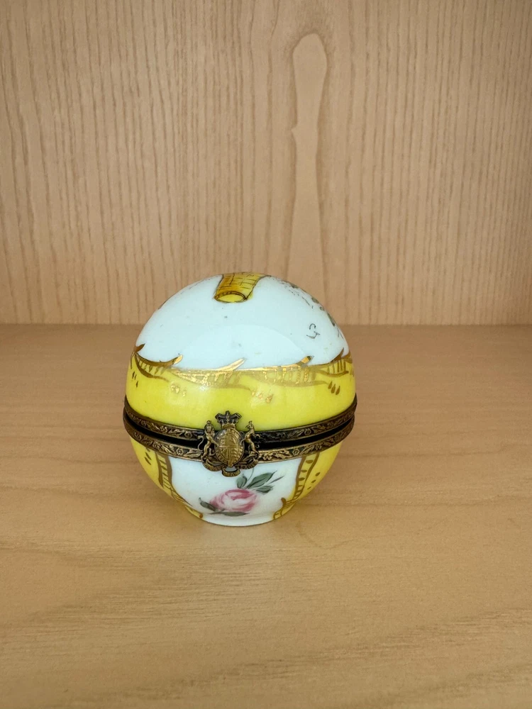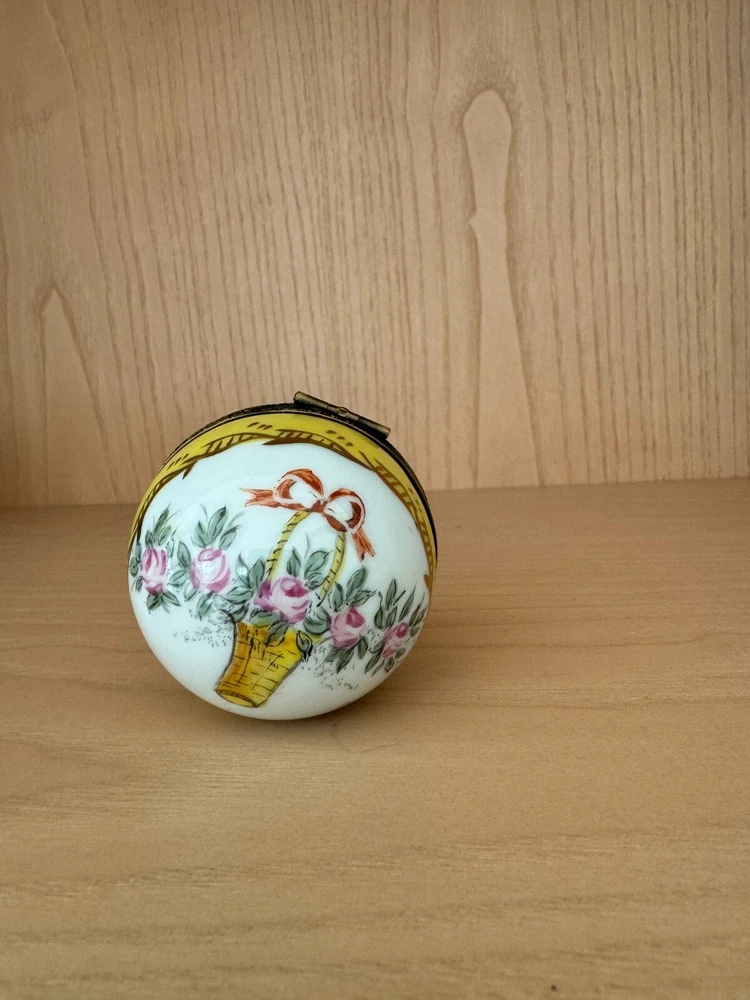 Vintage Limoges Porcelain Trinket Box with Miniature Tea Set - Hand painted with Gold detailing and Pink Roses - Signed Peint Main Limoges France Features: Hand painted with yellow and gold detailing and pink roses A basket with bow and pink roses is on top and a pink rose on front Miniature tea set inside painted with blue and white design Signed "Peint Main Limoges France" Round shape Excellent vintage condition Dimensions: Approximate 2.5" x 2.5" A true collectors item! Hand painted with elegant gold detailing and, a beautifully crafted basket with a delicate bow and pink roses, making it a standout piece. The brass closure is a crest featuring a crown, lion, and what looks to be a griffin. Inside, a miniature tea set, beautifully showcased in this small treasure. The box is signed "Peint Main Limoges France," indicating its authenticity. Perfect for collectors, this charming piece would make a wonderful addition to any collection or a lovely gift for someone special.