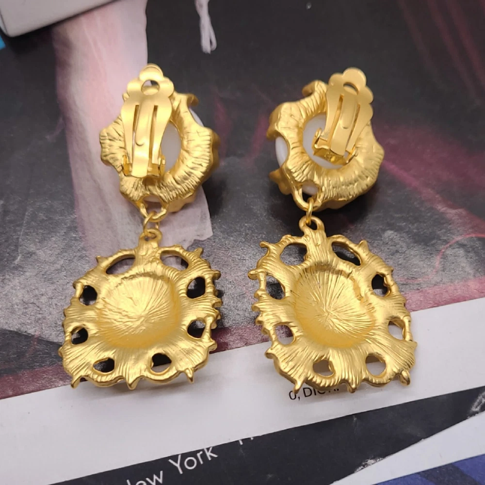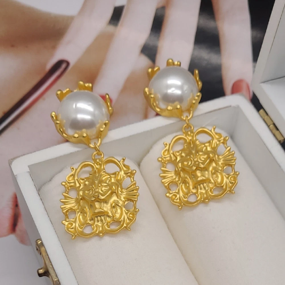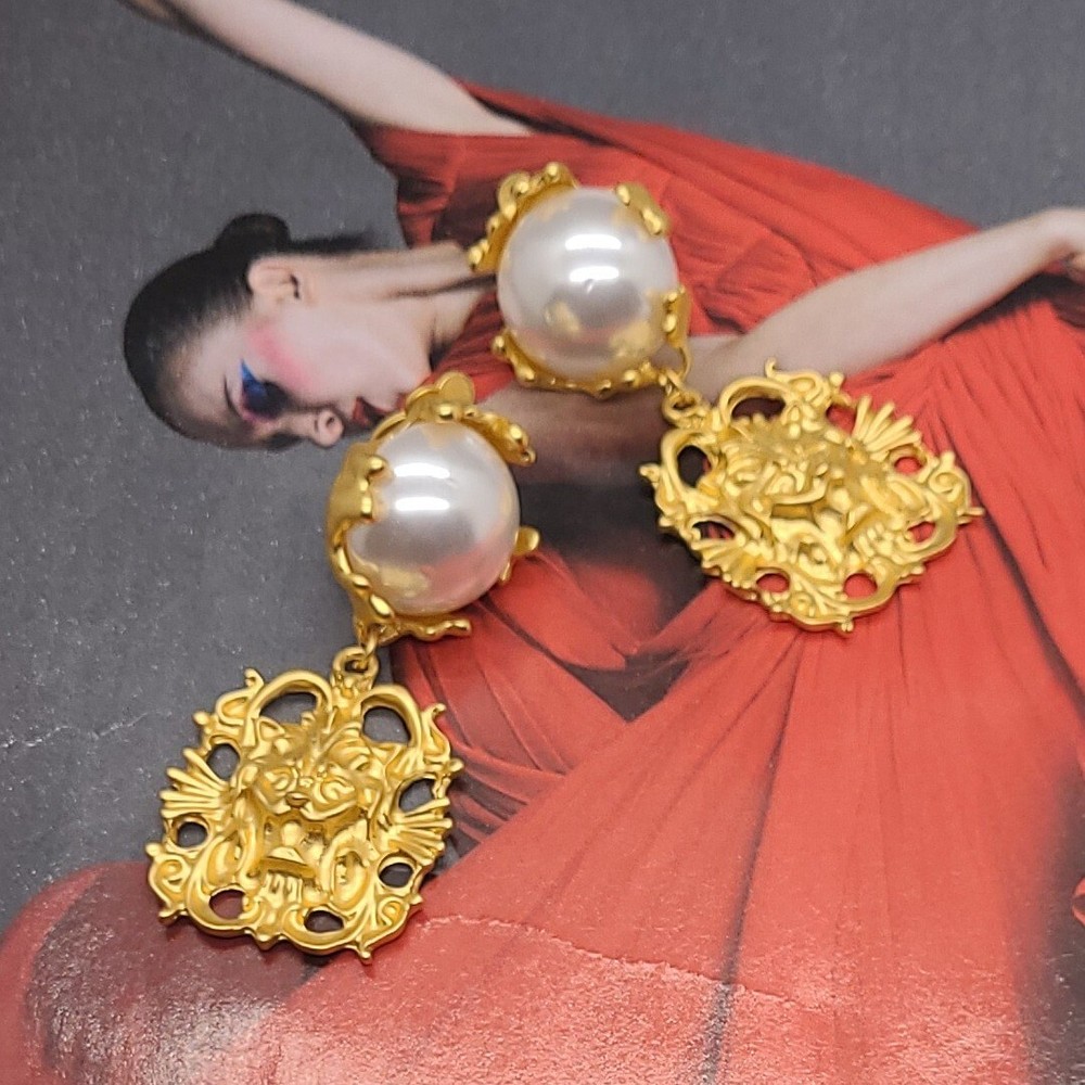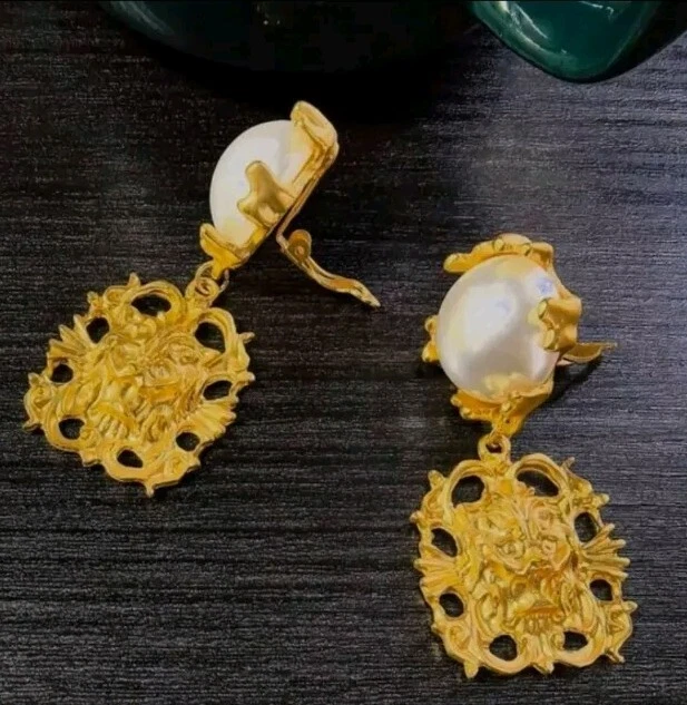 Add a touch of vintage elegance to your style with these stunning French palace style pearl embellished gold pendant clip-on earrings. The earrings feature a lion head design that exudes strength and confidence. The pearl main stone adds a touch of sophistication to the overall look. These yellow gold plated earrings are perfect for any occasion, whether it's an anniversary or a birthday. The dangle/drop style and the beauty, art, & animals make these earrings a must-have for any jewelry collection. The earrings are 2.56 inches in length and are designed to be worn on the lobe. Vintage Lion Head French Palace Style Pearl Gold Pendant Clip On Earrings 2.56" Length 1.18" Width Clip On Gold Plated