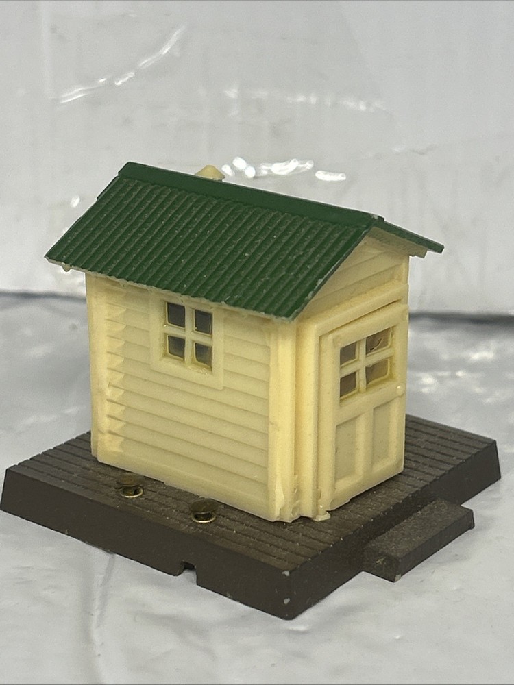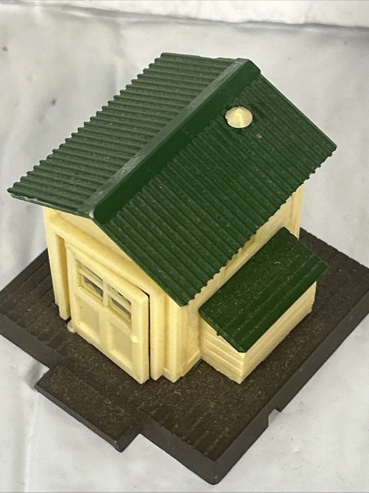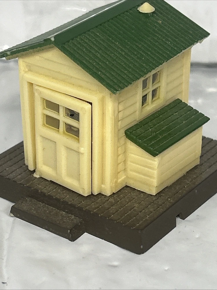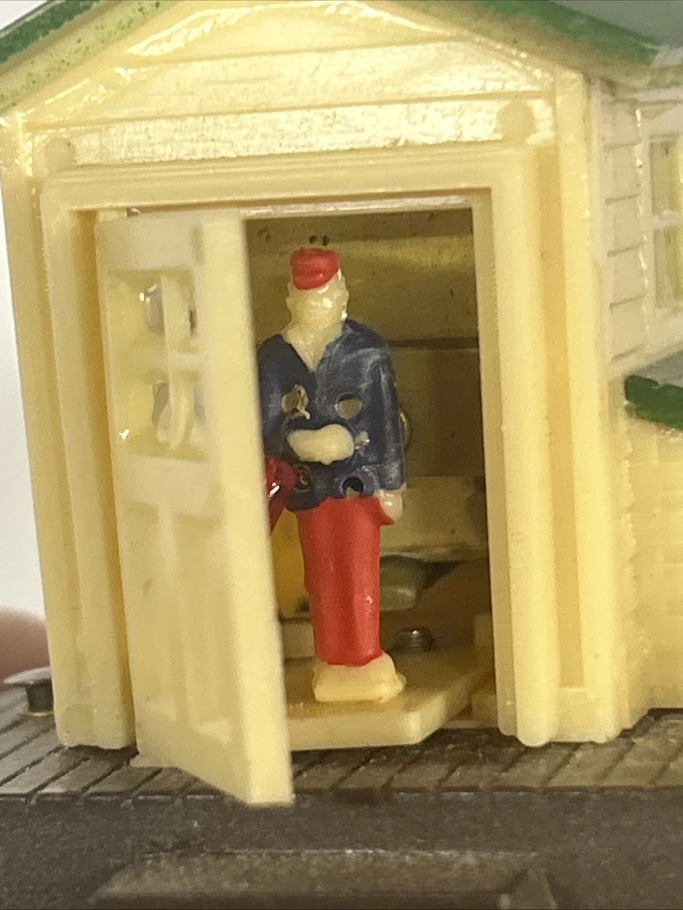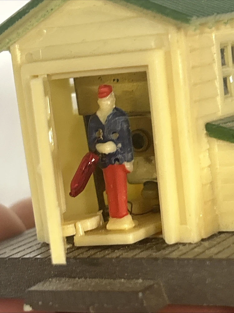 Used small station building with a conductor or passenger inside when the door opens. Electrical function has not been tested. Sold as is.