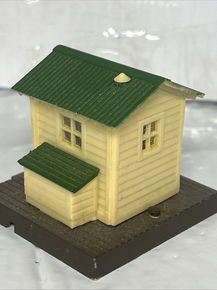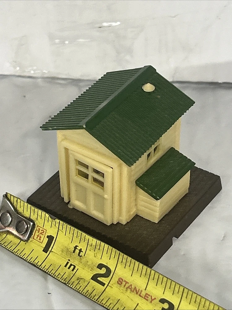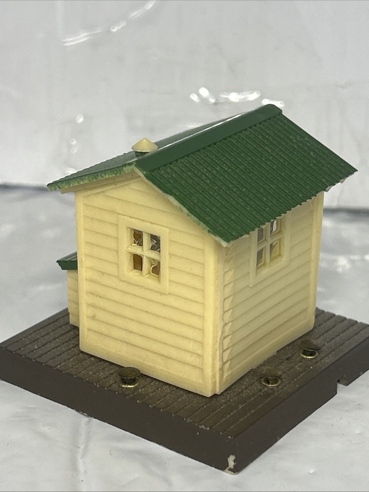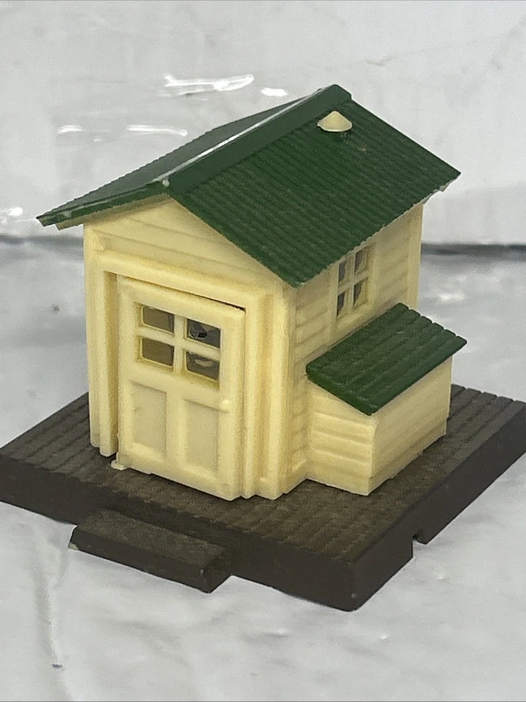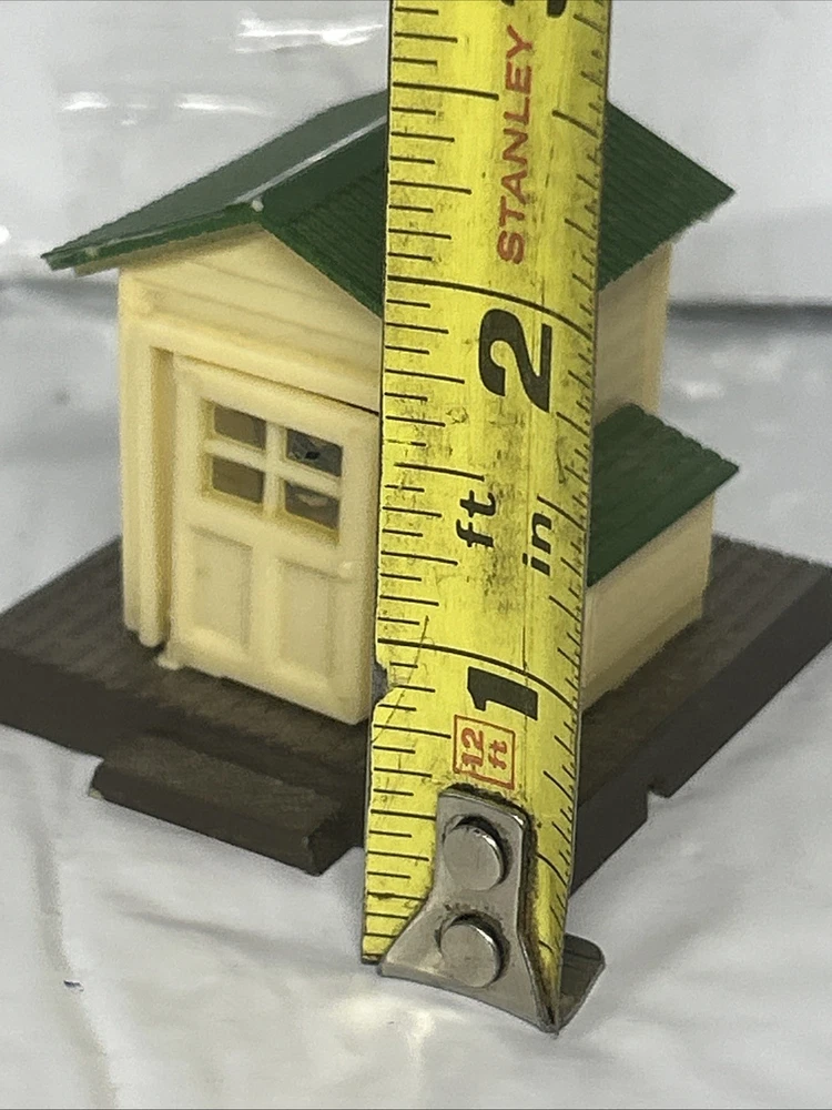 Used small station building with a conductor or passenger inside when the door opens. Electrical function has not been tested. Sold as is.