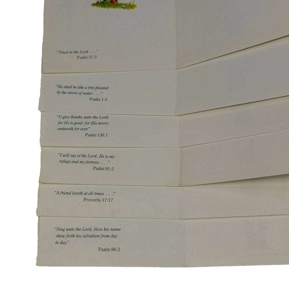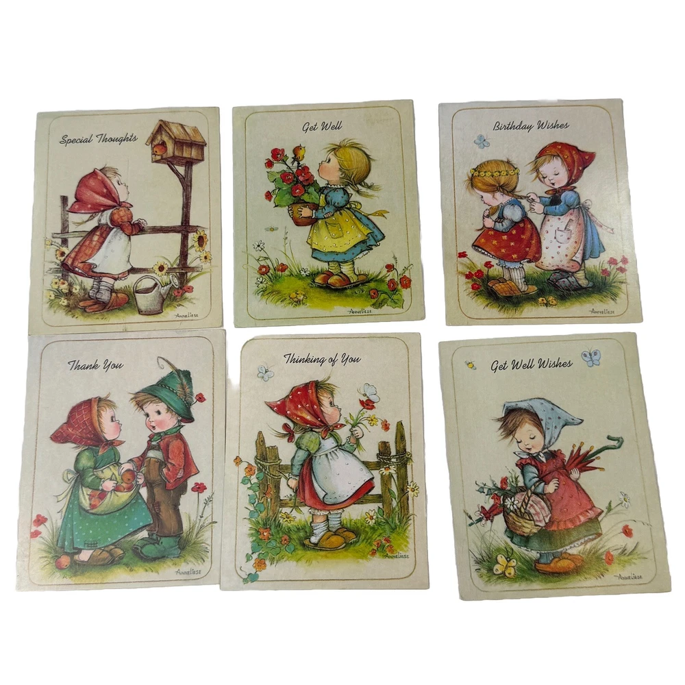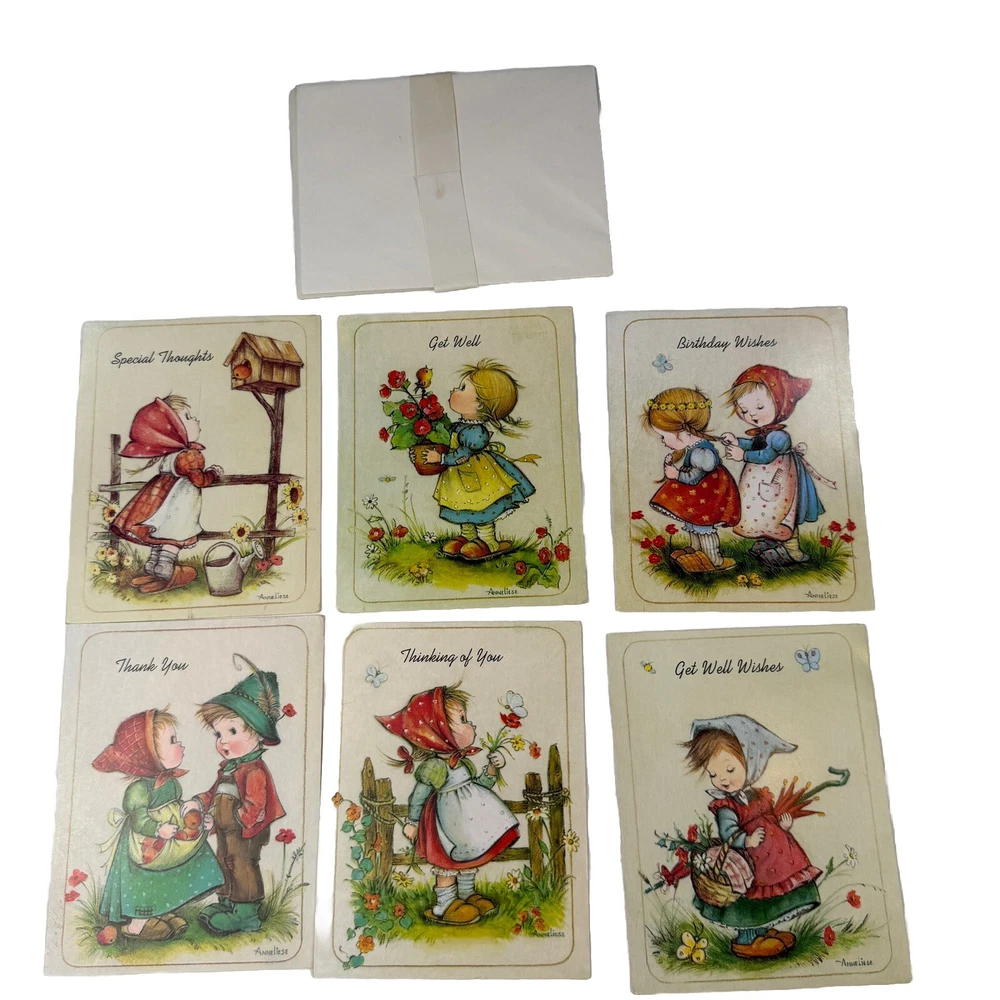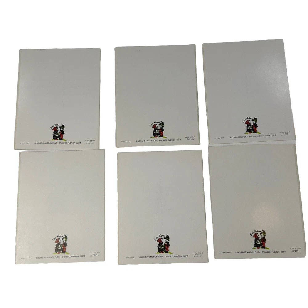Set of 6 vintage Little Helper’s greeting cards - assorted themes, Get Well, Thank You, etc. Made in the USA by Children’s Mission Fund in 1990. Interior includes a bible verse and message. Art work is signed Anne Liese. Envelopes are included. All are unused and in good vintage condition. Please see photos for more details and measurements.