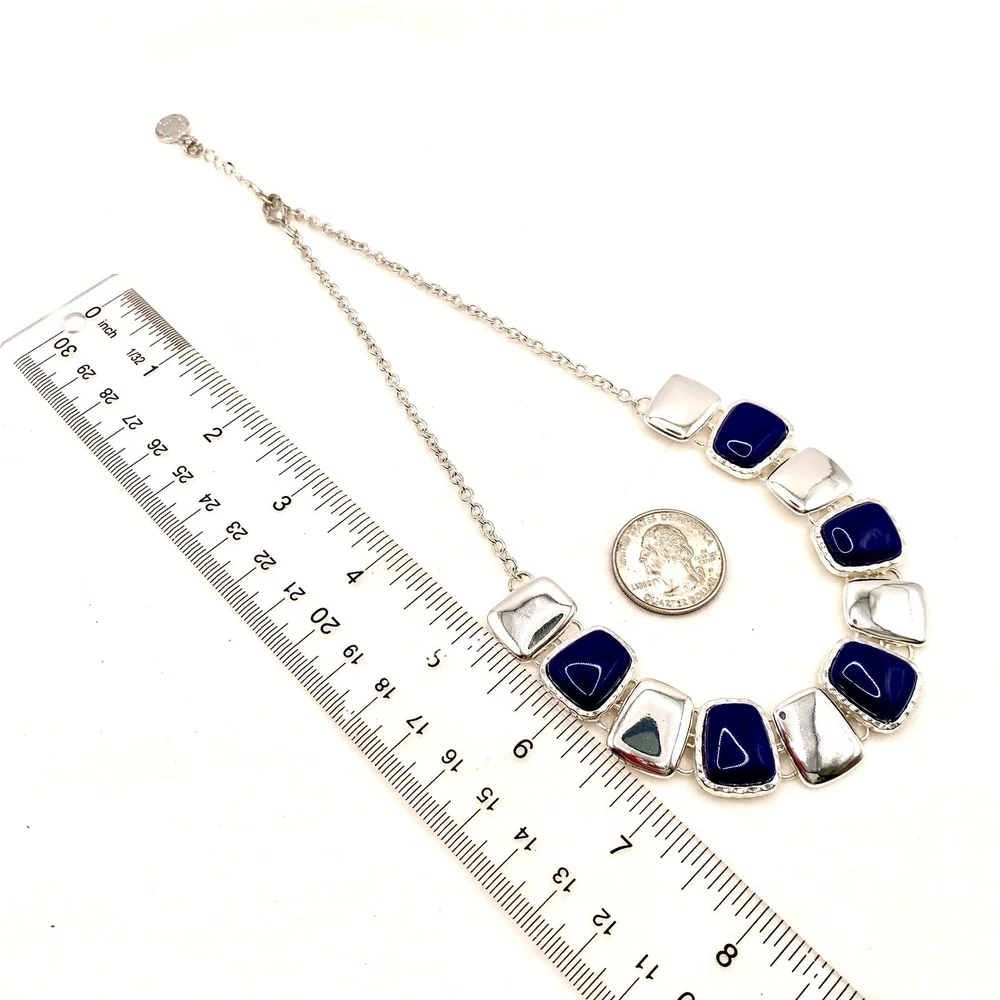 Add a touch of vintage charm to your outfit with this stunning Liz Claiborne necklace. The silver-tone chain features a unique oval link and a lobster closure, while the pendant shape is a beautiful rectangle with a navy blue color and silver charms. The necklace is 17 inches long and has an adjustable feature, making it suitable for any occasion, whether it's a special event like a wedding or anniversary, or an everyday accessory. The necklace has a classic and timeless design, with a beachy and bohemian theme that is perfect for any fashion-conscious woman. The piece is signed and has a vintage feel, but it is also modern and eye-catching. Whether you're looking for a gift for a loved one or treating yourself, this Liz Claiborne necklace is a must-have addition to any jewelry collection. Vintage Liz Claiborne Silver Tone Navy Blue Silver Charms Choker Bib Necklace C. This necklace is gorgeous! The deep blue glass stones are mesmerizing. Very shiny. People are sure to notice. It comes with a 2 inch extender, which is tangled at the end. My fingers don’t want to work. This is a pre-owned piece. It may cleaning. There may be scratching,, chips, normal wear, missing stones,… See Photos. If you have any questions, please feel free to contact me via eBay messaging. Thank you for stopping by. Make sure to check out other items in my store. Your satisfaction is my priority! Have a wonderful blessed day!