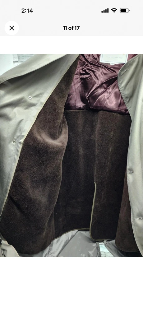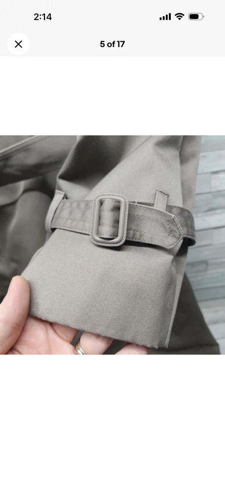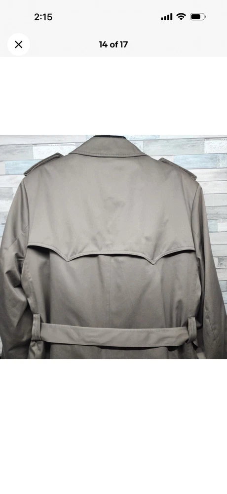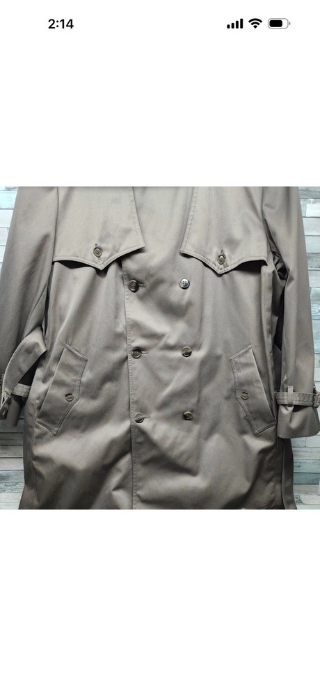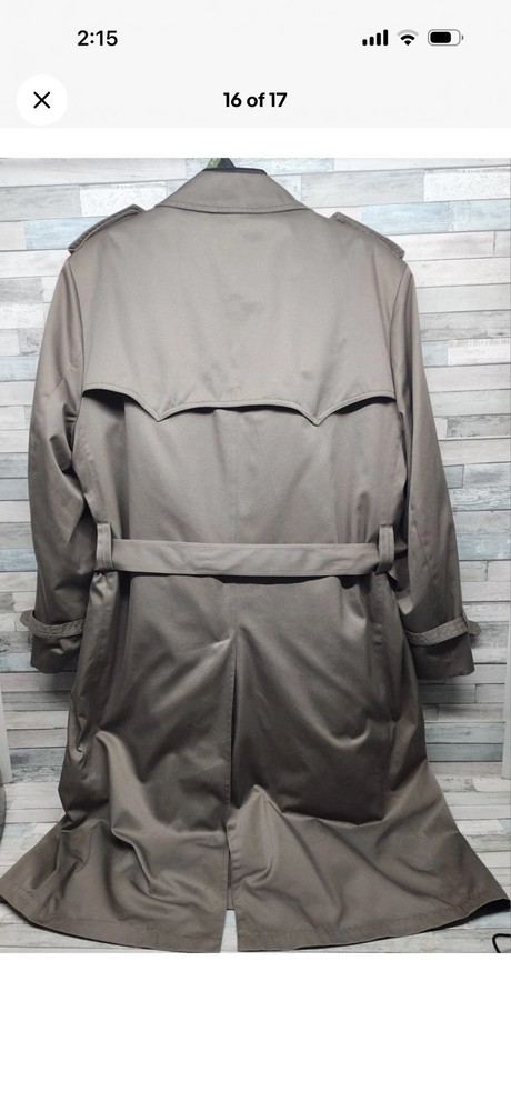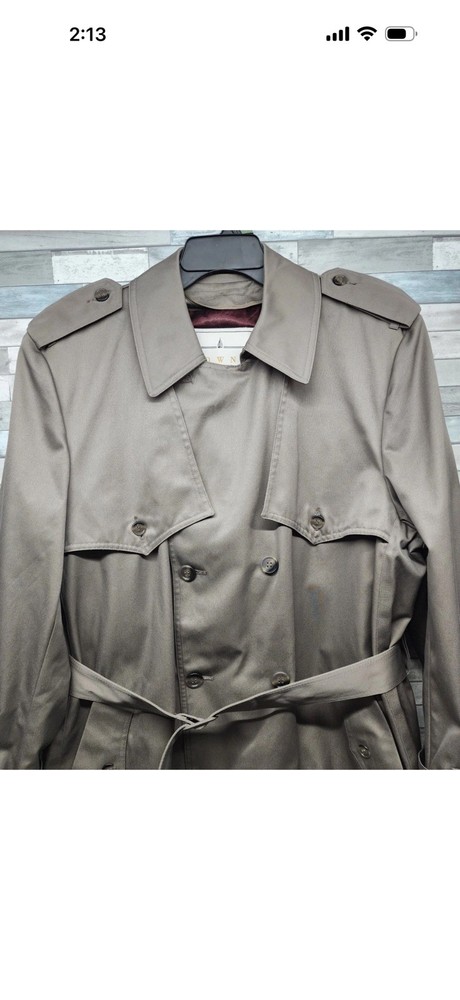 The Vintage London Fog Towne Trench Coat in size 44 Long is a classic men's coat perfect for a business occasion. Made from polyester with a canvas fabric type, this double-breasted trench coat features a belted closure, button accents, and a point collar. It is lightweight with a warmth weight of 400, making it ideal for winter. The gray color and solid pattern give it a timeless look, while the brand Towne by London Fog adds a touch of quality. Designed for regular fit, this trench coat exudes a sense of sophistication and style.