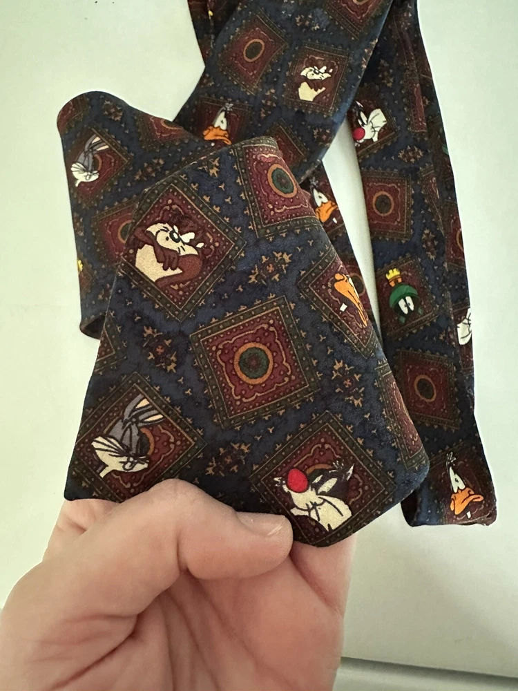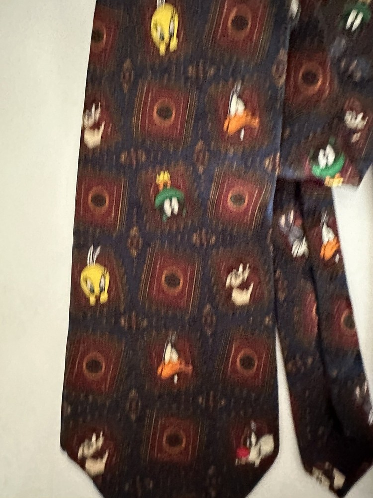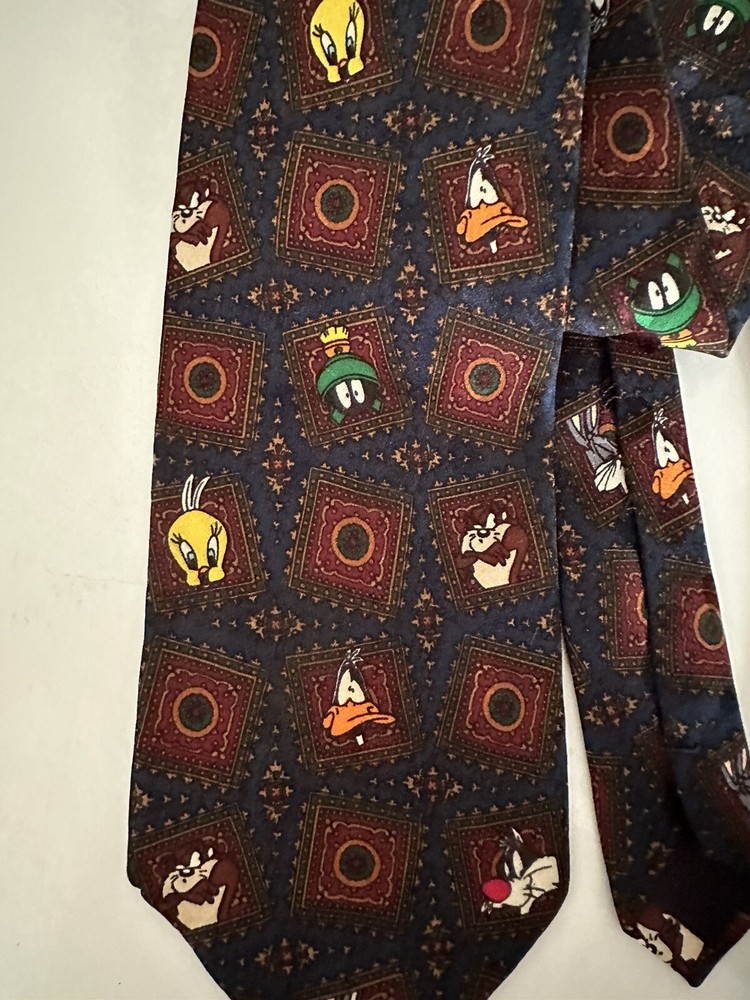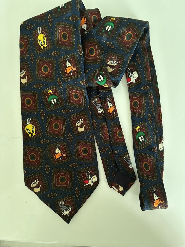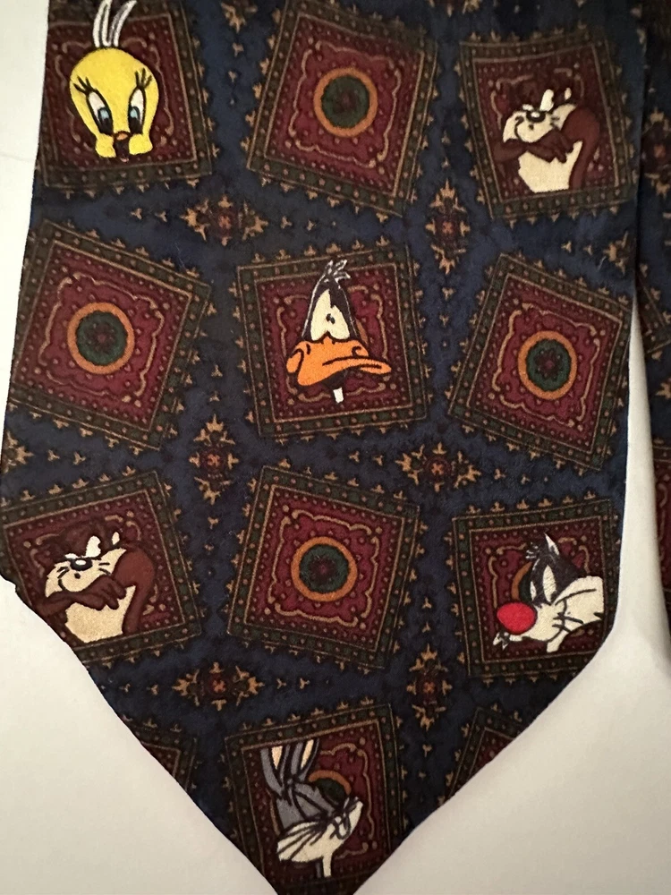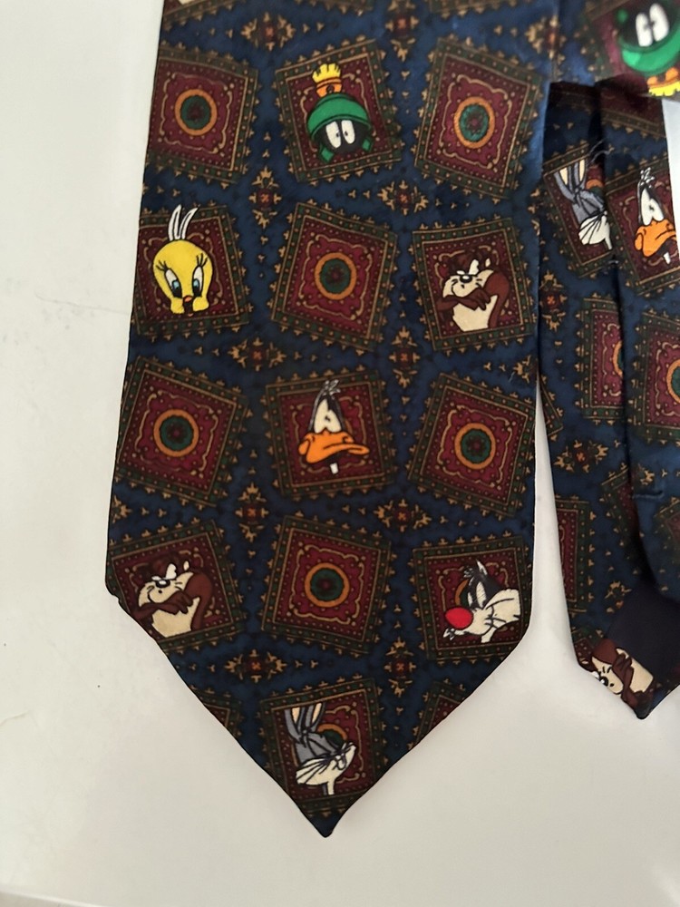 See photos for condition. Tag on back is off on one side. Add a touch of nostalgia to your outfit with this vintage Looney Tunes neck tie. The blue, red, and orange geometric pattern features the beloved characters Daffy Tweety and Taz. Perfect for any Looney Tunes fan, this tie is sure to make a statement. Made for men, this tie is a great addition to any wardrobe. The multicolor design is perfect for adding a pop of color to any suit or dress shirt. Whether you're dressing up for a special occasion or just want to add some personality to your everyday look, this Looney Tunes neck tie is the perfect choice.
