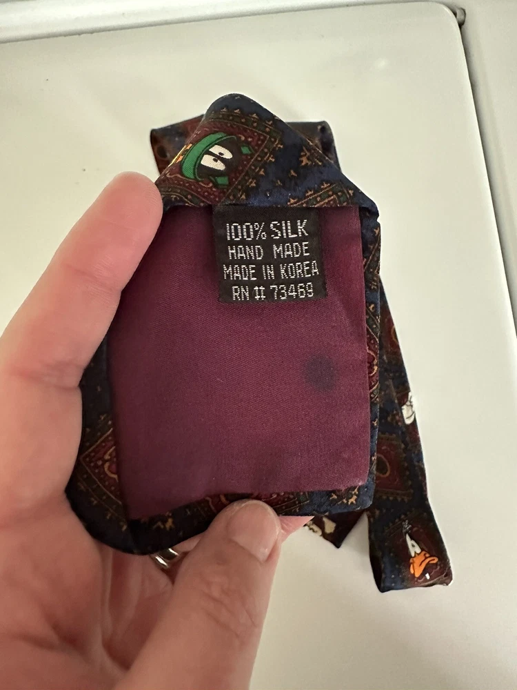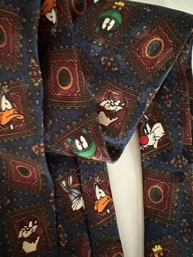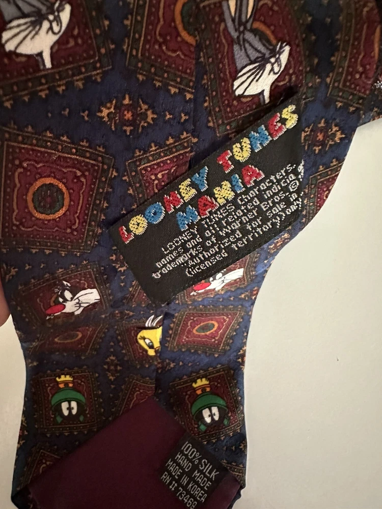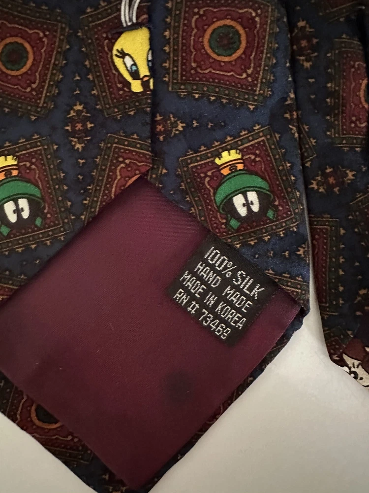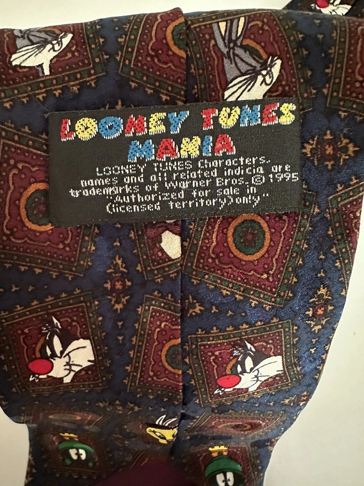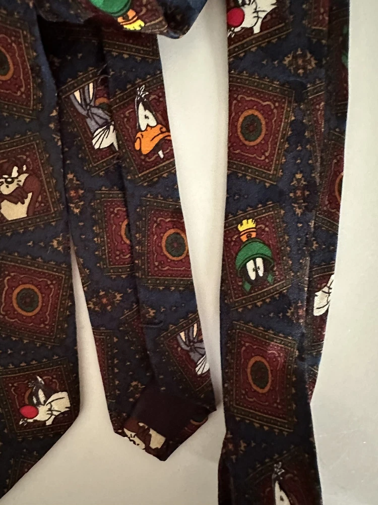 See photos for condition. Tag on back is off on one side. Add a touch of nostalgia to your outfit with this vintage Looney Tunes neck tie. The blue, red, and orange geometric pattern features the beloved characters Daffy Tweety and Taz. Perfect for any Looney Tunes fan, this tie is sure to make a statement. Made for men, this tie is a great addition to any wardrobe. The multicolor design is perfect for adding a pop of color to any suit or dress shirt. Whether you're dressing up for a special occasion or just want to add some personality to your everyday look, this Looney Tunes neck tie is the perfect choice.