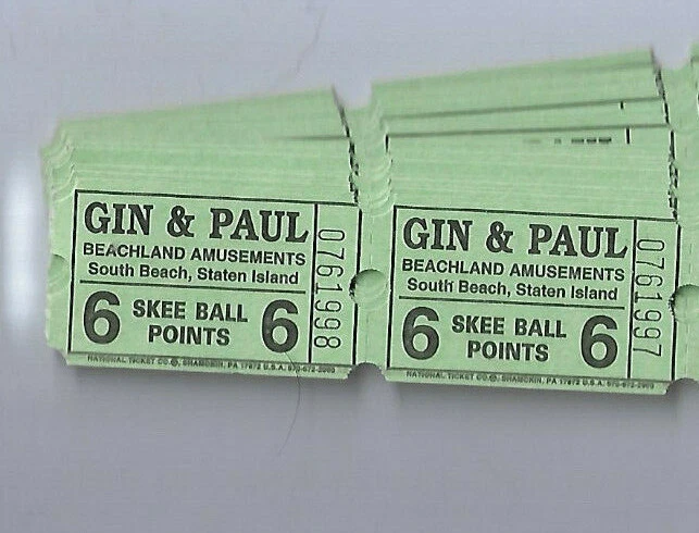 these tickets are in very good condition ......they are from Gin & Paul Beachland Amusements South Beach Staten Island New York ........defunct amusement arcade ..........100 tickets ...........numbers will vary because of the multiple quantities.............these are GUARANTEED OLD AND ORIGINAL ..........thanks for looking .................if you have the time please look at my other tickets and FUN items up right now on ebay NO INTERNATIONAL SHIPPING ...............U S SHIPPING ONLY ...................NO EXCEPTIONS