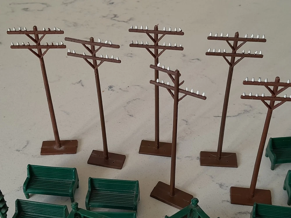 Enhance your model train layout with this vintage lot of HO scale 1:87 trackside signs, poles, and benches. These train accessories are perfect for adding a realistic touch to your miniature railroad scene. The assorted brands of these items provide variety and ensure authenticity. Made for HO gauge trains, these trackside signs are a great addition to any model railroad enthusiast's collection. The lot includes a range of different signs, poles, and benches to choose from. Whether you're looking to add some flair to your layout or just need some extra accessories, this vintage lot is the perfect solution. See Pics for all conditions