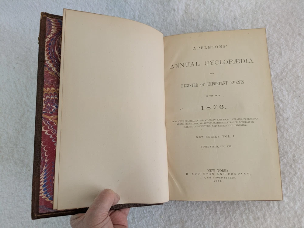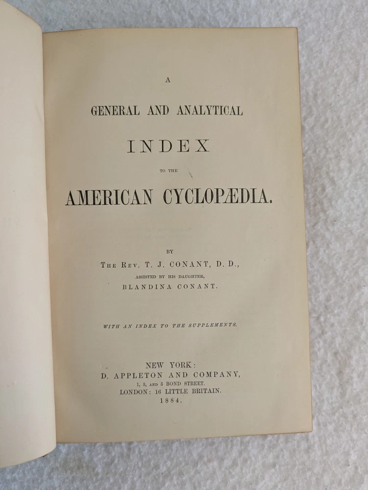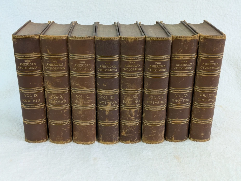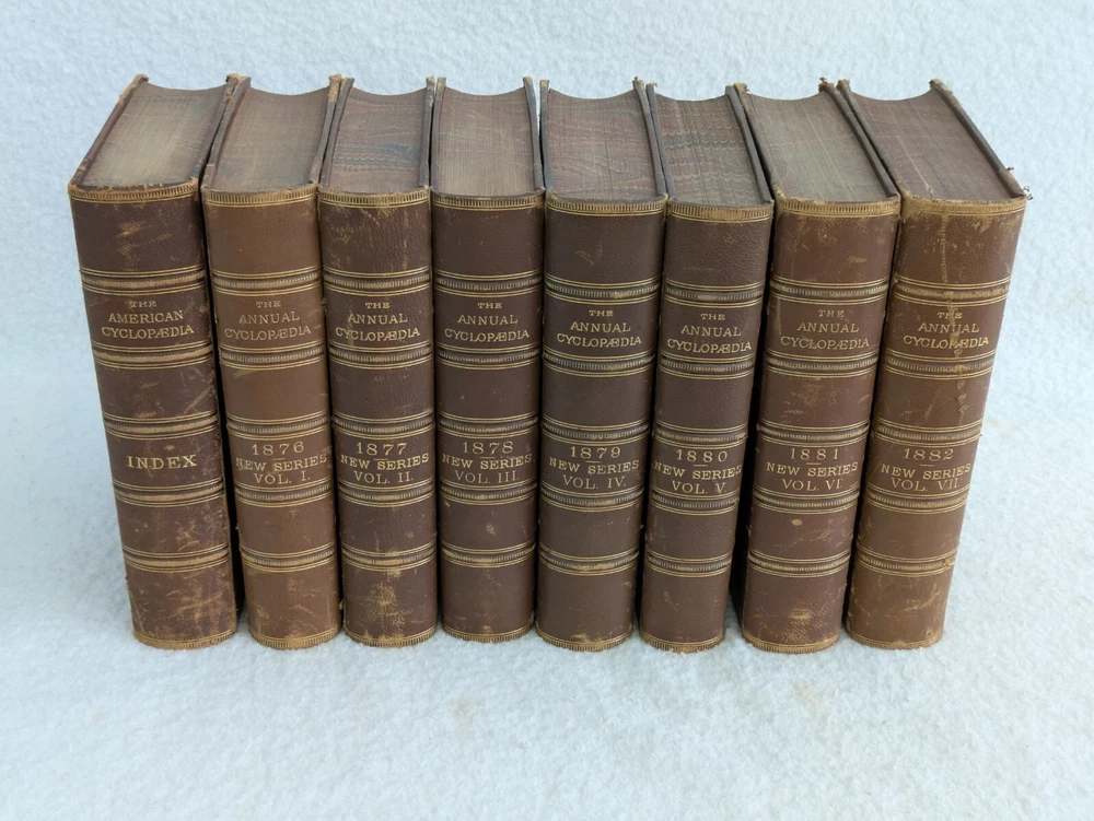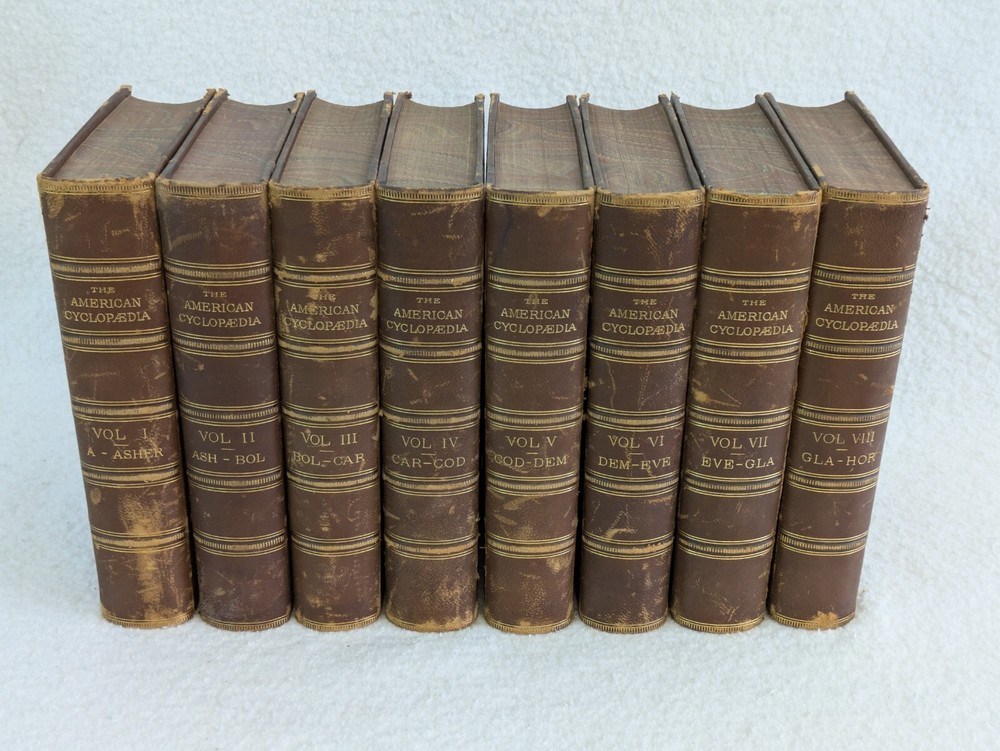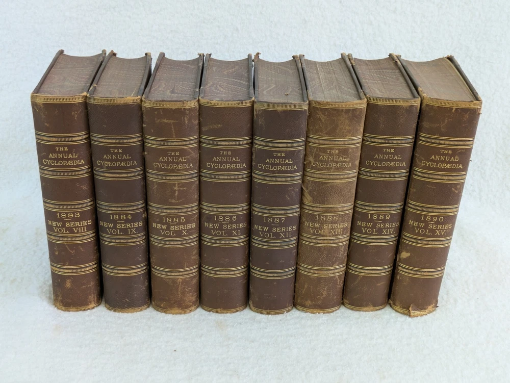 THE AMERICAN CYCLOPAEDIA Volumes 1-16 (1883) & Index (1884) ANNUAL CYCLOPAEDIA 1876-1890 In Uniform Bindings. New York: D. Appleton & Company Fold out Census Map is included with Annual Cyclopaedia of 1890. 32 Half Leather Hardcovers in Very Good Condition. Leather has wear at edges and a few scratches and tears. No markings but occasional newspaper clipping from the 1920s laid inside with matching encyclopedia entries. Only the Annual Cyclopaedia of 1890 has a weak joint in the binding in the front. Rest of the bindings are sound with no defects. Map has a few small tears at the folds. Please examine photos for details. Condition: We strive to describe and photograph the condition of every item as accurately as possible. Photos are of the actual item that is being sold. Please examine the photos carefully for any condition details and possible flaws. Best Offers: We consider all offers in relation to current market values. We try to respond almost immediately to most offers. Most of our counteroffers are firm but we are open to bargaining. Shipping: We combine shipping. All of our orders are packed carefully to prevent damage during shipment. We ship most of our items within 24 hours. International Shipping: All international orders are shipped via Ebay's International Shipping Program. Contact Us: We are available 7 days a week and are happy to answer any questions you may have.