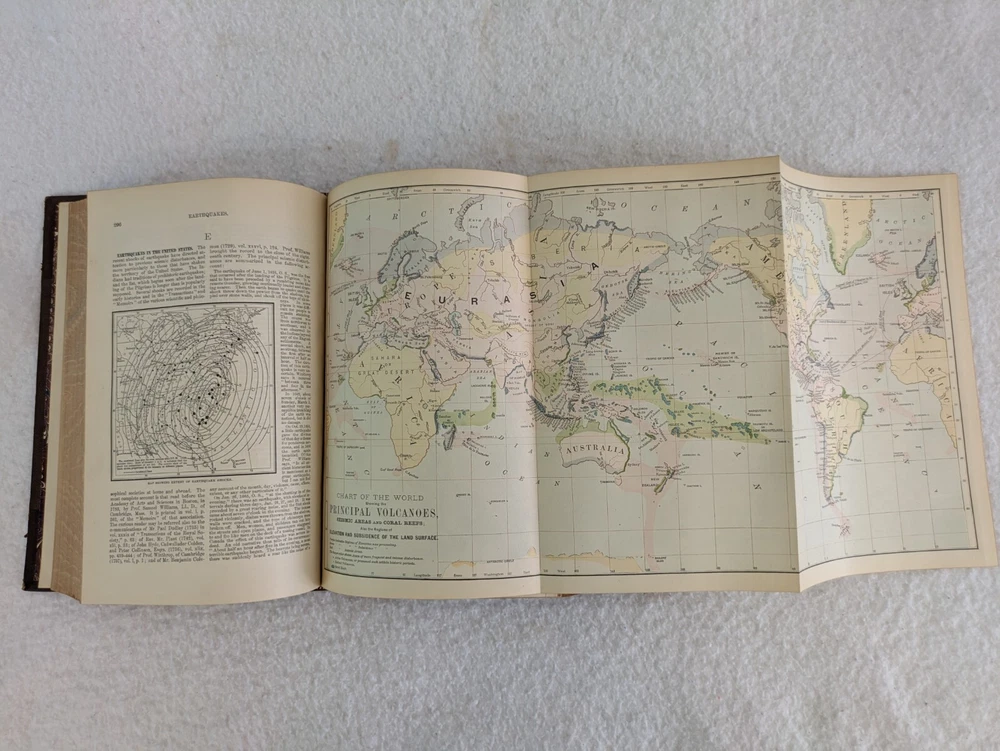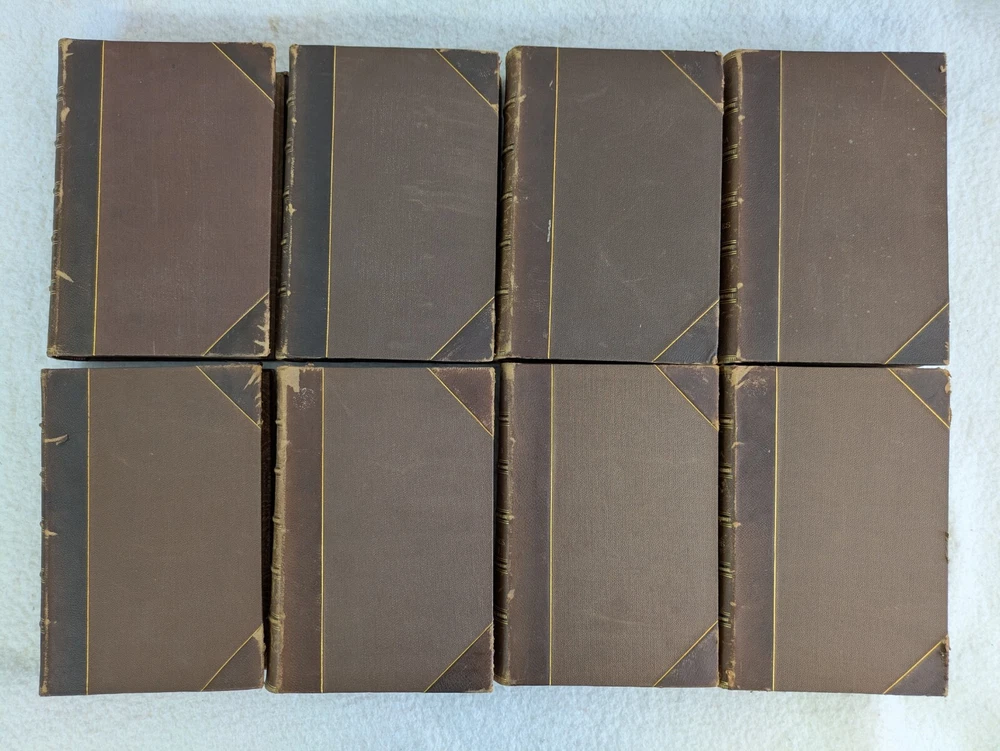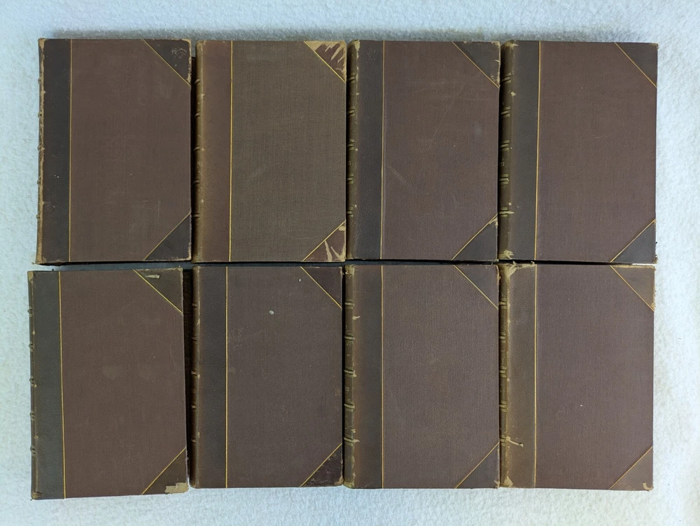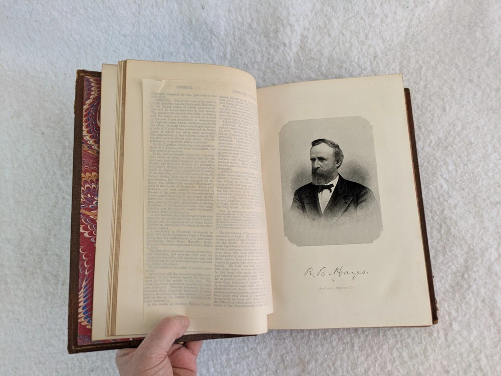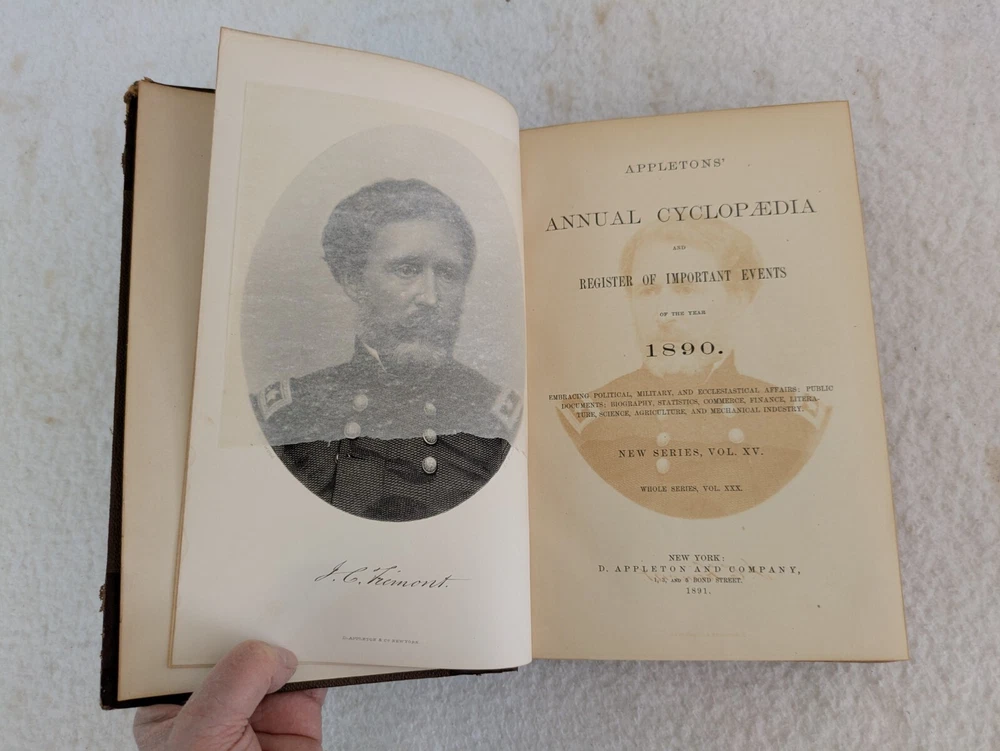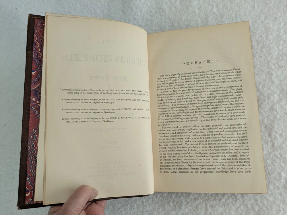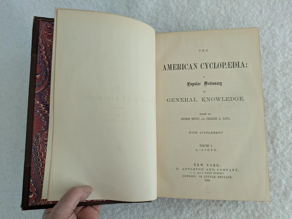 THE AMERICAN CYCLOPAEDIA Volumes 1-16 (1883) & Index (1884) ANNUAL CYCLOPAEDIA 1876-1890 In Uniform Bindings. New York: D. Appleton & Company Fold out Census Map is included with Annual Cyclopaedia of 1890. 32 Half Leather Hardcovers in Very Good Condition. Leather has wear at edges and a few scratches and tears. No markings but occasional newspaper clipping from the 1920s laid inside with matching encyclopedia entries. Only the Annual Cyclopaedia of 1890 has a weak joint in the binding in the front. Rest of the bindings are sound with no defects. Map has a few small tears at the folds. Please examine photos for details. Condition: We strive to describe and photograph the condition of every item as accurately as possible. Photos are of the actual item that is being sold. Please examine the photos carefully for any condition details and possible flaws. Best Offers: We consider all offers in relation to current market values. We try to respond almost immediately to most offers. Most of our counteroffers are firm but we are open to bargaining. Shipping: We combine shipping. All of our orders are packed carefully to prevent damage during shipment. We ship most of our items within 24 hours. International Shipping: All international orders are shipped via Ebay's International Shipping Program. Contact Us: We are available 7 days a week and are happy to answer any questions you may have.