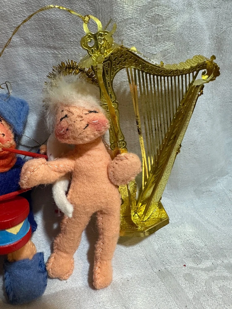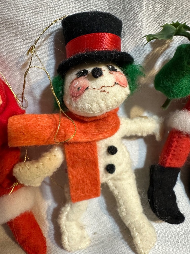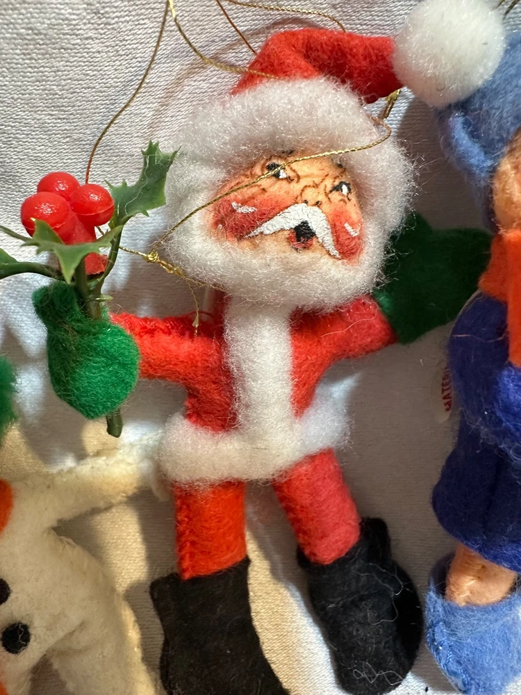 This vintage lot of 6 Annalee felt ornaments from 1987-1997 is a charming addition to any Christmas decor collection. Handmade in Hampshire, United States, these small-sized ornaments feature a multicolor design with a Santa Claus theme. Each ornament measures between 3-4 inches in height and all 6 weighs approximately 3 ounces, making them easy to hang and display. This nostalgic set is a delightful reminder of holiday traditions from the late 20th century. Snowman-1987 Drummer Boy-1987 Elf-1995 Angel-1995 Santa-1996 Mrs.Claus-1997 Does not come an original packaging