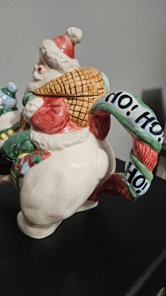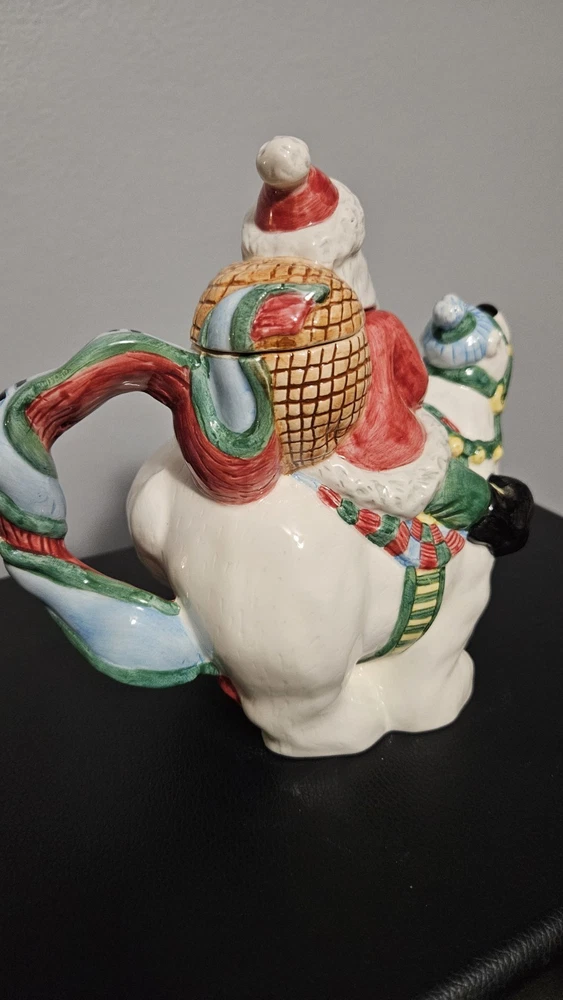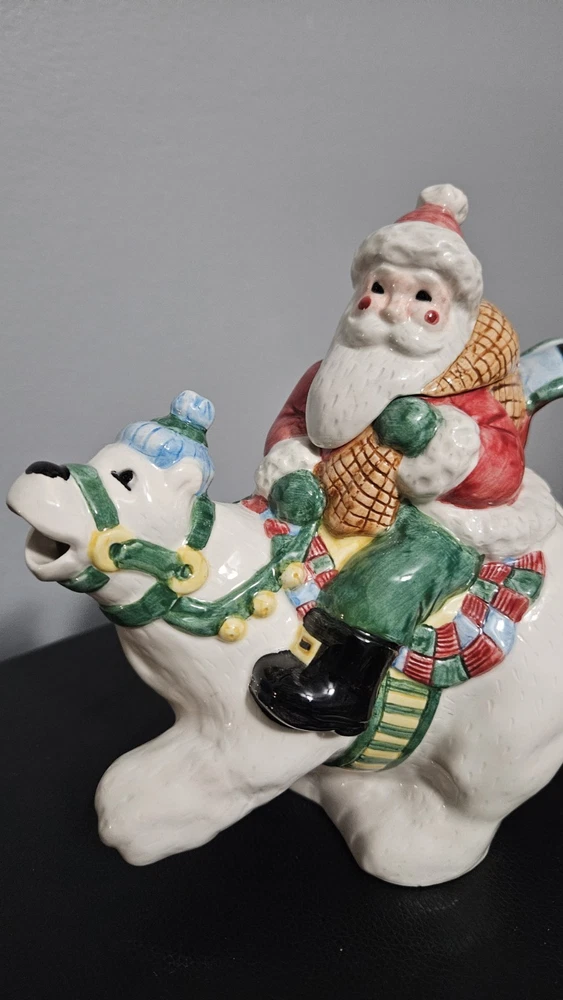 The Vintage Lotus 1995 Santa On Bear Teapot is a ceramic decoration manufactured in China during the 1990s. This unique piece features a multicolor design with Santa Claus sitting on top of a bear, making it a charming addition to Christmas decorations. The Lotus brand adds a touch of nostalgia to any holiday collection, especially for those who appreciate vintage Christmas decor from the 1990s.