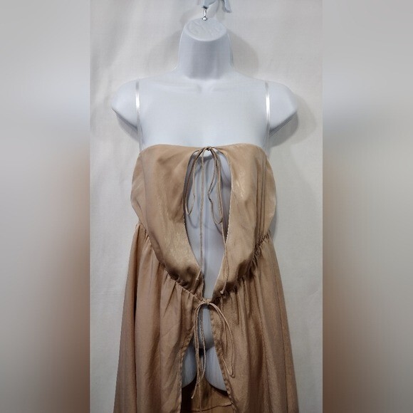 Chic strapless design. Flowy and stylish. Perfect for any occasion. Features Tan Front ties Strapless Coverup Beach Vacation Coastal Minimalist Vintage Great Pre-Loved Condition SIZE XS Measurements Pit to Pit: 15" Length: 36" Waist: Rise: Inseam: Length: Please check to be sure of fit Smoke Free Pets Free Please feel free to contact me for any questions or offer Bundle Discounts Offered Fast Shipping *50221-5793-25*