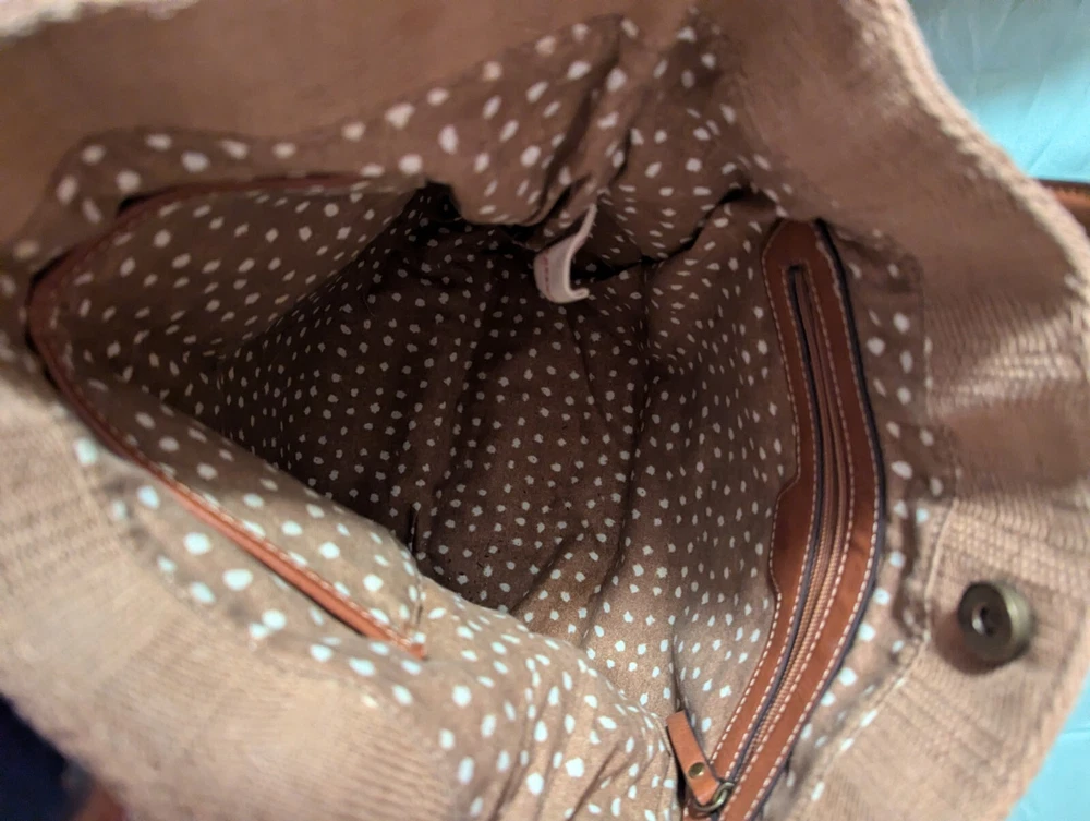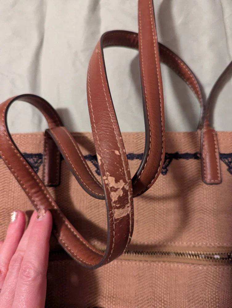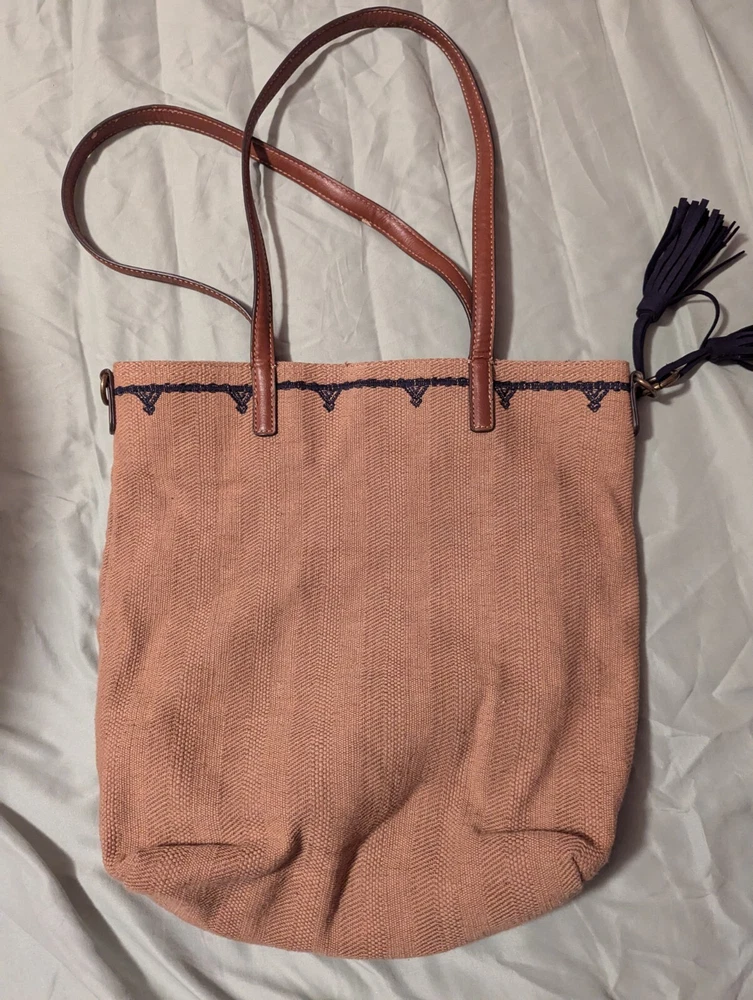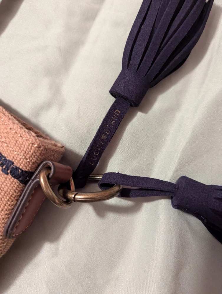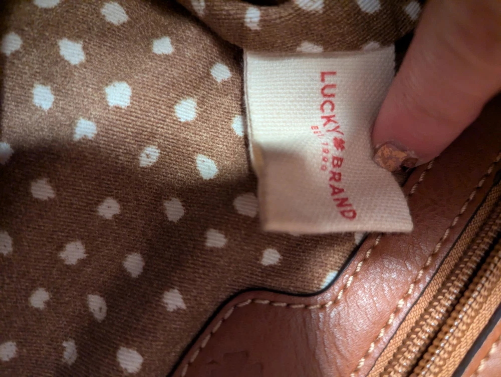 This is a vintage Lucky Brand tote. It is pre-owned but in fair to good condition. The signs of wear are mainly on the leather as pictured. Other than that it is a very nice bag with lots of space.It is medium in size. Comes with detachable tassel with Lucky Brand stamp. Please ask questions because no returns. Ships only in the United States. Thanks for looking!