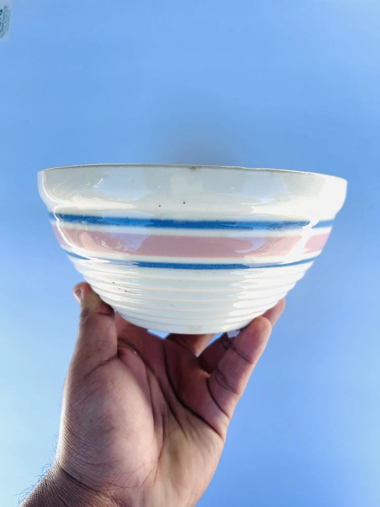 This vintage MCCOY pottery bowl is a beautiful addition to any collection. The charming pink and blue stripes add a touch of country charm to your home decor. Made of high-quality ceramic, this bowl is sturdy and durable. The round shape makes it perfect for serving your favorite soups, salads, or snacks. The McCoy brand is renowned for its quality and attention to detail. This bowl was crafted with a pottery production technique in the United States in the 1940s. Its vintage style and timeless design make it a wonderful gift for collectors and enthusiasts alike. Add this unique piece to your kitchen or dining room and enjoy its beauty and functionality for years to come. 2.14.24