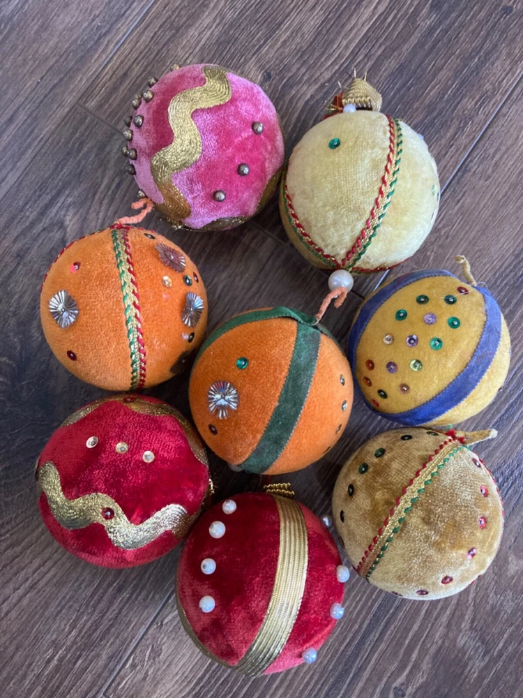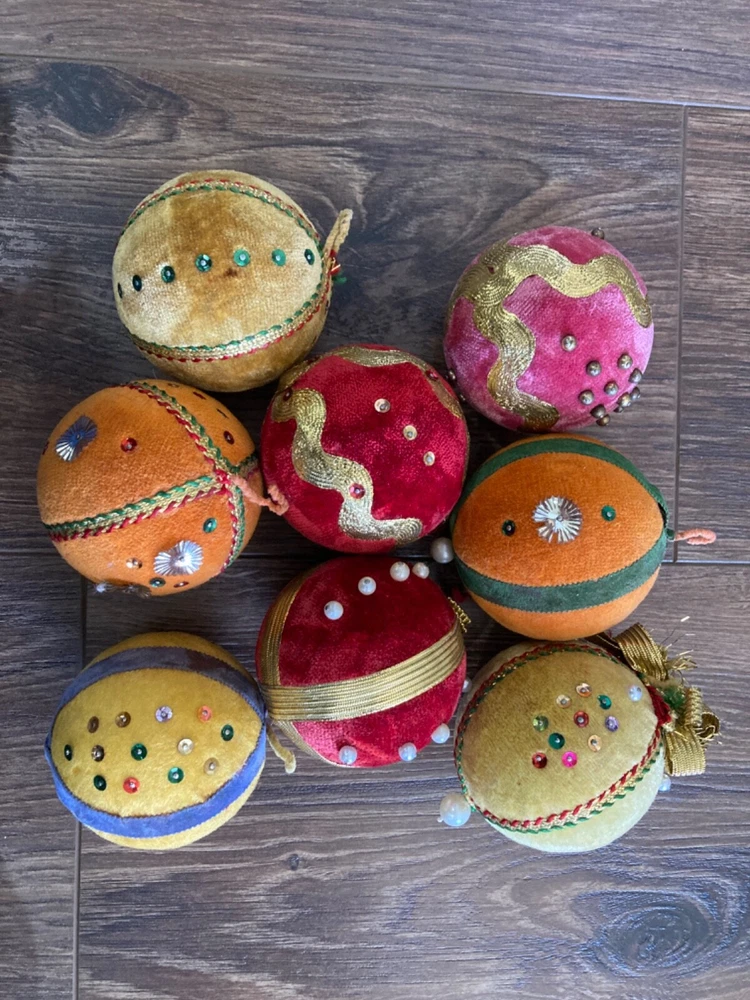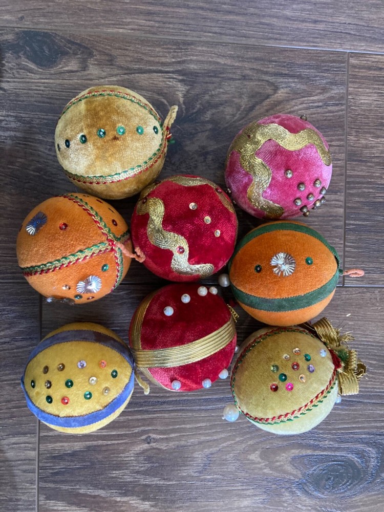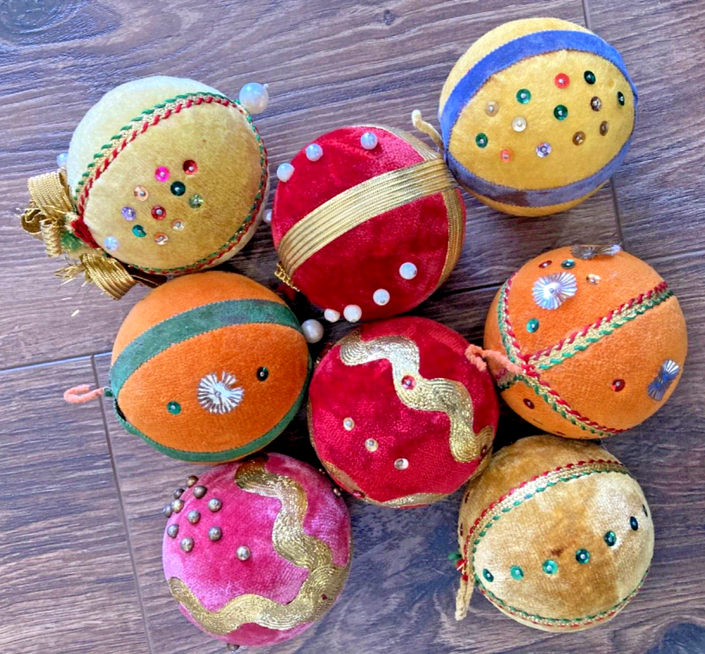 HOOKED-ON-VINTAGE IS SO PLEASED TO OFFER THESE REAL VINTAGE MCM MID-CENTURY MODERN CHRISTMAS ORNAMENTS BALLS. BOTH ARE VERY COLLECTIBLE. VTG LOT 8 CHRISTMAS TREE ORNAMENT BEADED PUSH PIN SEQUIN VELVET 2-7/8” DIAM MERRY CHRISTMAS Y’ALL! SUPER FUN LOT OF VINTAGE CHRISTMAS ORNAMENTS. We have many, many of his Christmas ornaments to list, so please check back with us. Thank you so much for stopping by Hooked-On-Vintage. We appreciate it!