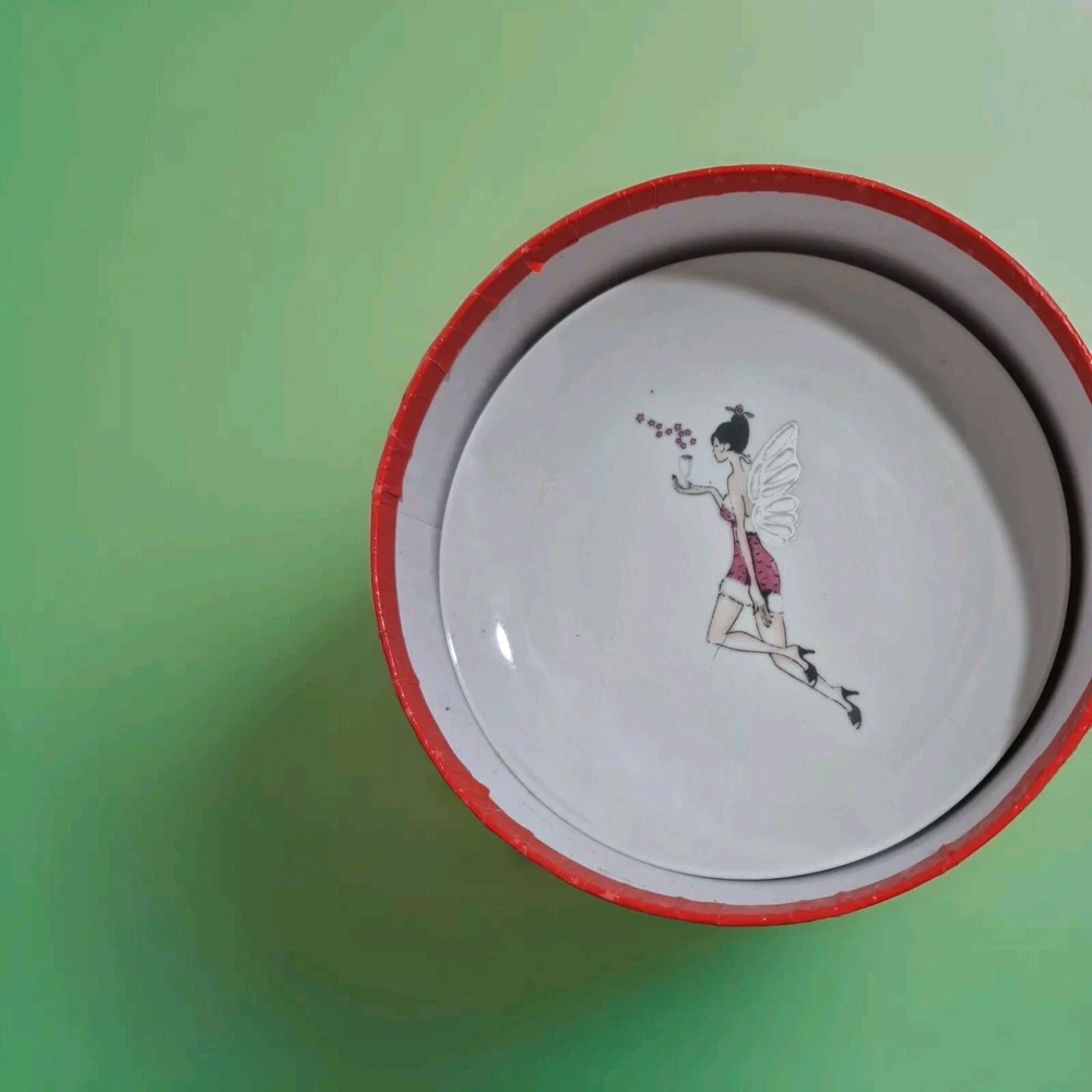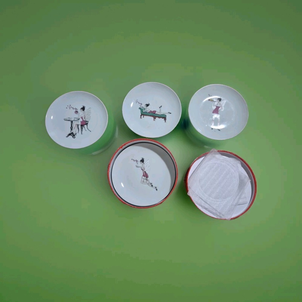 All plates are in good condition. This set of four porcelain plates features a charming fairy pattern with multi-pinks, black, green, and beige colors. The plates measure 7.25 inches in diameter and 1/2 inch in height, making them perfect for bread, butter, oil, and vinegar, or cake. The plates are in excellent condition and show no signs of wear and tear. They are hand wash only and come from a smoke-free and pet-free home.