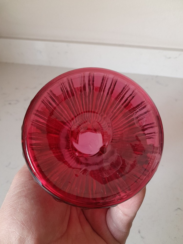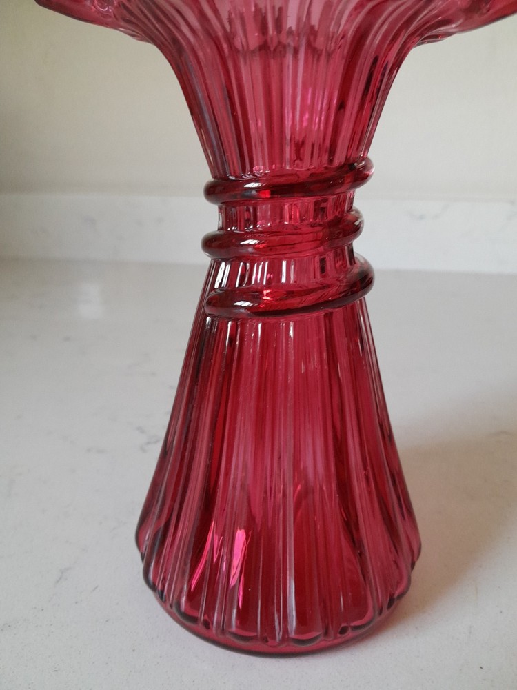 This is a vintage Mid-Century Modern Fenton art glass vase in cranberry red with a ruffled edge. The vase measures 7 1/4 inches in height and features a wheat pattern. It is made of glass in a studio crafted production style, typical of Fenton. This piece would be a stunning addition to any glassware collection, especially for those with a love for vintage art glass.