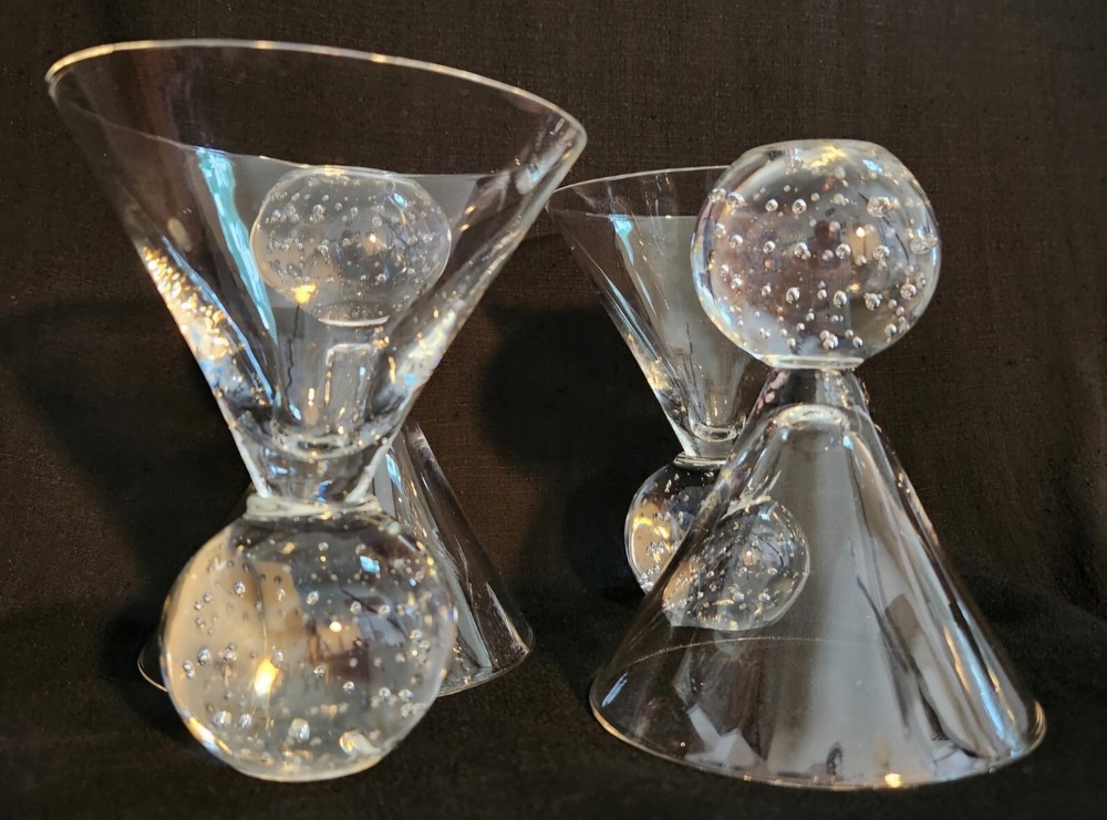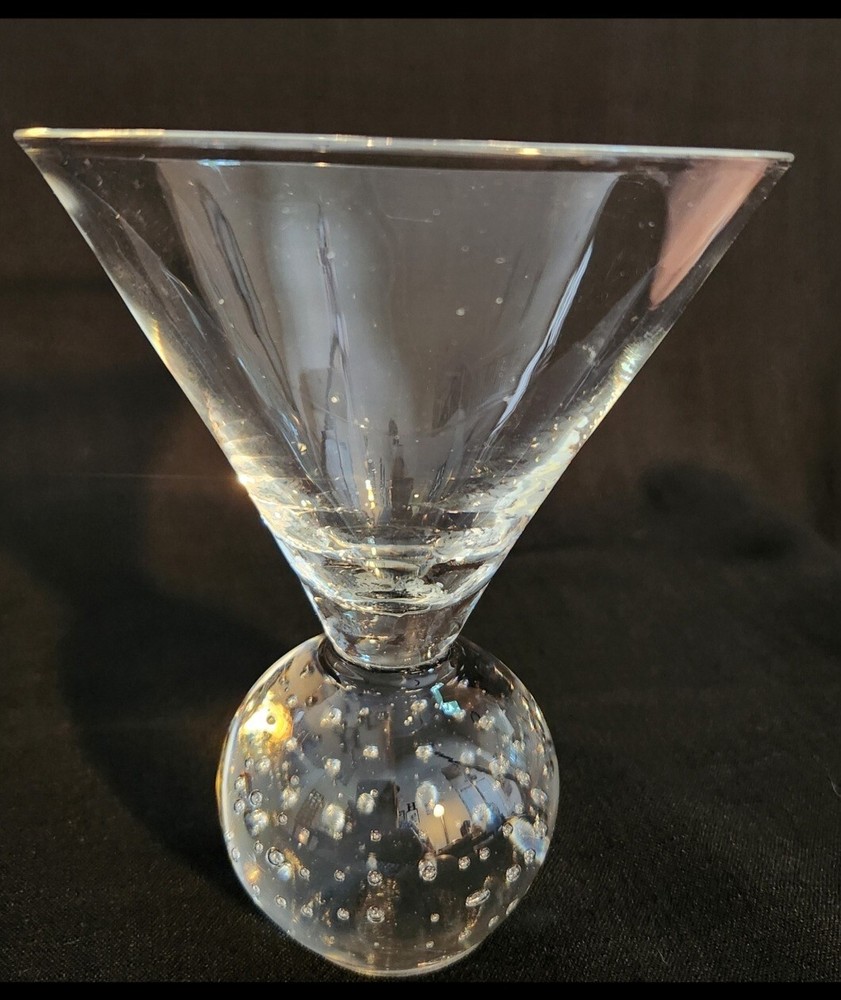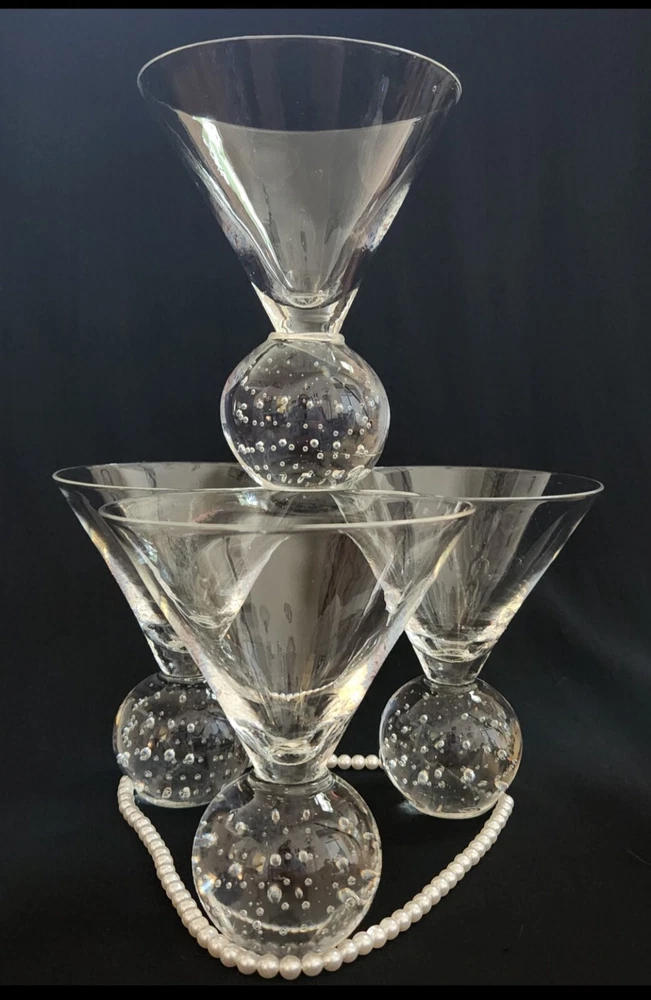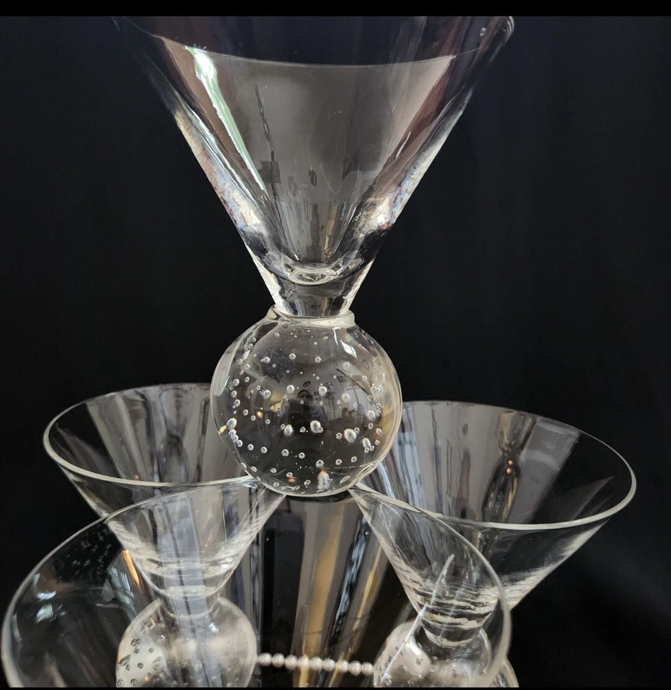 Elevate your cocktail game with these four hand-blown martini glasses. The round, clear glass is perfect for all occasions, and the mid-century modern style adds a touch of sophistication to any bar setup. The bubble ball stem design is both unique and functional, providing a stable grip for your drink and perfect for your retro bar. Crafted from high-quality glass, these martini glasses are durable and beautiful. The set includes four glasses, each measuring 5 inches in height and 4 inches in width. Whether you're hosting a party or just enjoying a drink at home, these glasses are a must-have for any cocktail lover. Pearls pictured not included.