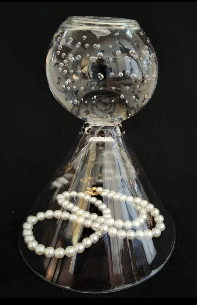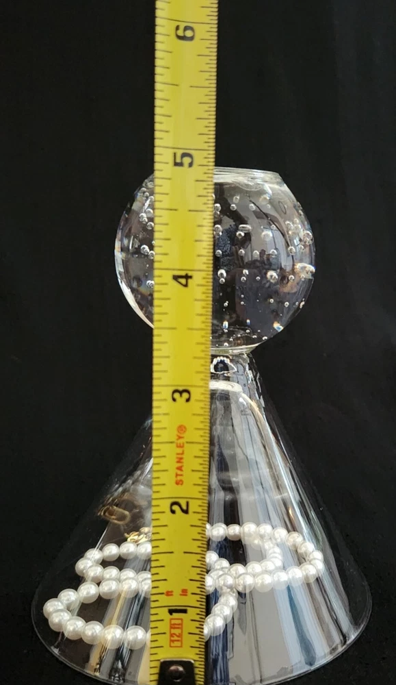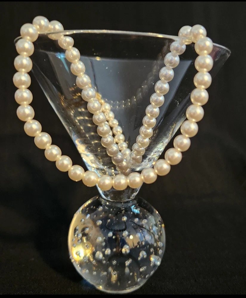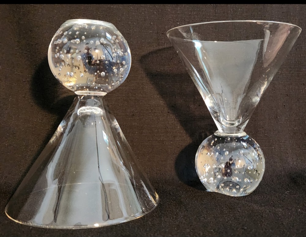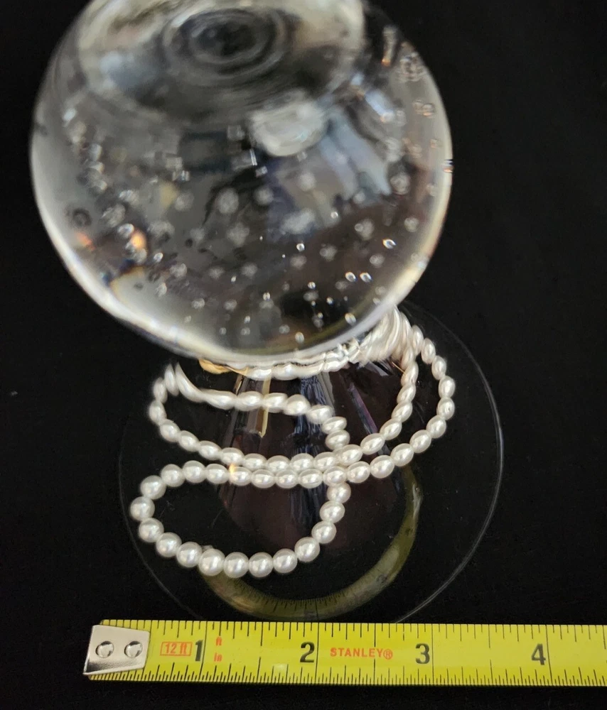 Elevate your cocktail game with these four hand-blown martini glasses. The round, clear glass is perfect for all occasions, and the mid-century modern style adds a touch of sophistication to any bar setup. The bubble ball stem design is both unique and functional, providing a stable grip for your drink and perfect for your retro bar. Crafted from high-quality glass, these martini glasses are durable and beautiful. The set includes four glasses, each measuring 5 inches in height and 4 inches in width. Whether you're hosting a party or just enjoying a drink at home, these glasses are a must-have for any cocktail lover. Pearls pictured not included.