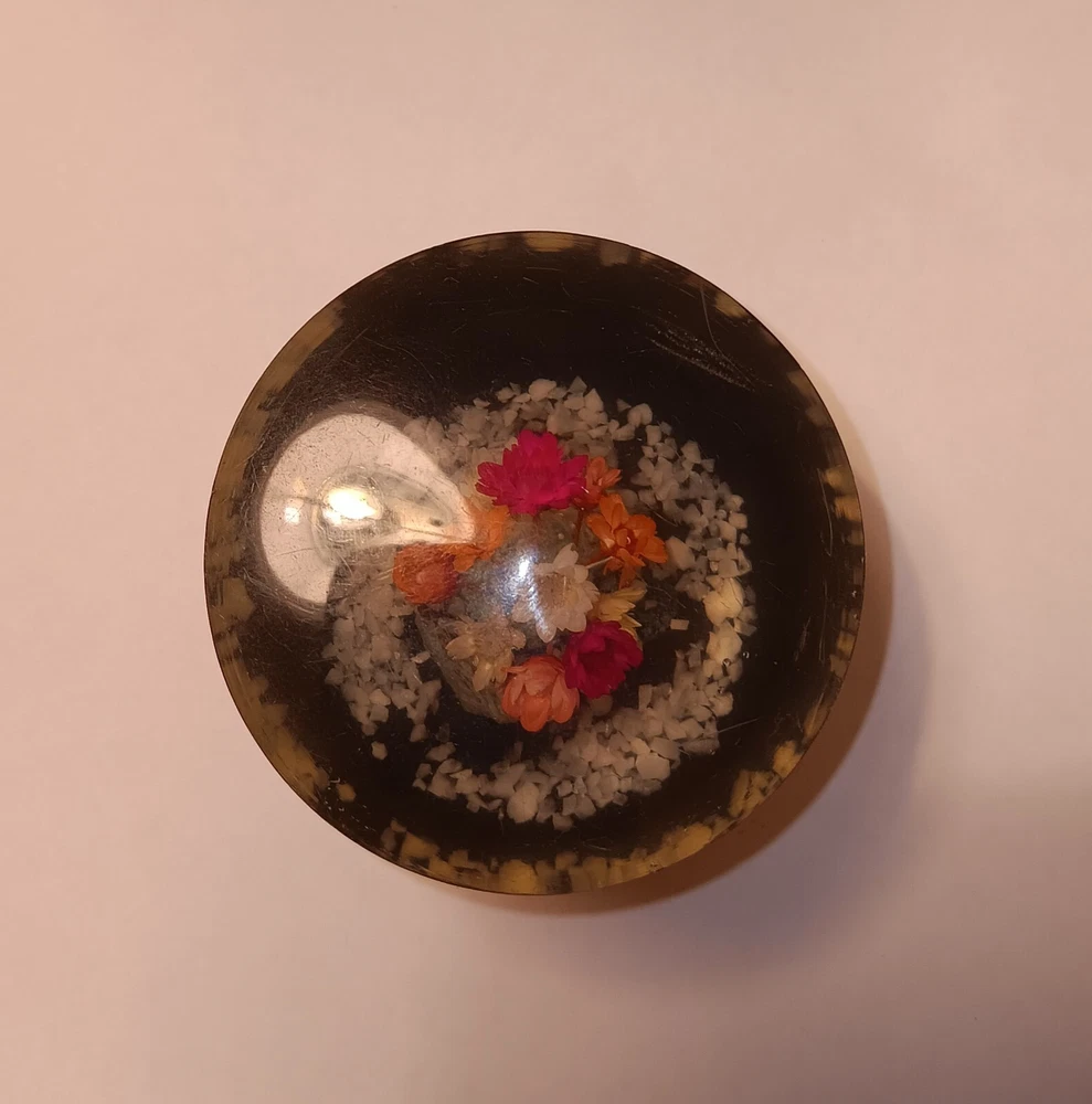 It's in good condition but has some wear on it. There is 1 small scratch on the top, and there are a couple of scratches on the side. It's made out of acrylic. It's 2.5 inches tall. I will pack it with care and will include tracking.