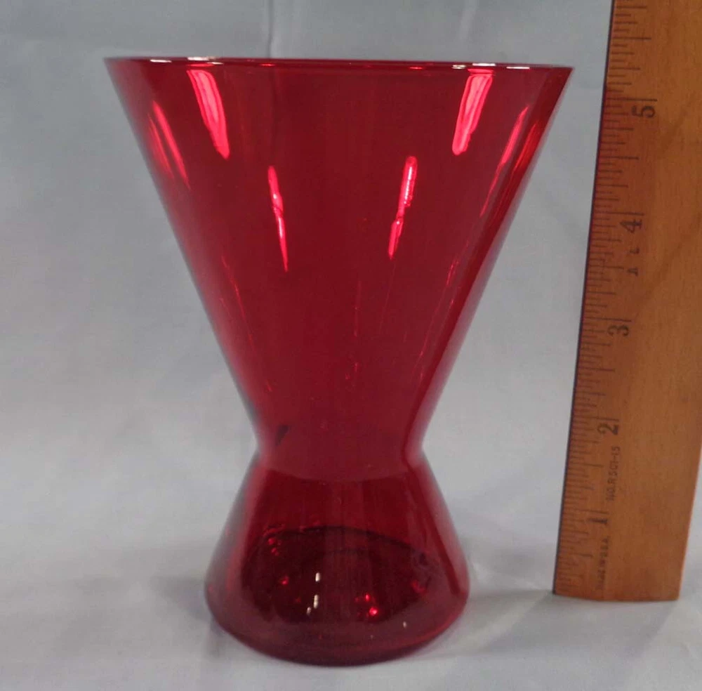 Vintage MCM Ruby Red Hour Glass Shape Tumbler 5-1/4" A vintage MCM ruby red hour glass shape tumbler. Measures approx. 5-1/4" tall and 4" wide. Excellent condition with no chips or cracks. If you have any questions, please let me know. Picture are of actual item being offered. Calculated shipping (w/delivery conf. tracking - 1 business day handling). 30 day return privilege on all items. *Image may change or be removed after listing ends.