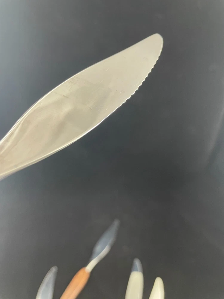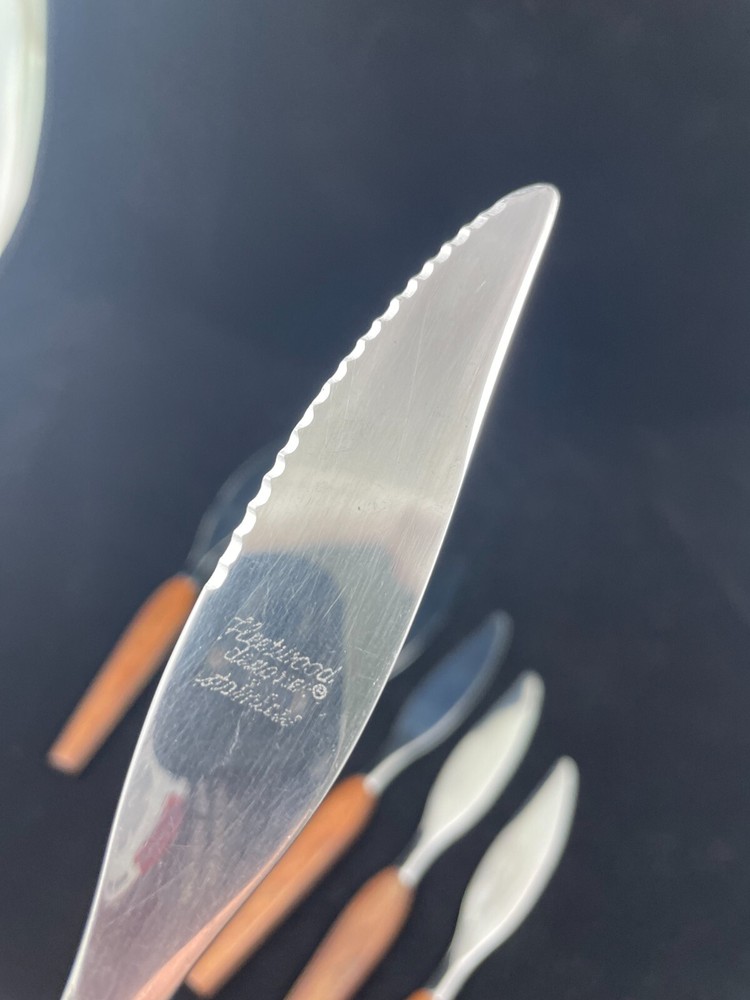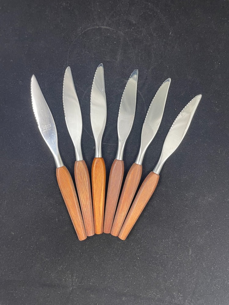 Vintage MCM Fleetwood Designer Teak Handle Stainless Steel Steak Knives Set of 6 Add a touch of vintage MCM charm to your dining experience with this set of 6 Fleetwood designer teak handle steak knives. Crafted from high-quality stainless steel. For inventory - Montana 11:11 Box